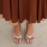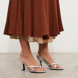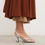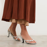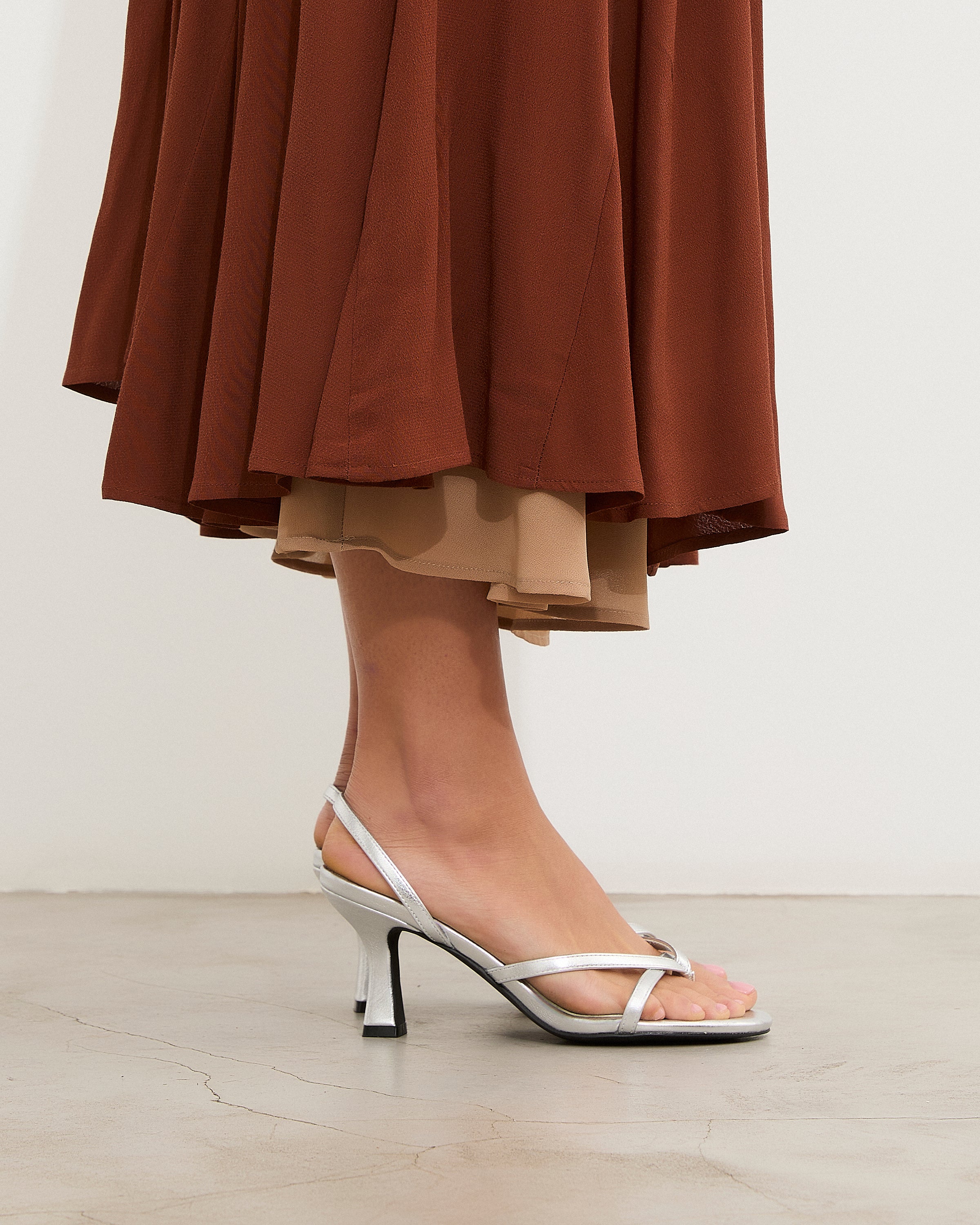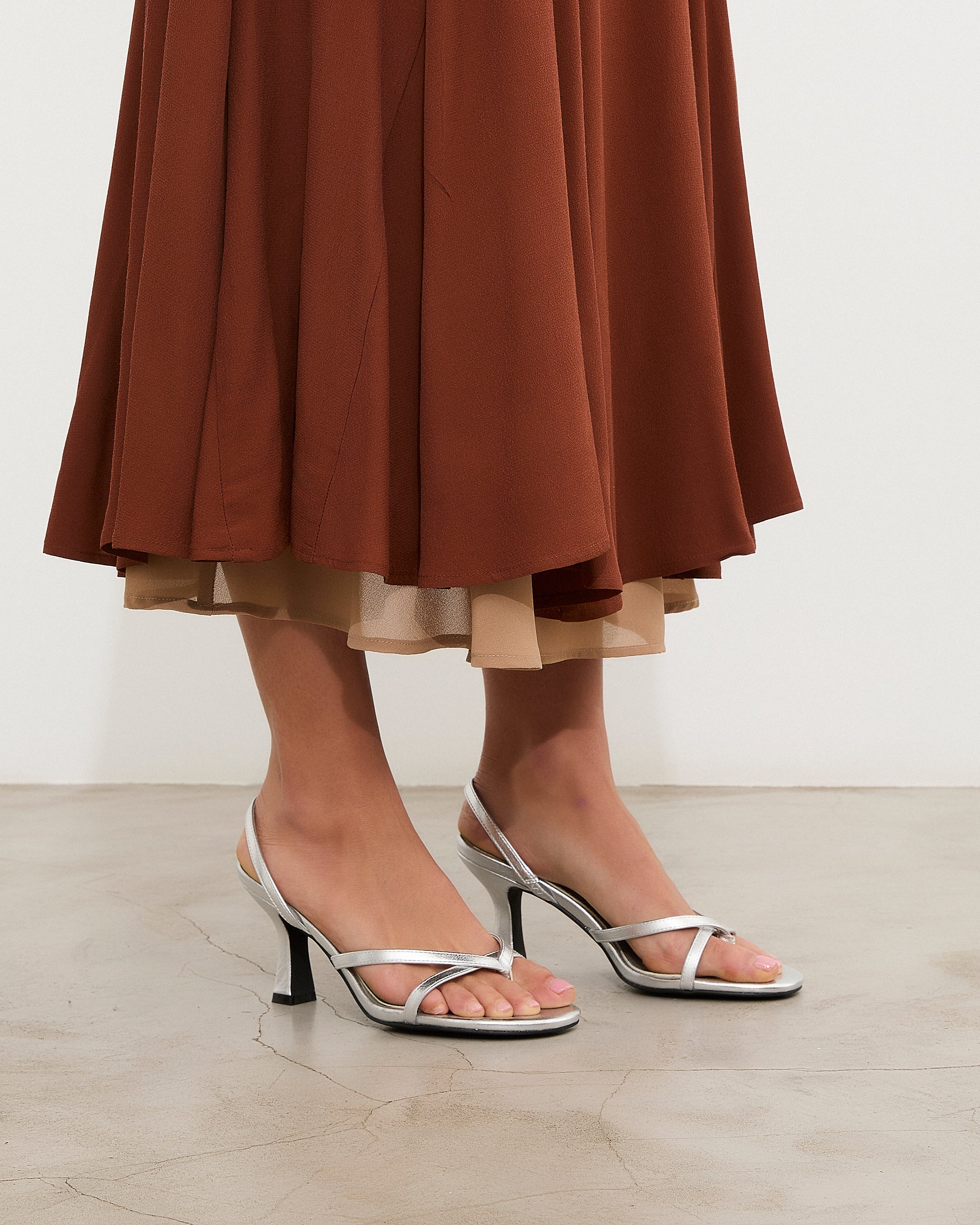 Sandalia de tacón con puntera redondeada en color plata. Tiras finas cruzadas en la parte delantera. Tira trasera con elástico para ajuste en talón. Tacón tipo aguja de base ancha.