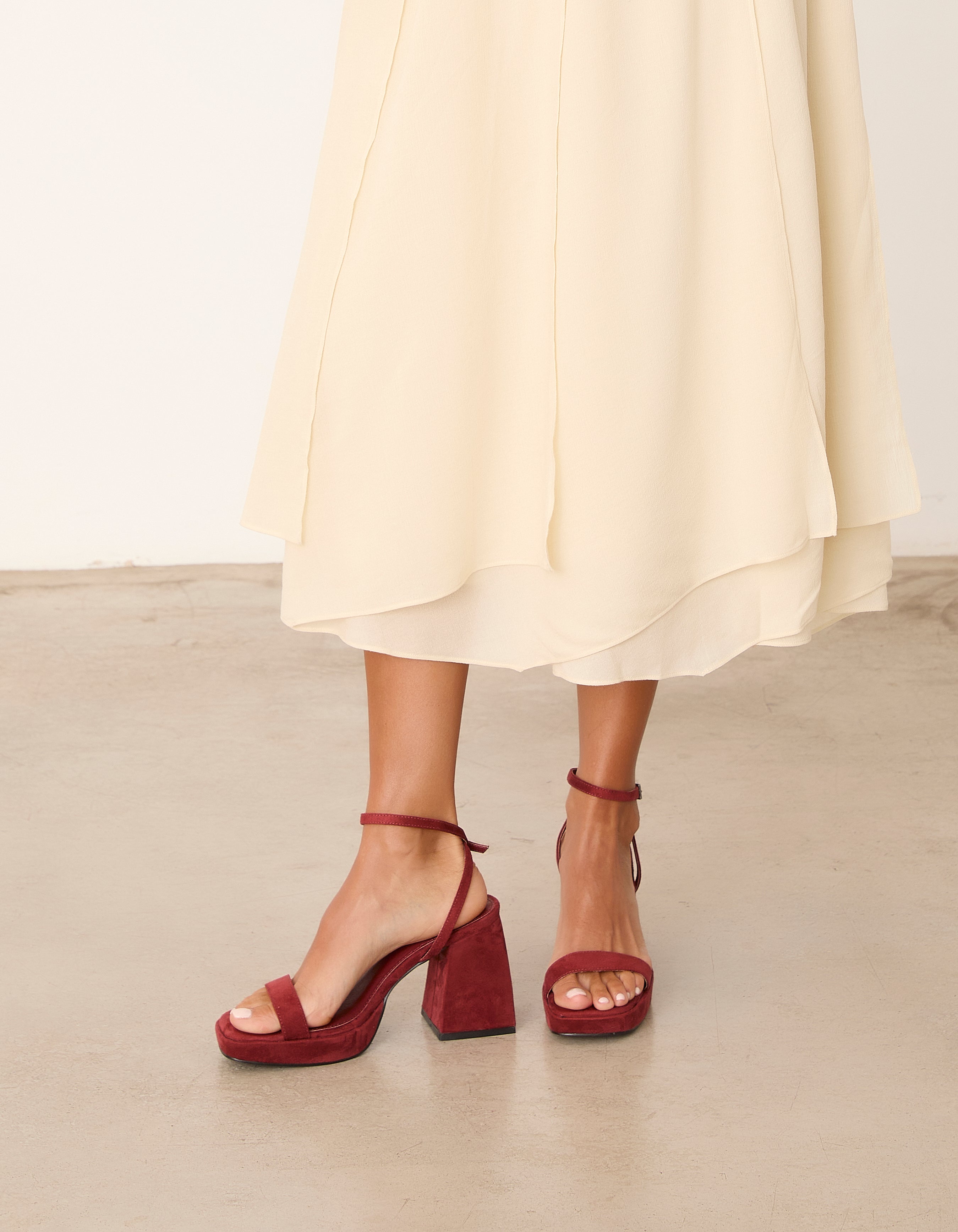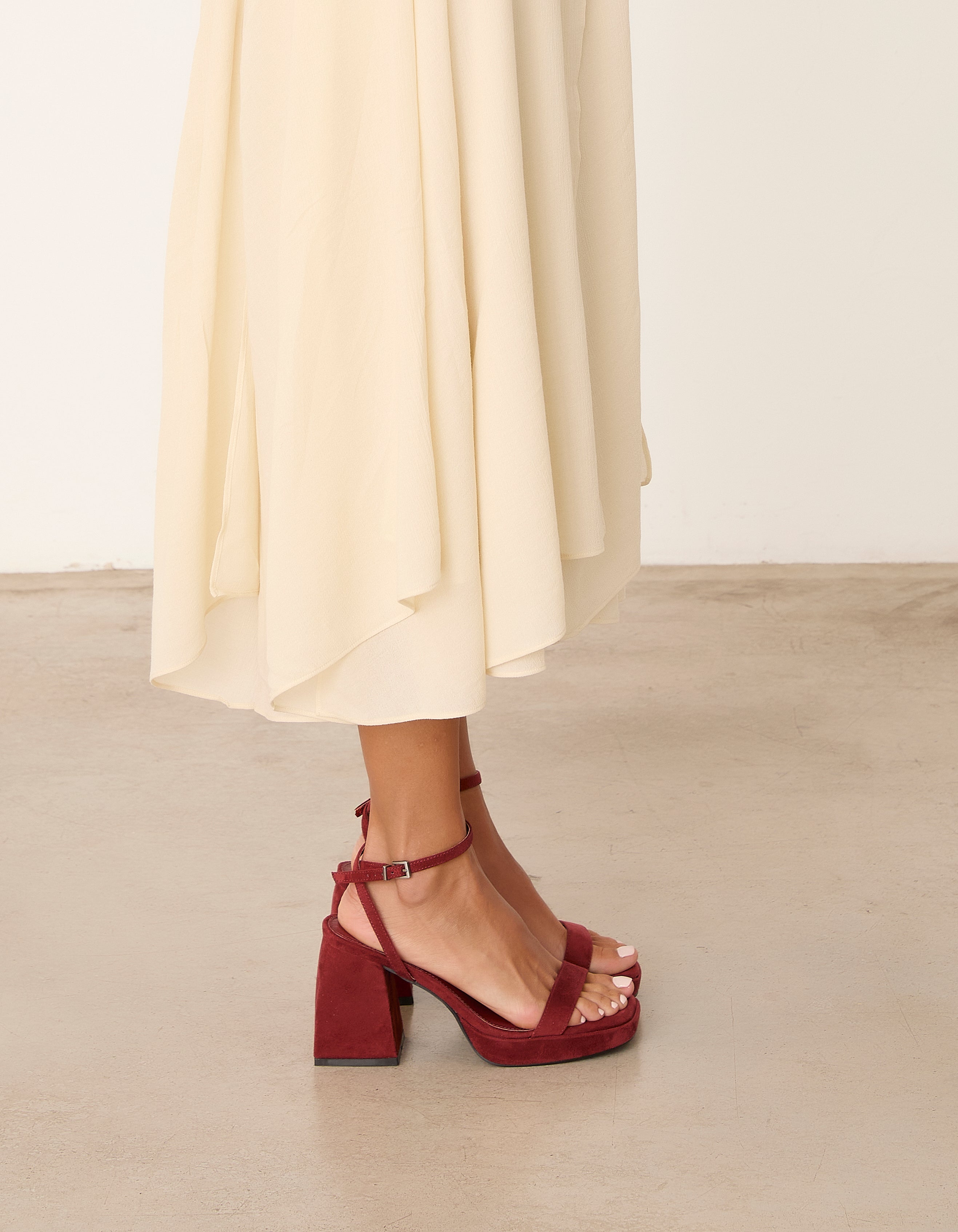Sandalia de tacón con plataforma de puntera geometrica en color teja.Tira ancha delantera y pulsera a tobillo. Tacón alto ancho.