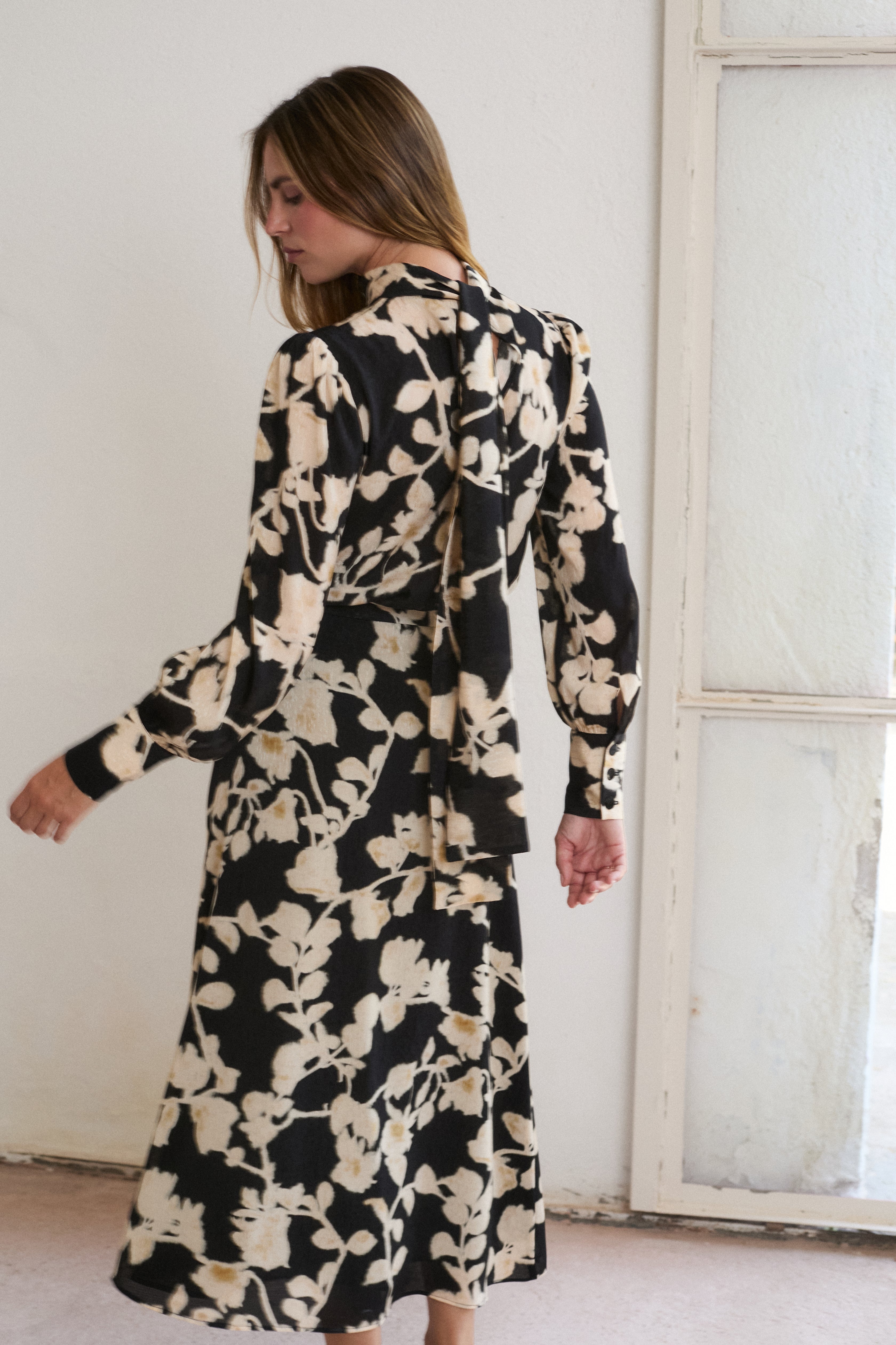 Blusa manga larga con cierre de lazada a la espalda. Print de motivos florales en tonos off white y negro.