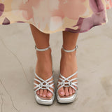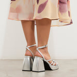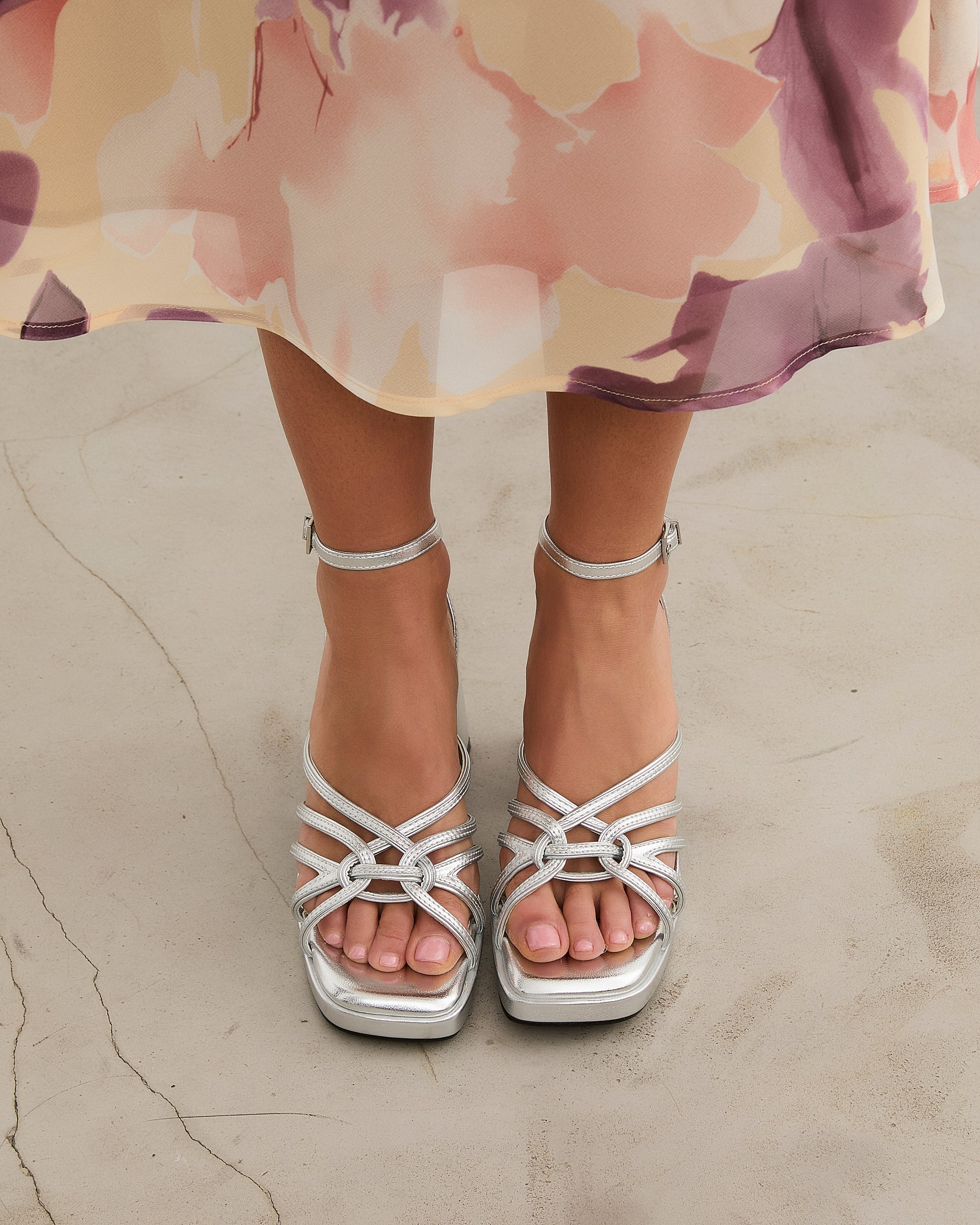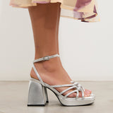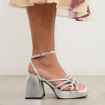Sandalia de tacón color plata. Parte delantera abierta cuadrada con plataforma y varias tiras delanteras. Cierre de pulsera al tobillo con hebilla metálica.