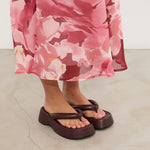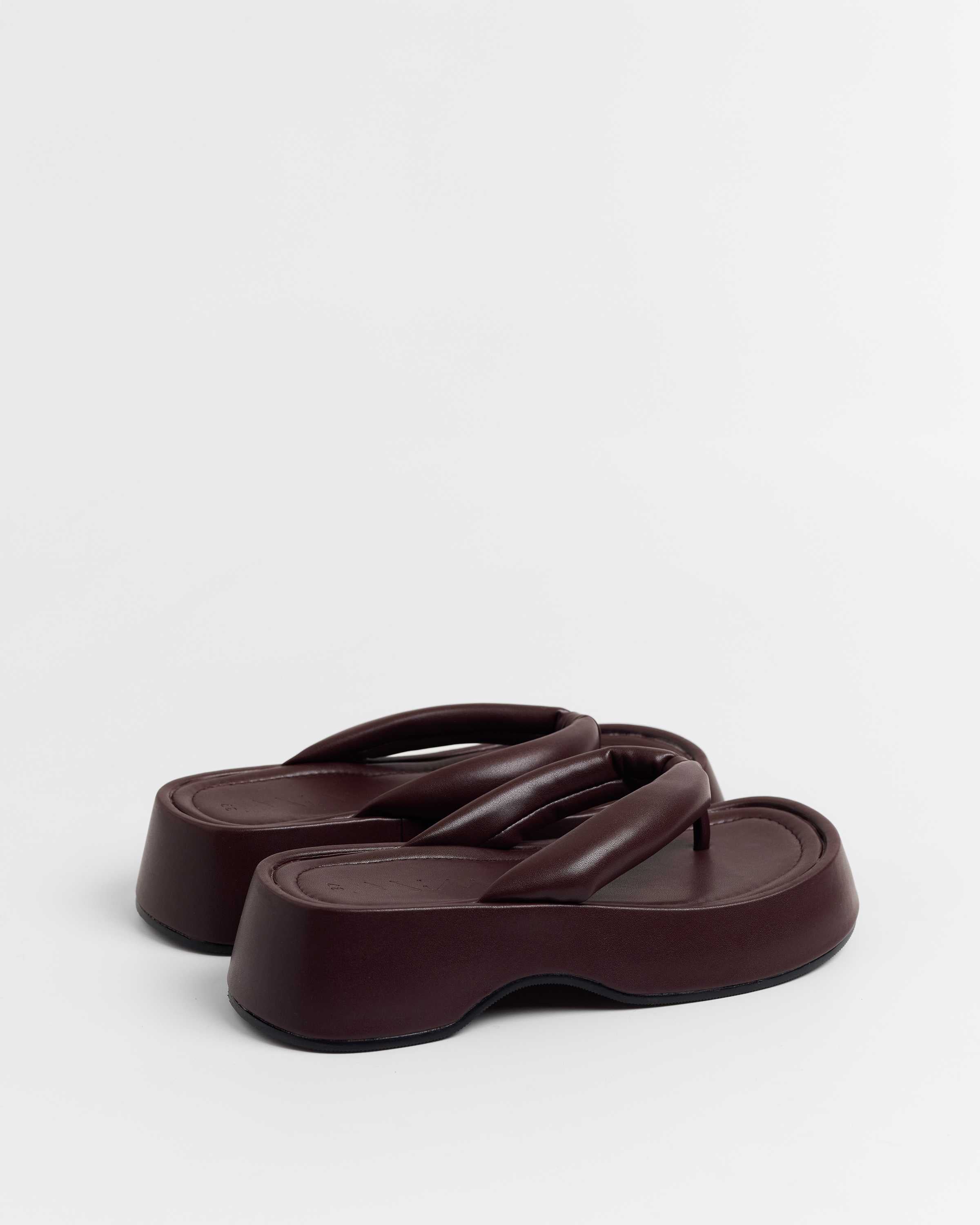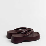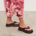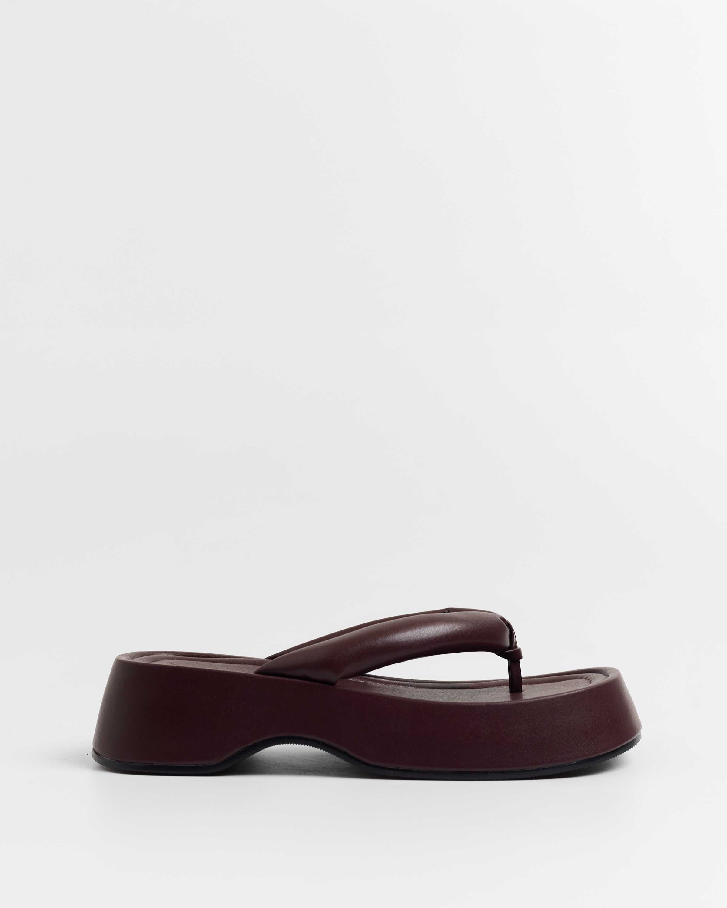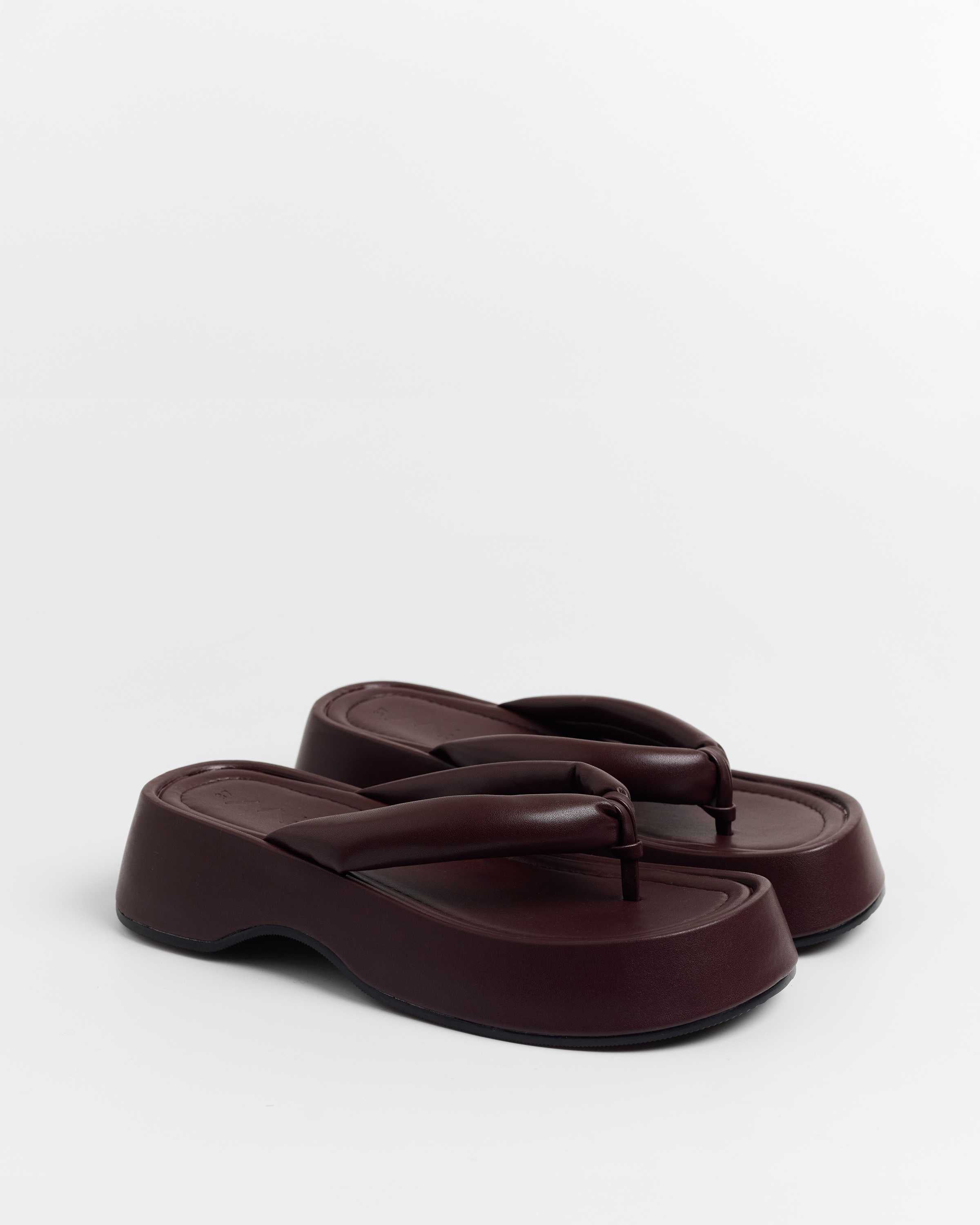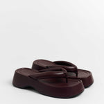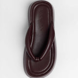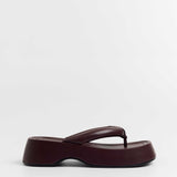 Sandalia plana de dedo con plataforma en color burdeos. Dos maxi tiras acolchadas.