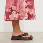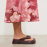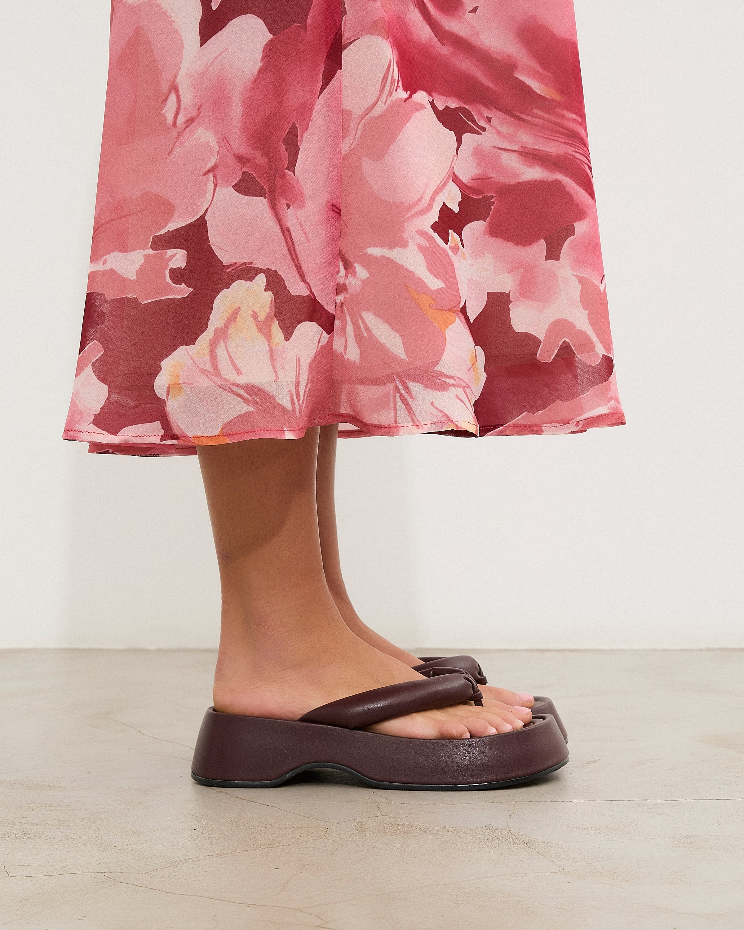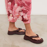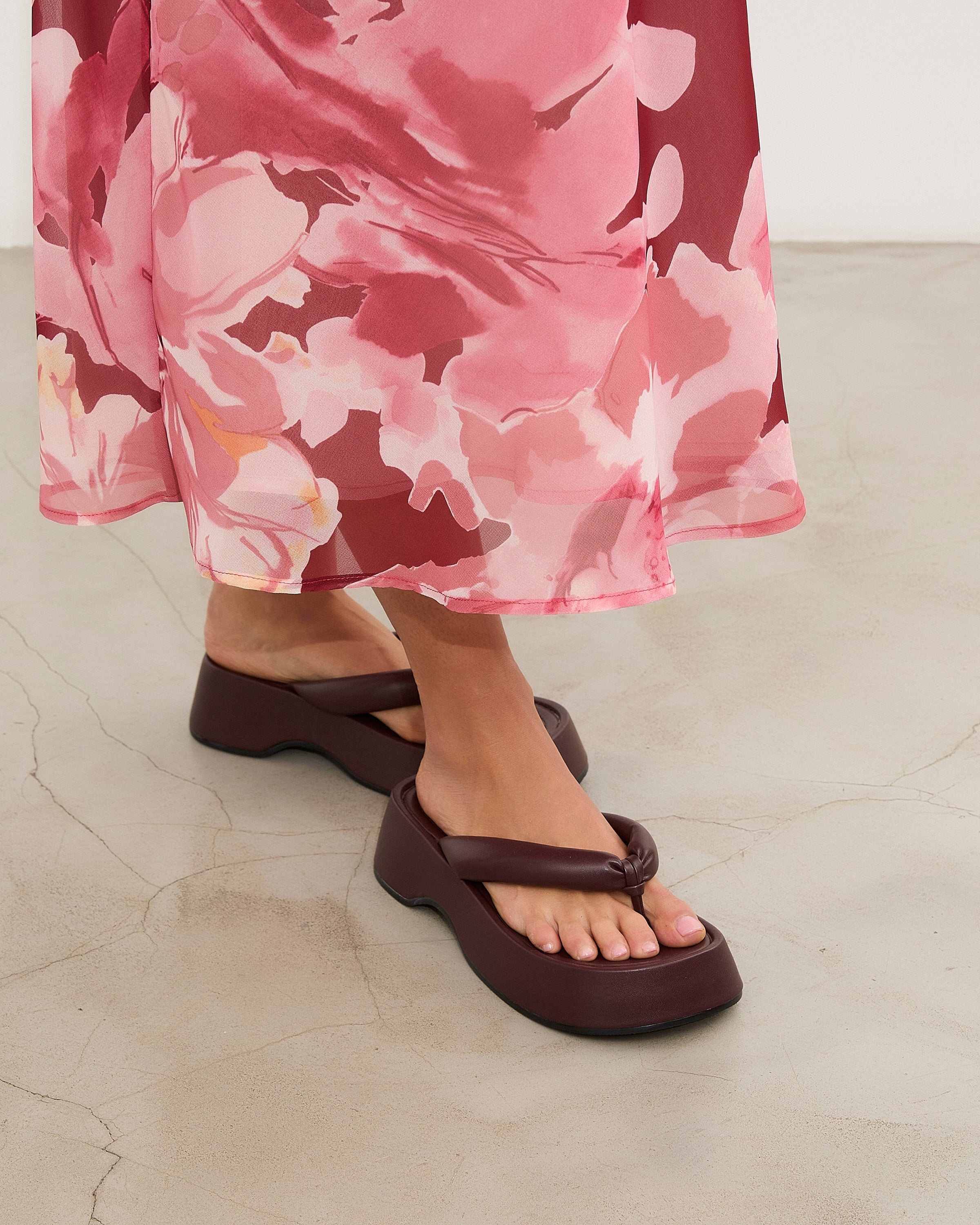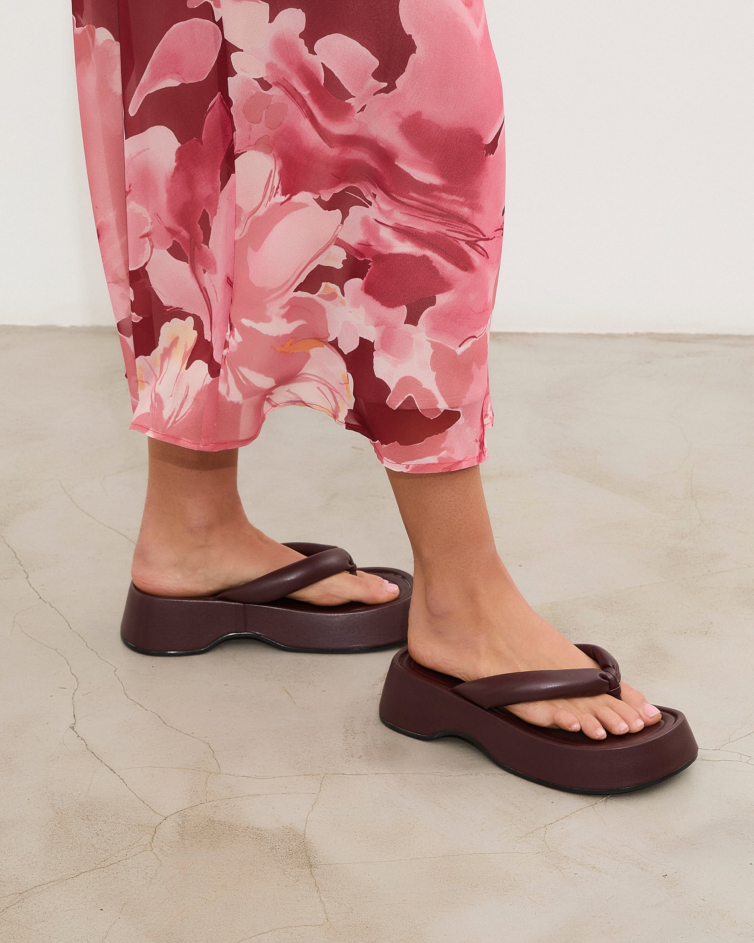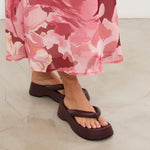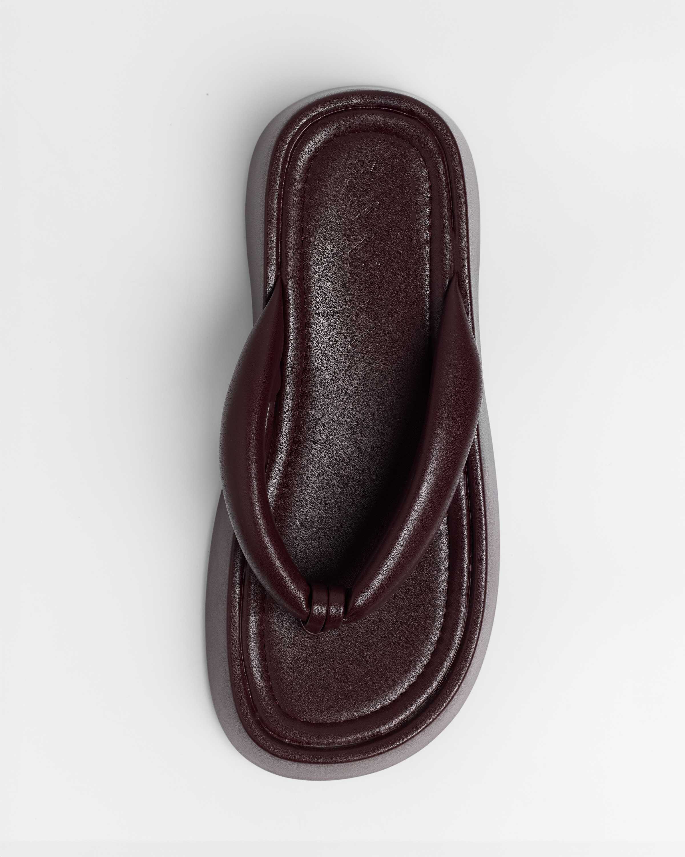 Sandalia plana de dedo con plataforma en color burdeos. Dos maxi tiras acolchadas.