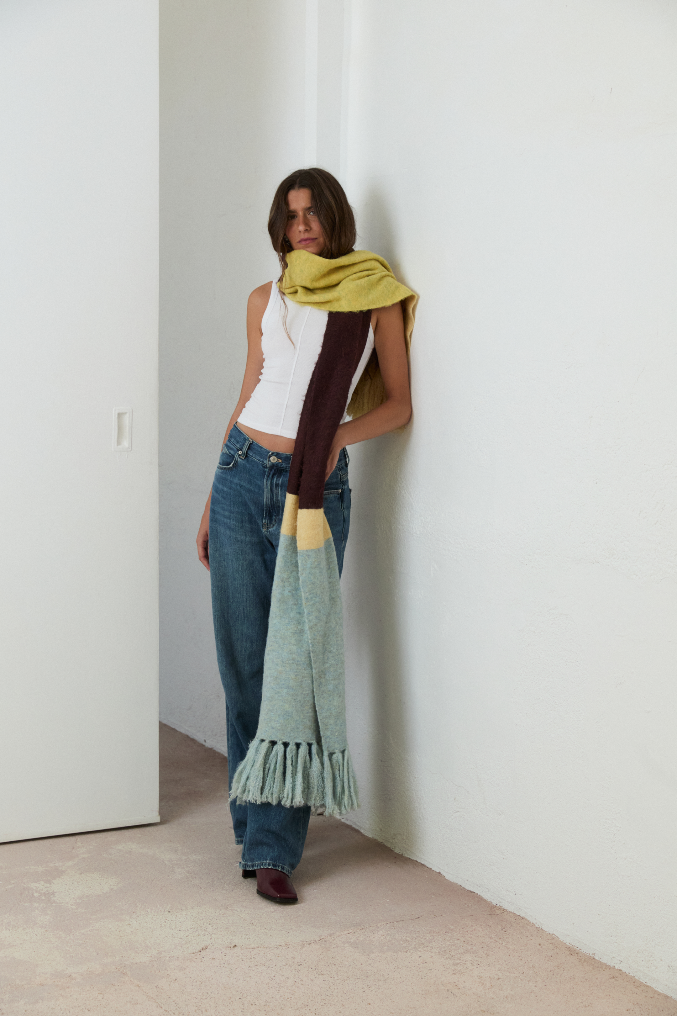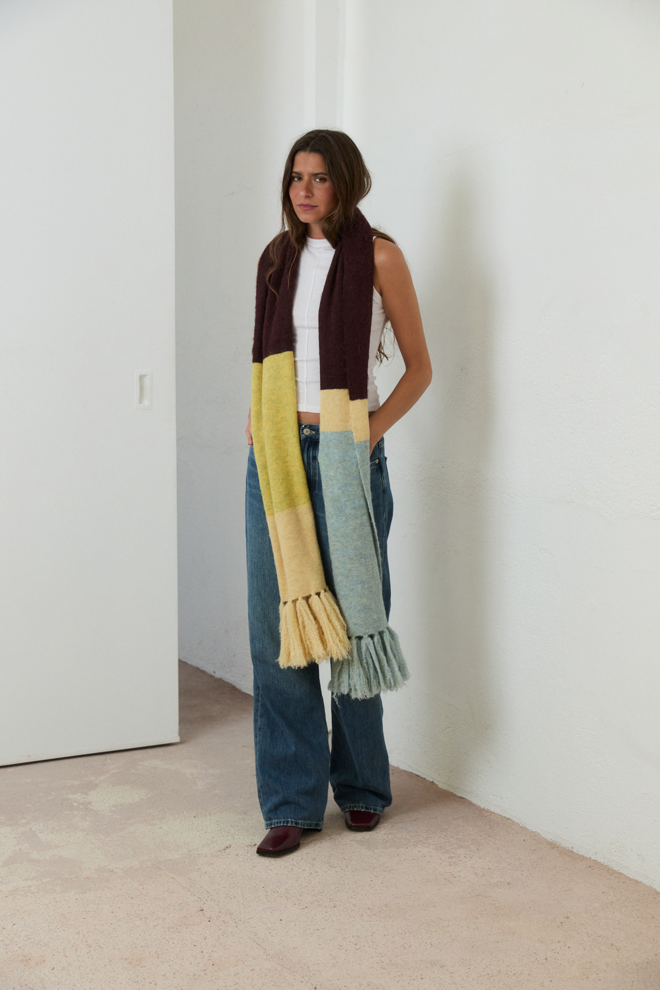 Maxi Bufanda de franjas en tonos frios. Detalle de flecos en los extremos.