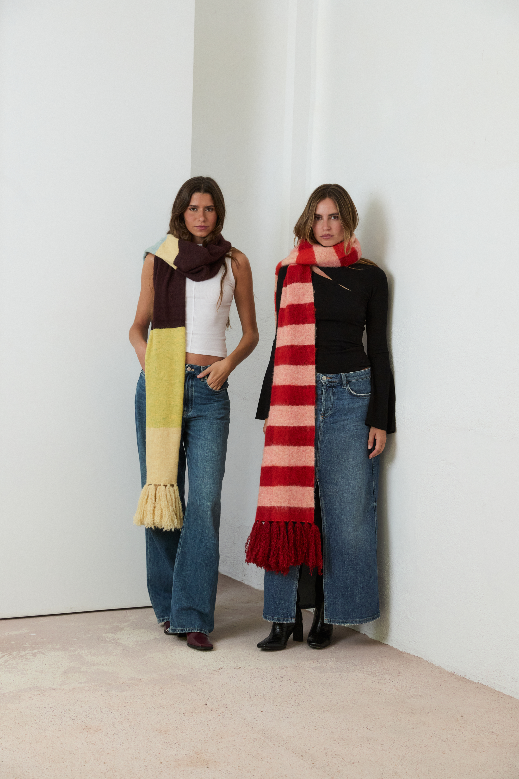 Maxi Bufanda de cuadros en tonos rojos. Detalle de flecos en los extremos.