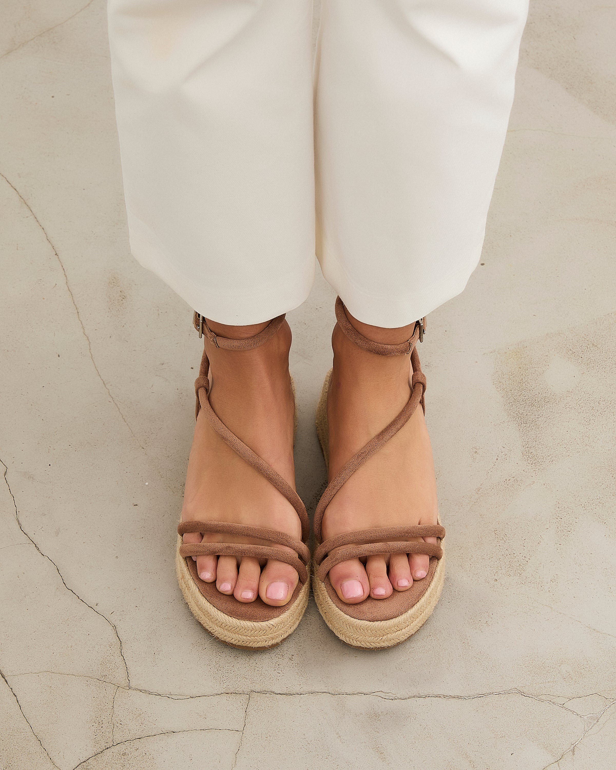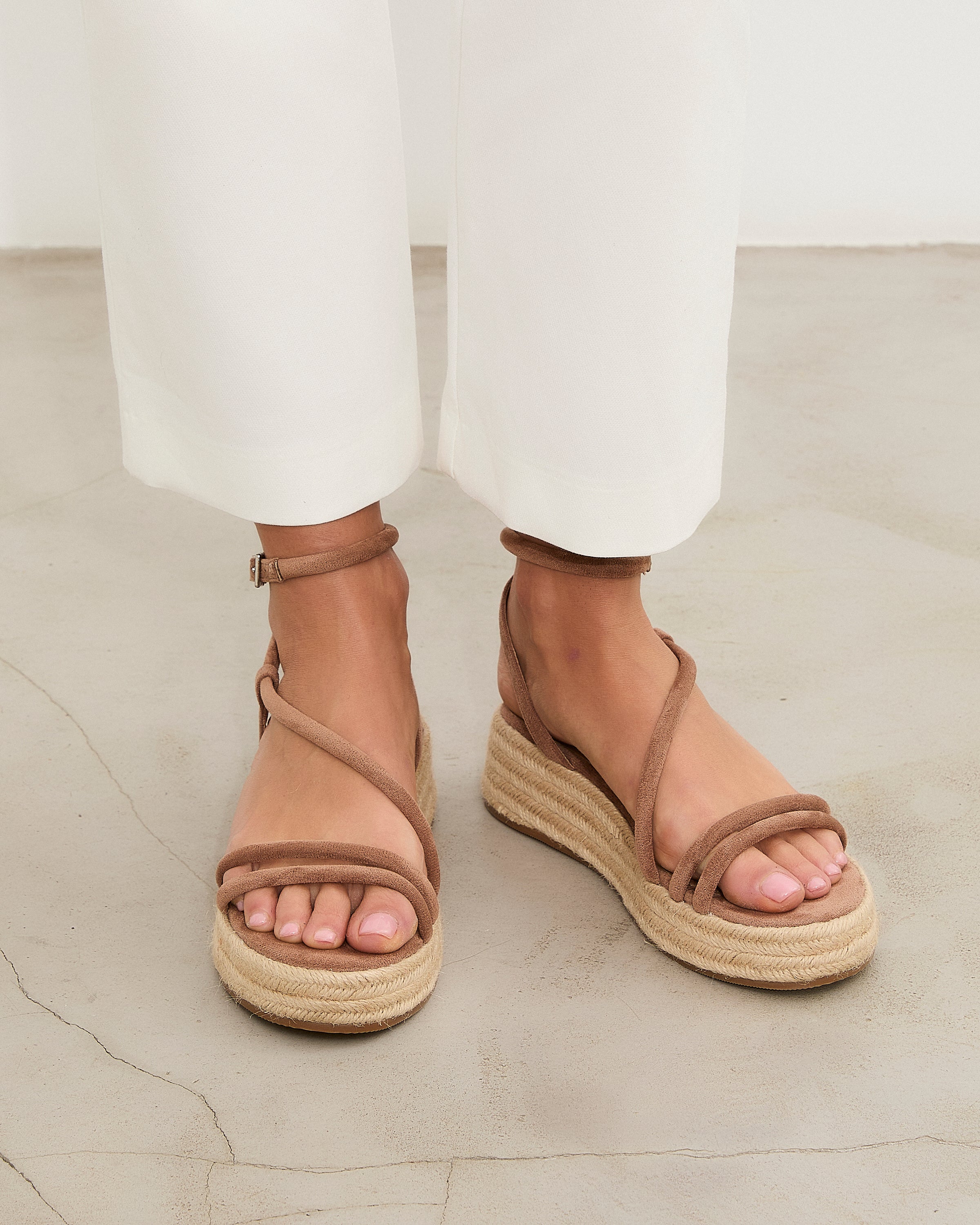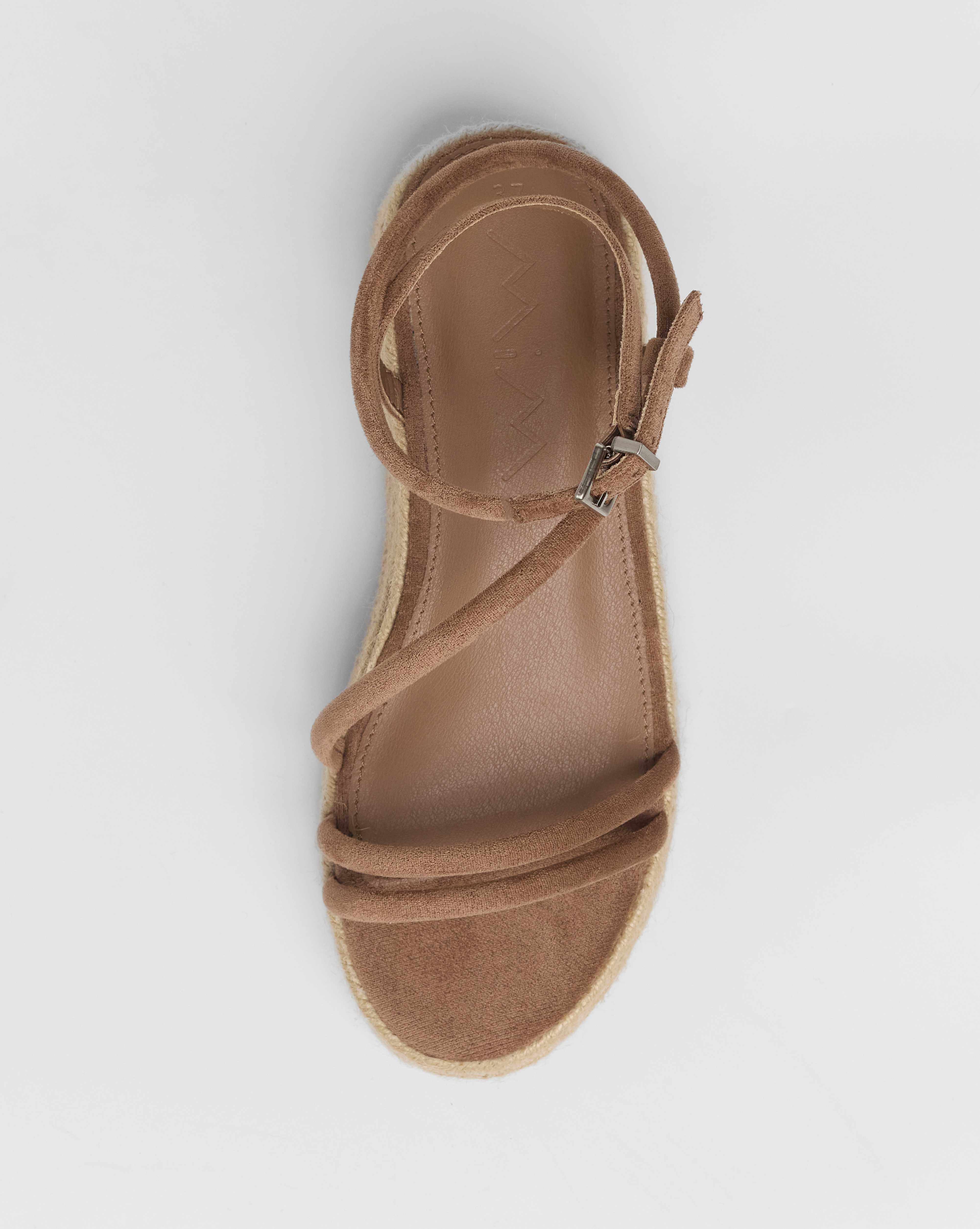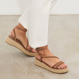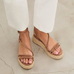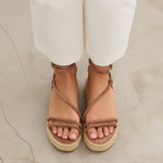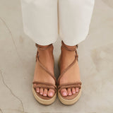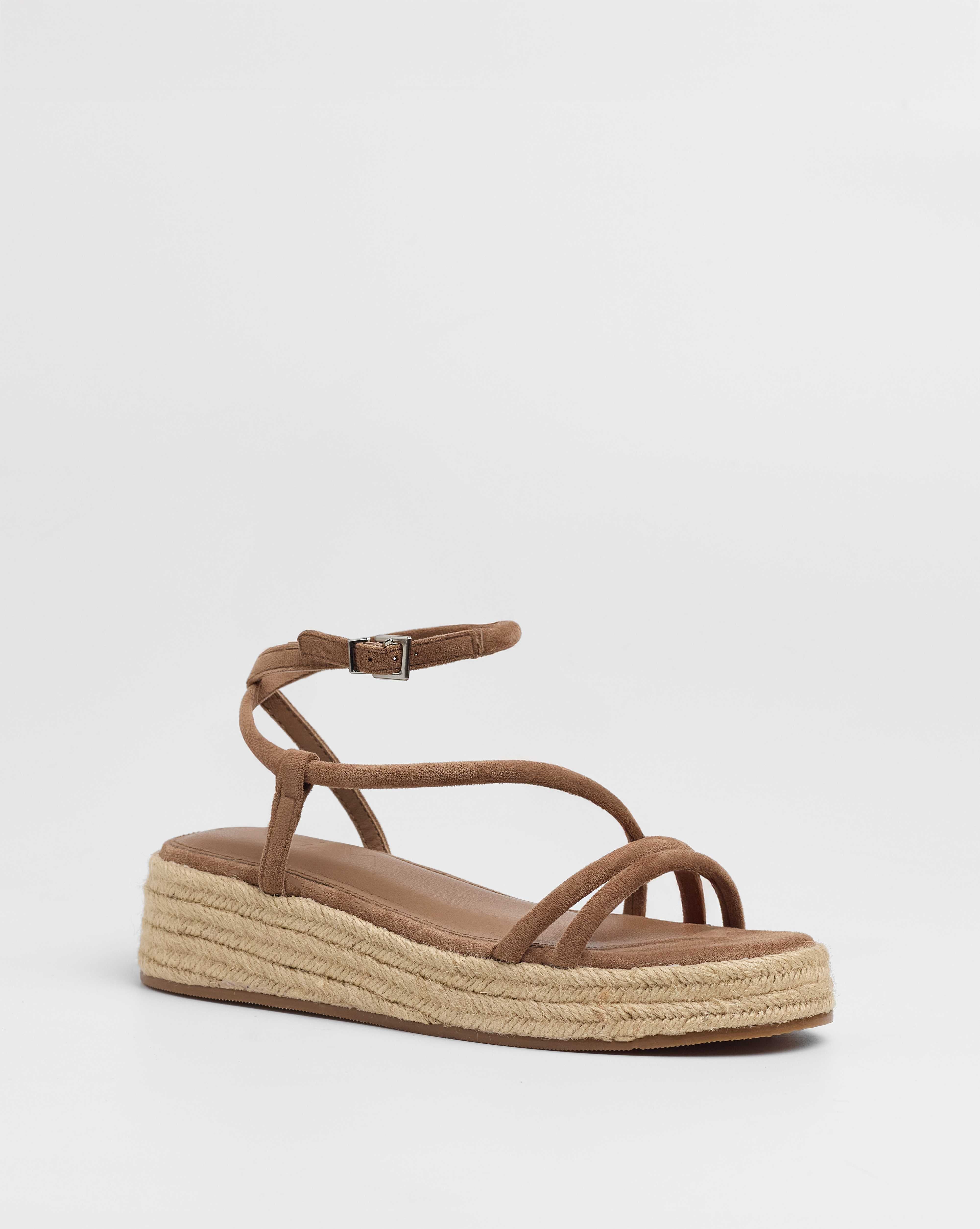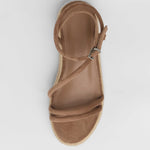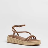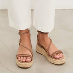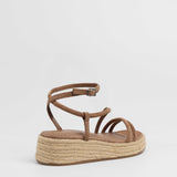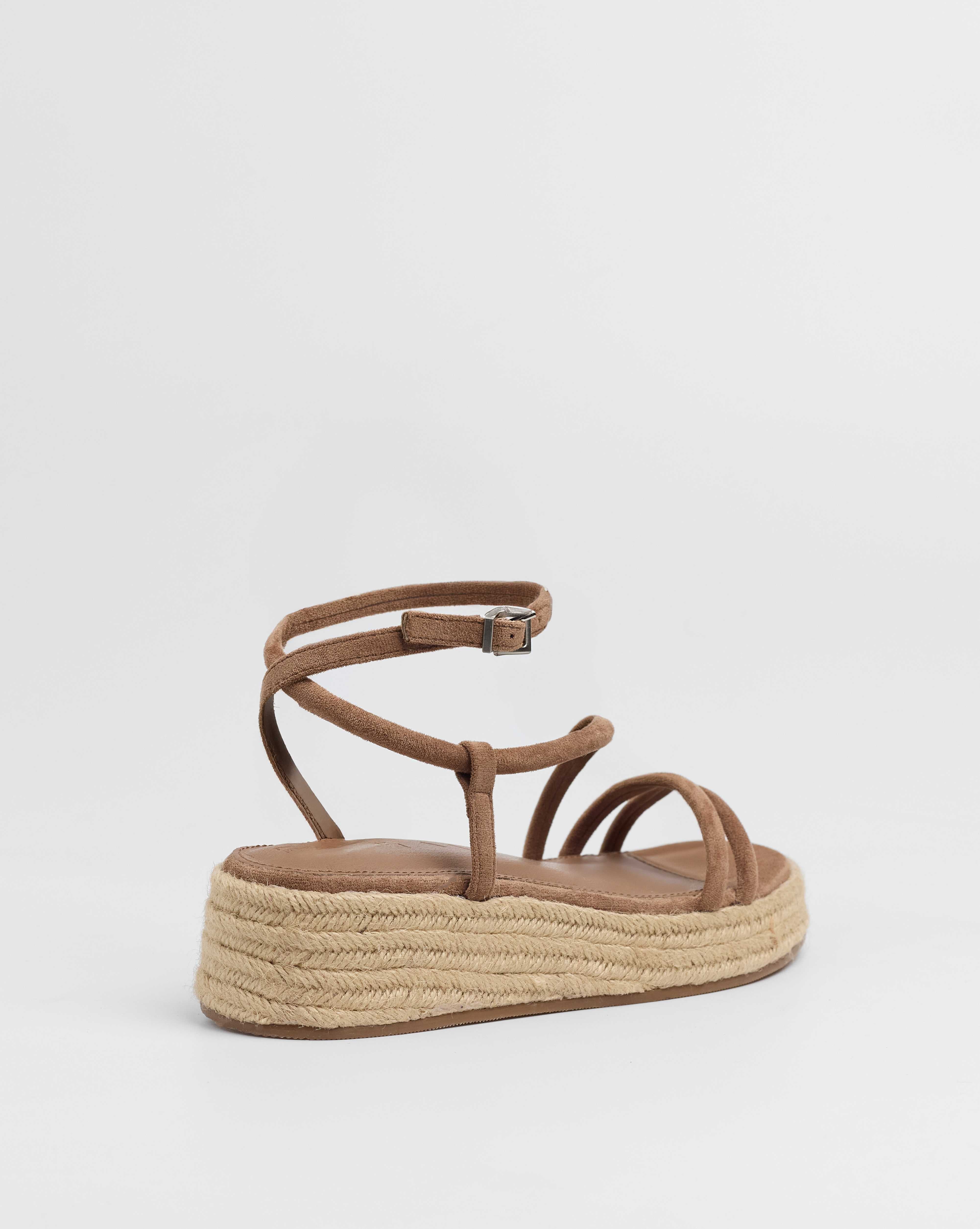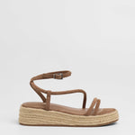 Sandalia de plataforma baja en esparto en color topo. Dos tiras en la parte delantera y tira fina alrededor del tobillo. Cierre con hebilla.