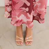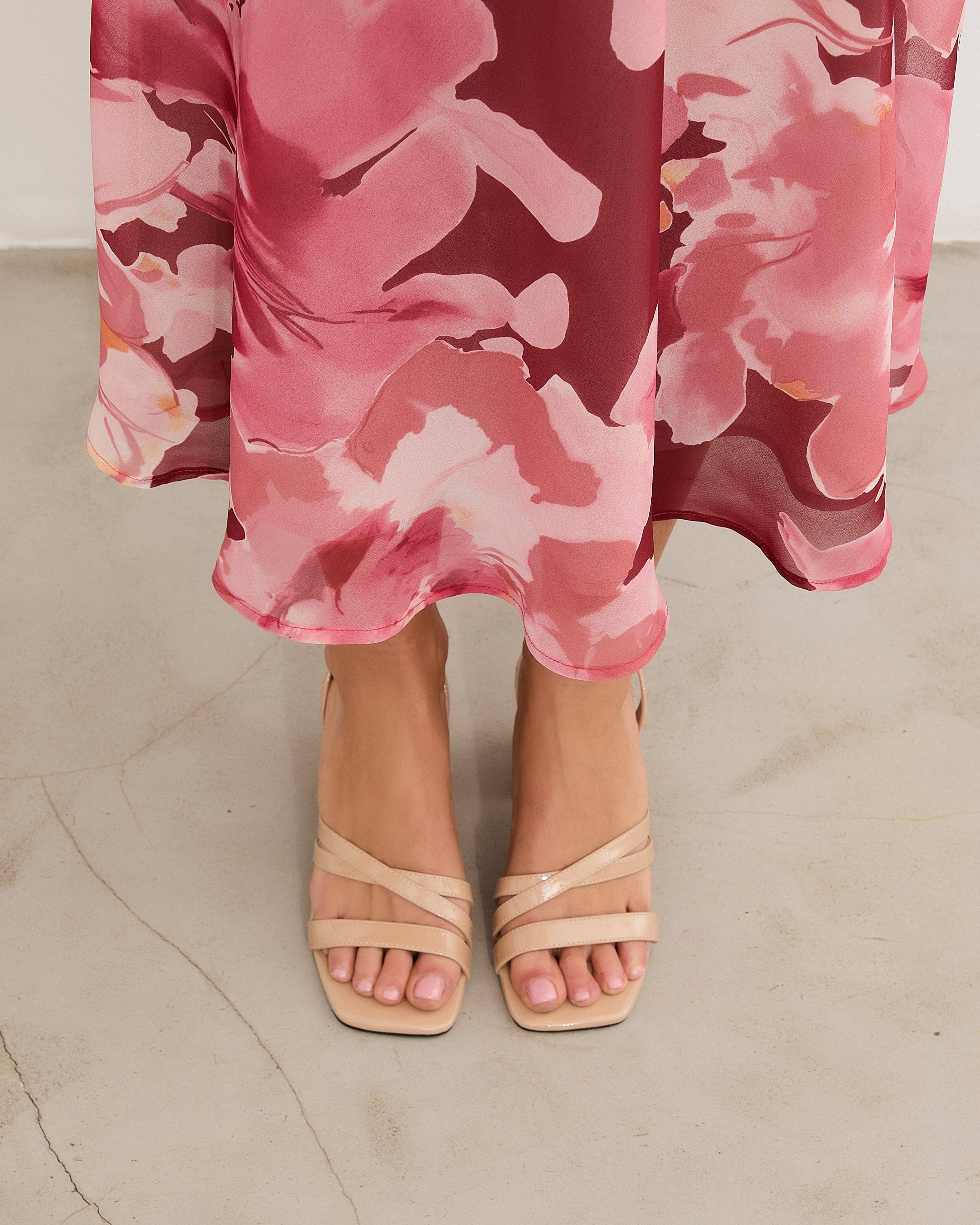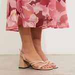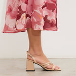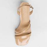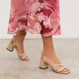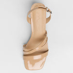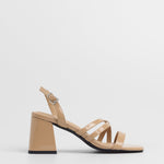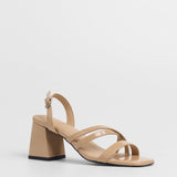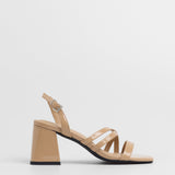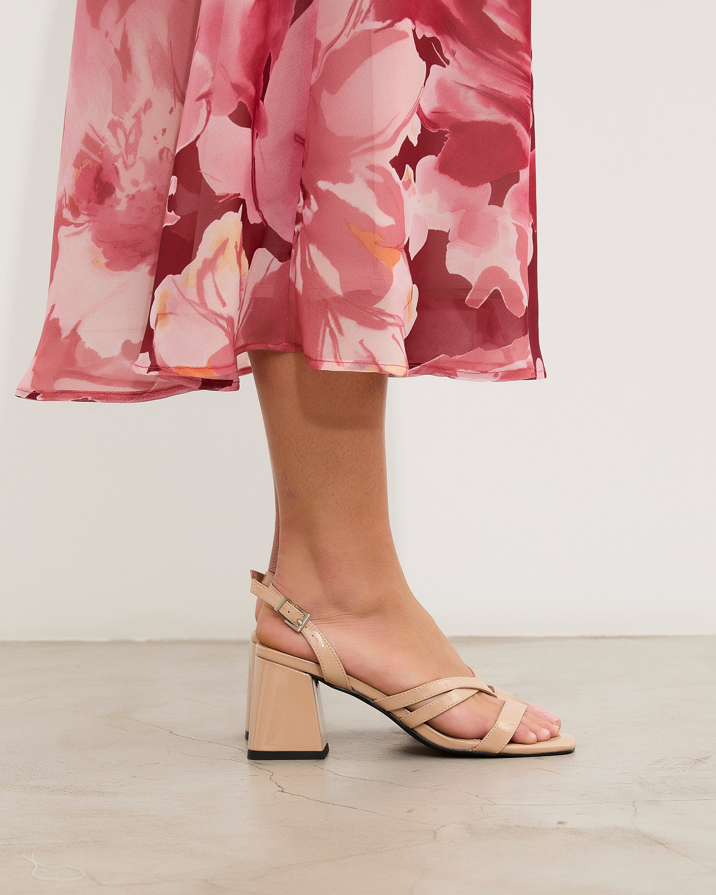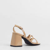 Sandalia de tacón en color nude con puntera cuadrada. Parte delantera abierta con varias tiras. Tacón cuadrado. Cierre con tira al talón con hebilla metálica.