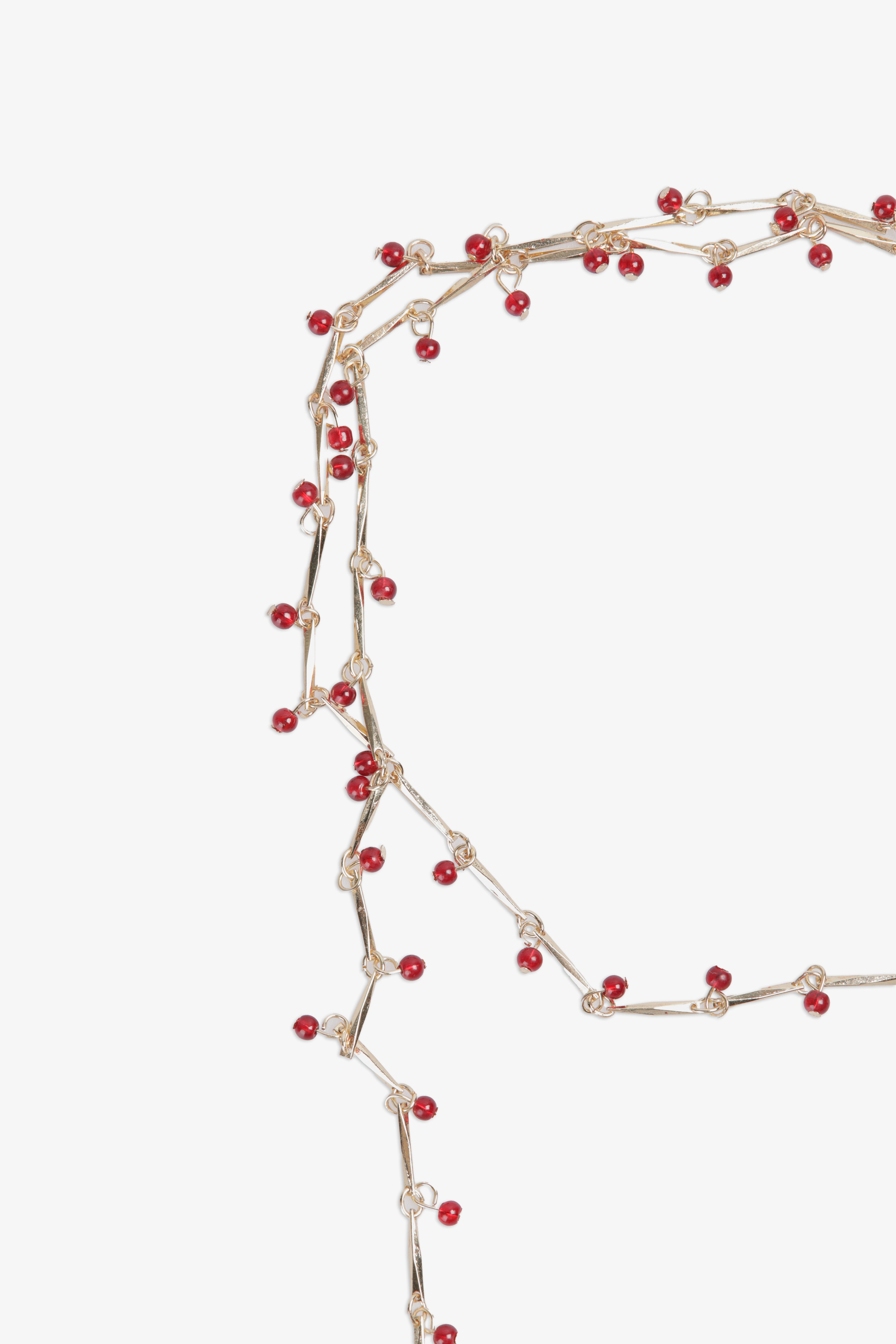 Collar largo multiposición con fina cadena y pequeñas cuentas en tono burdeos distribuidas a lo largo, con detalle de dos colgantes en forma de gota en mismo tono.