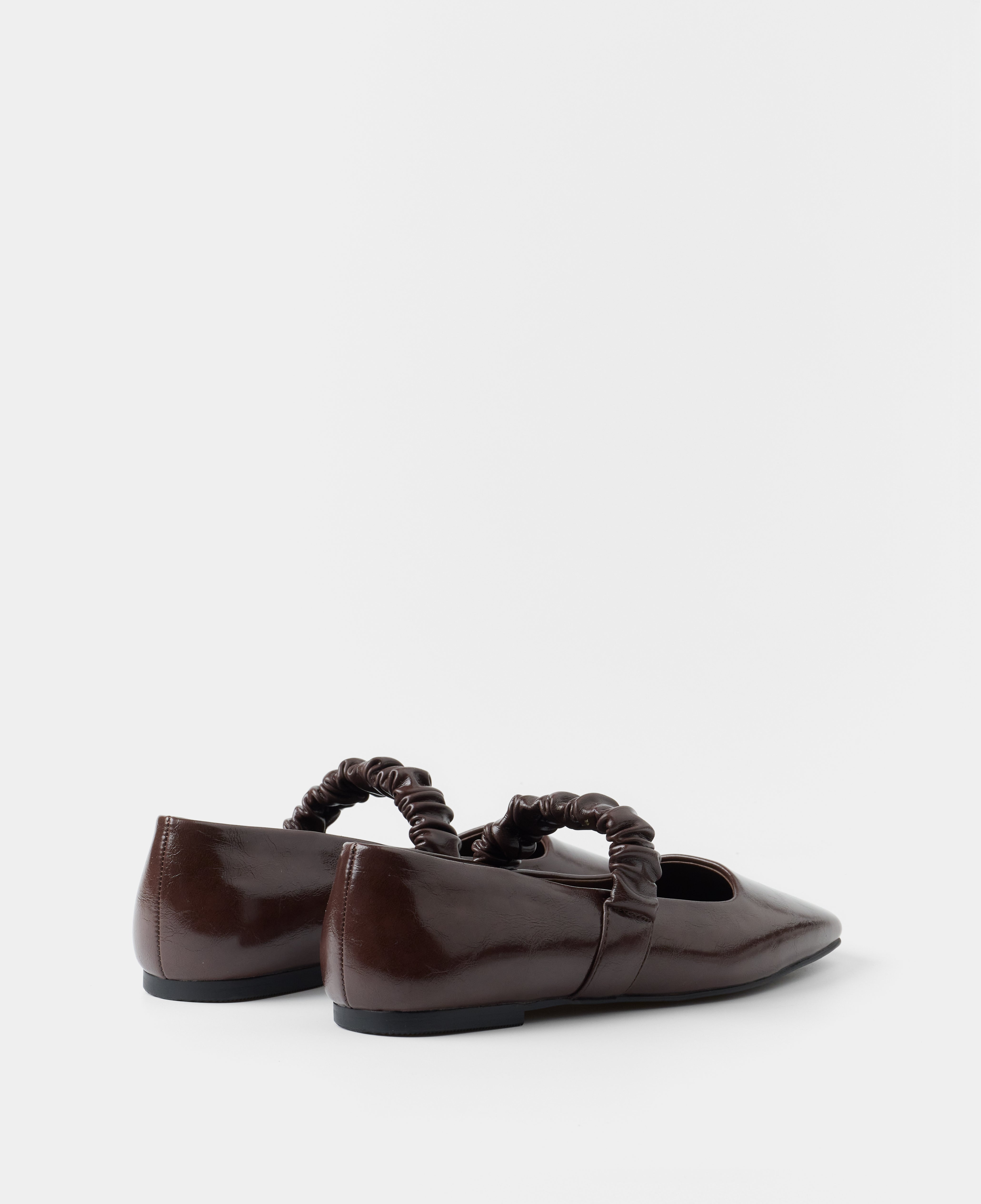 Zapato plano cerrado con puntera cuadrada en color chocolate. Ajuste con elástico.