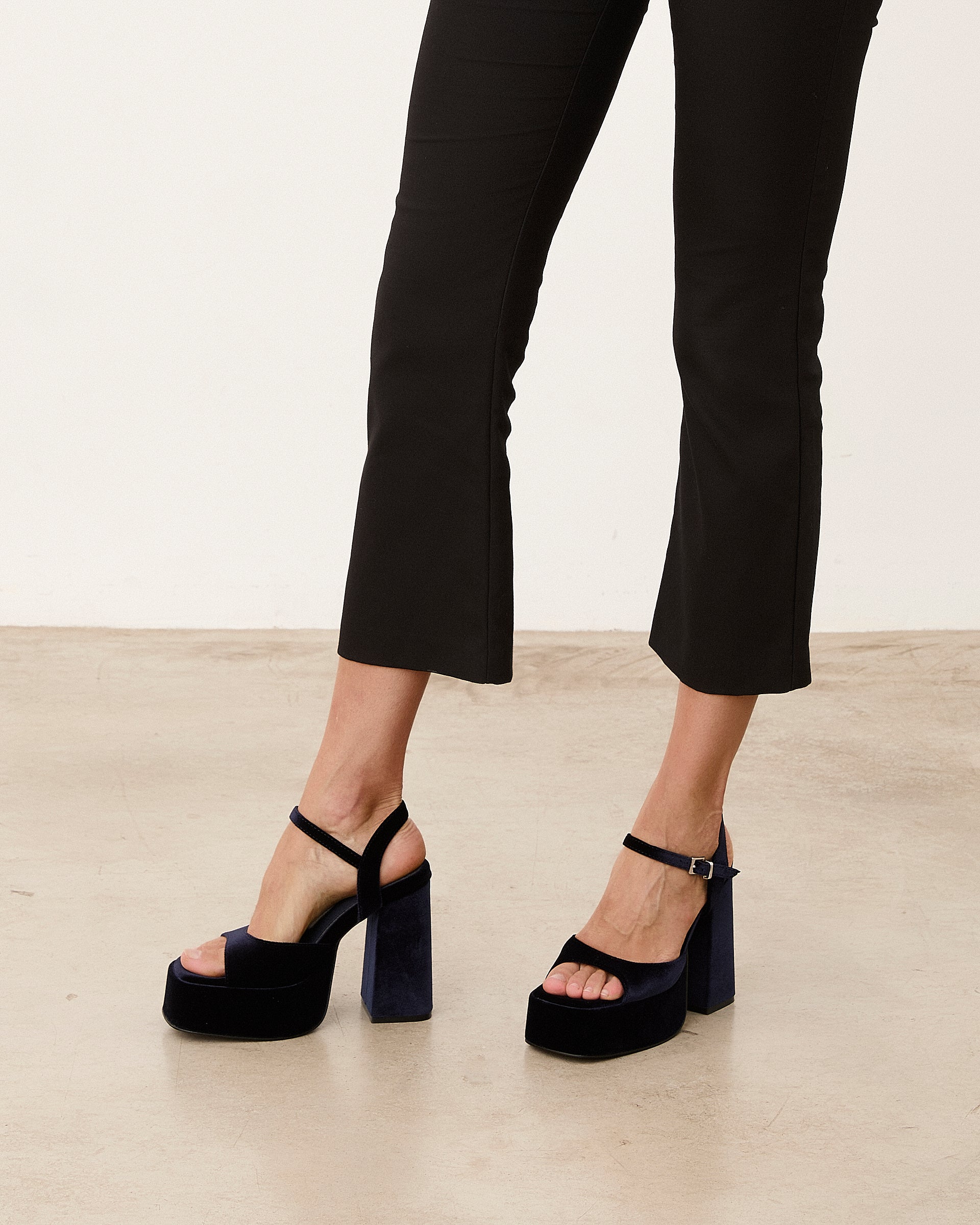 Sandalia de tacón con plataforma XL en color azul marino. Tira en ancha en la parte delantera y pulsera para sujección en tobillo. Tacón rectangular.