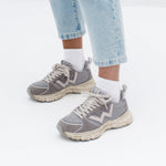 Zapatilla estilo running de piel con detalles en mesh en tonos grises con logo de MIM. Cierre con cordones.