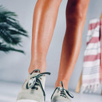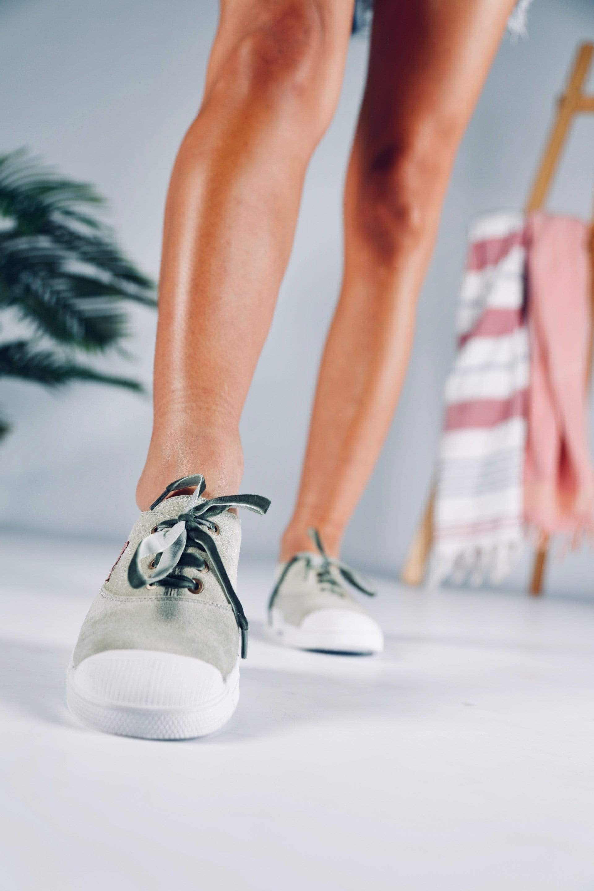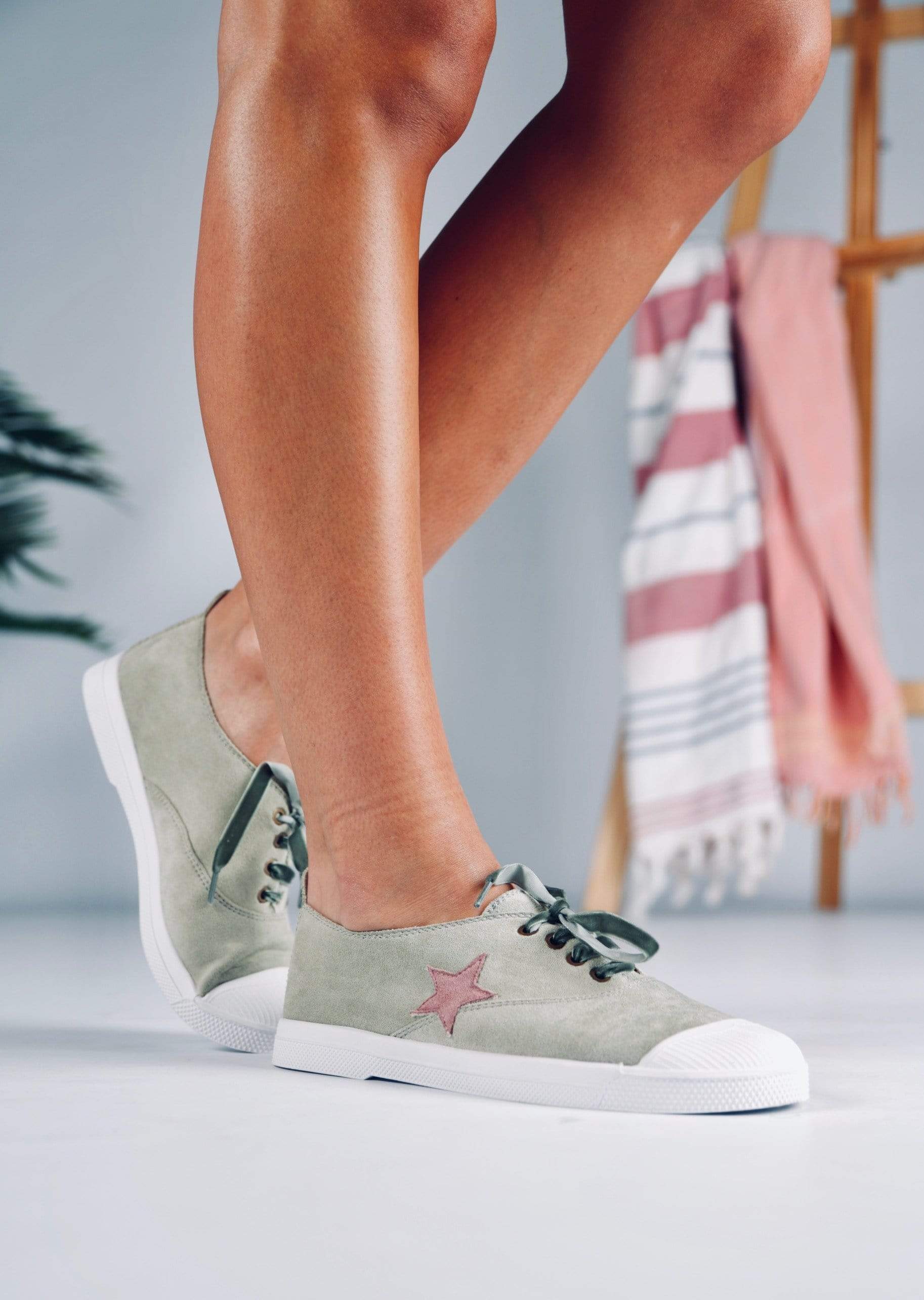 Zapatilla plana de color verde de antelina con estrella color teja y punta blanca de goma. Cordones en terciopelo vegano verde.
