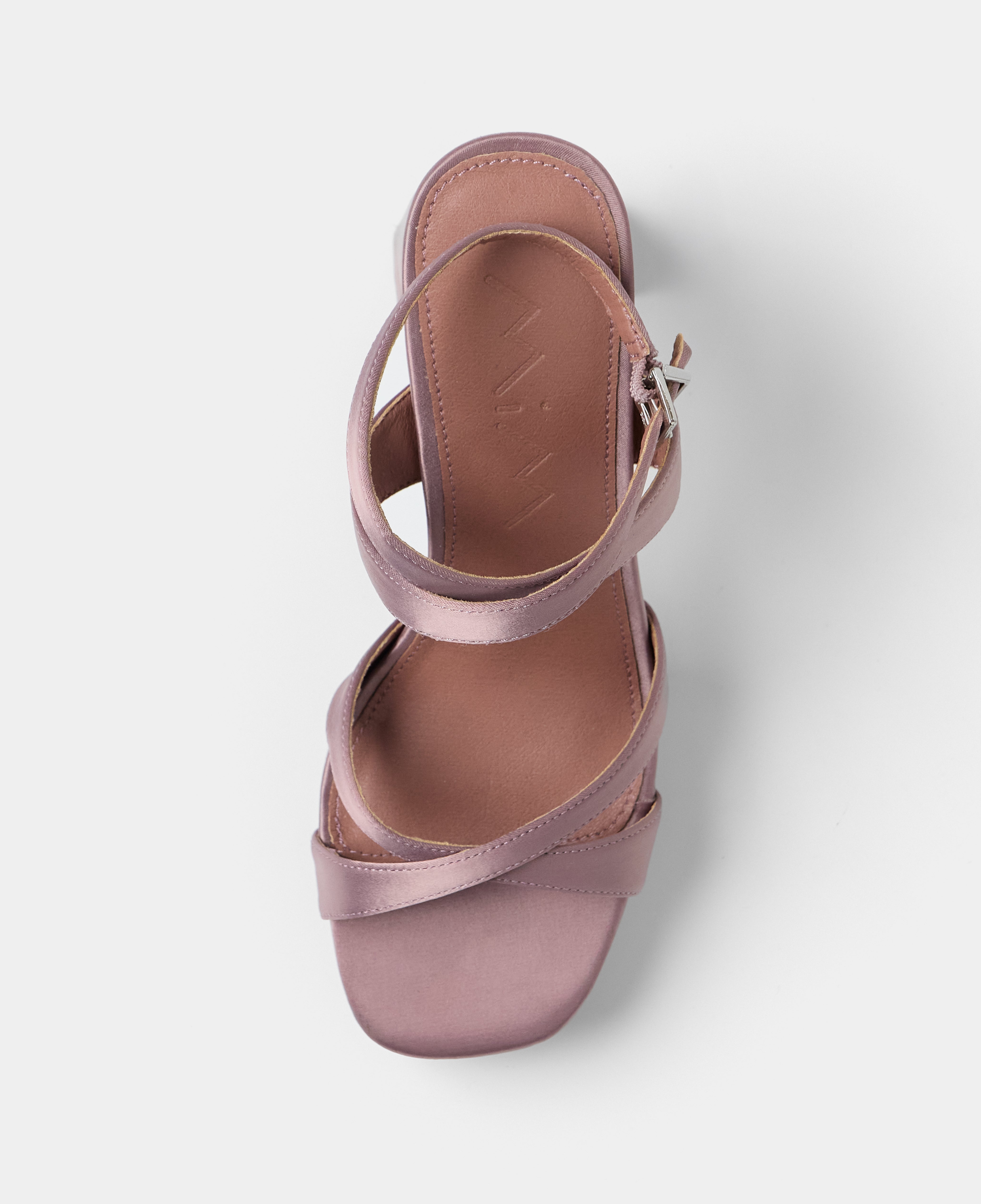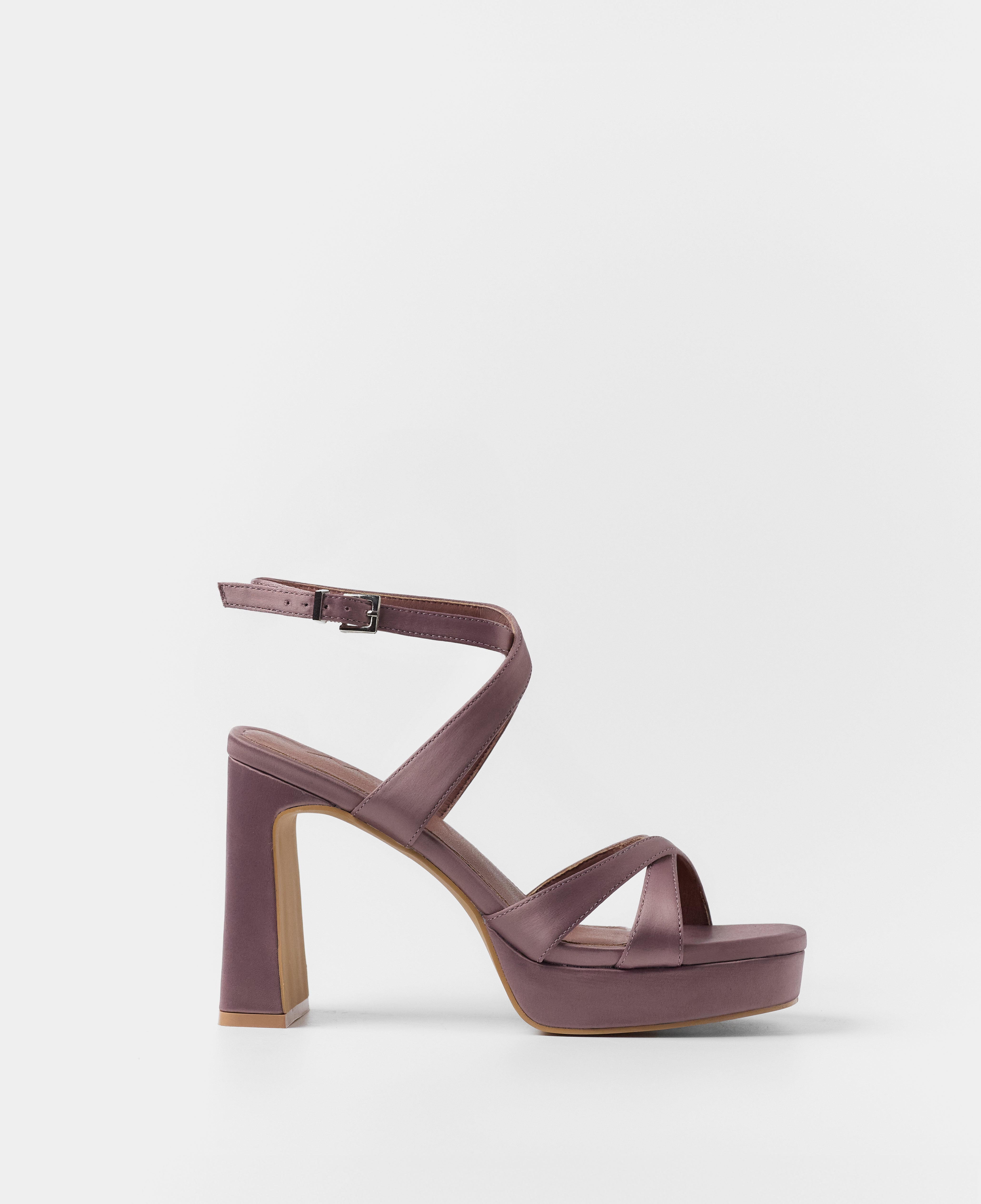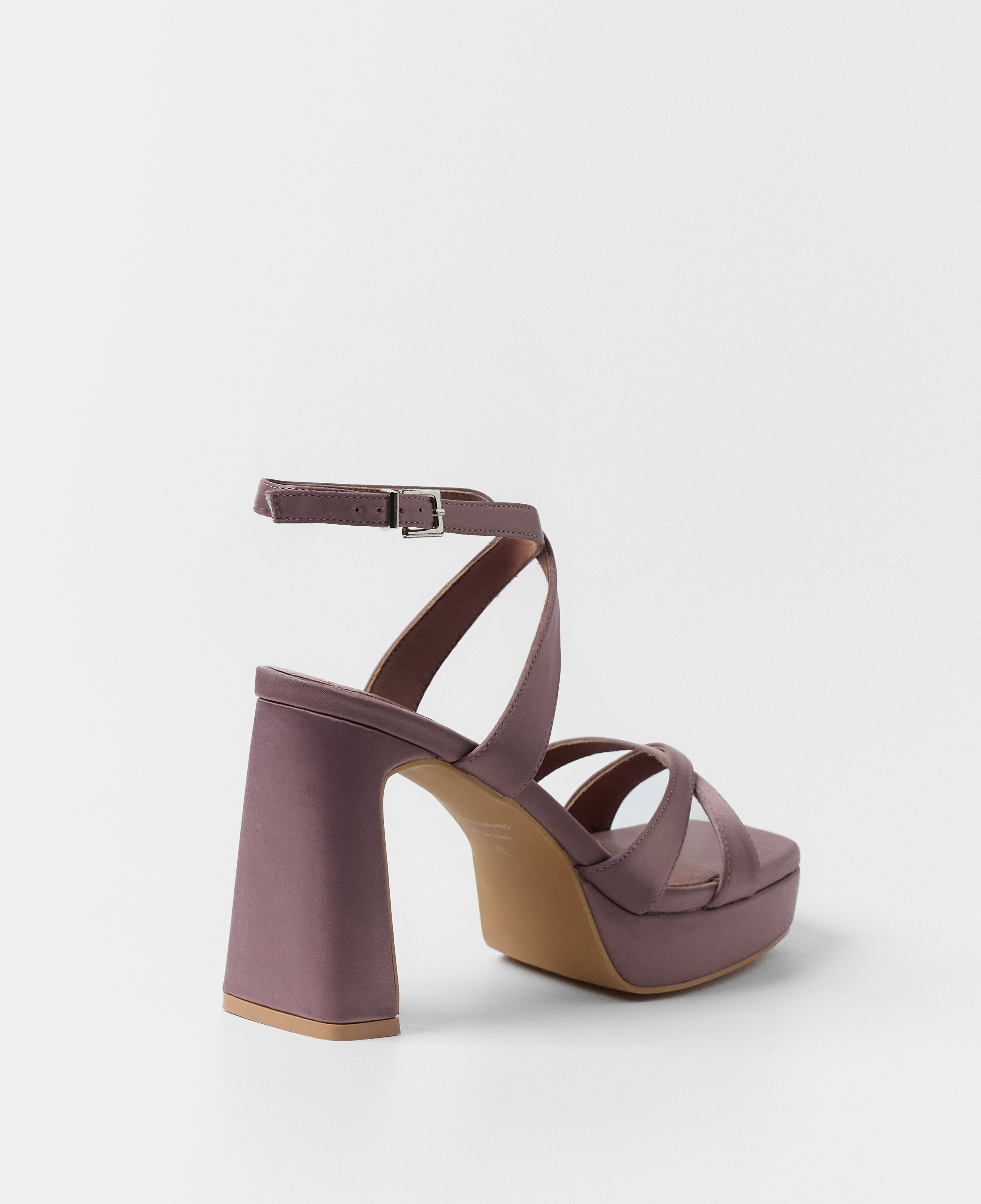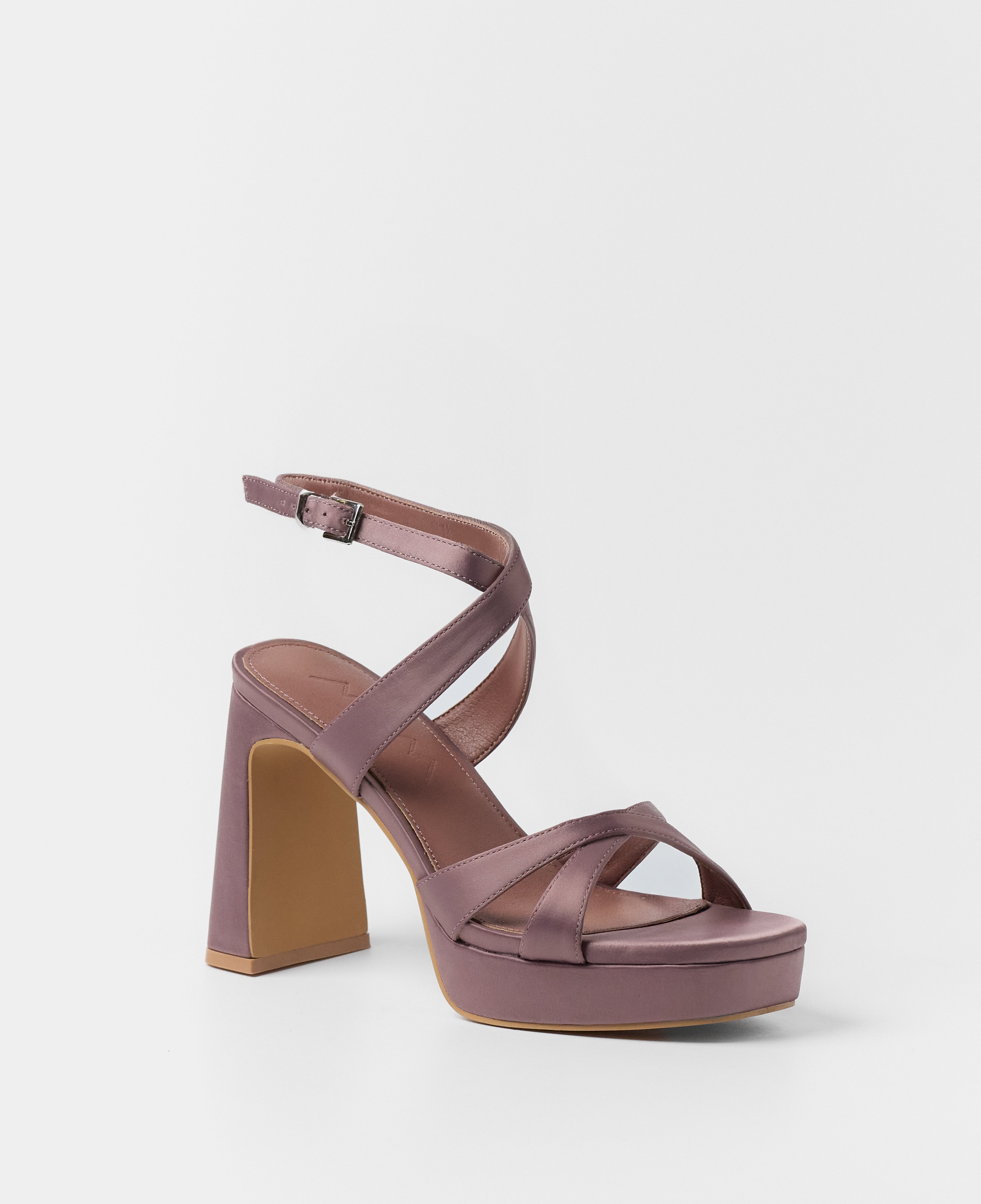 Sandalia de tacón con plataforma en color malva. Dos tiras cruzadas en la parte frontal y cierre con pulsera al tobillo con cruce delantero. Tacón rectangular.
