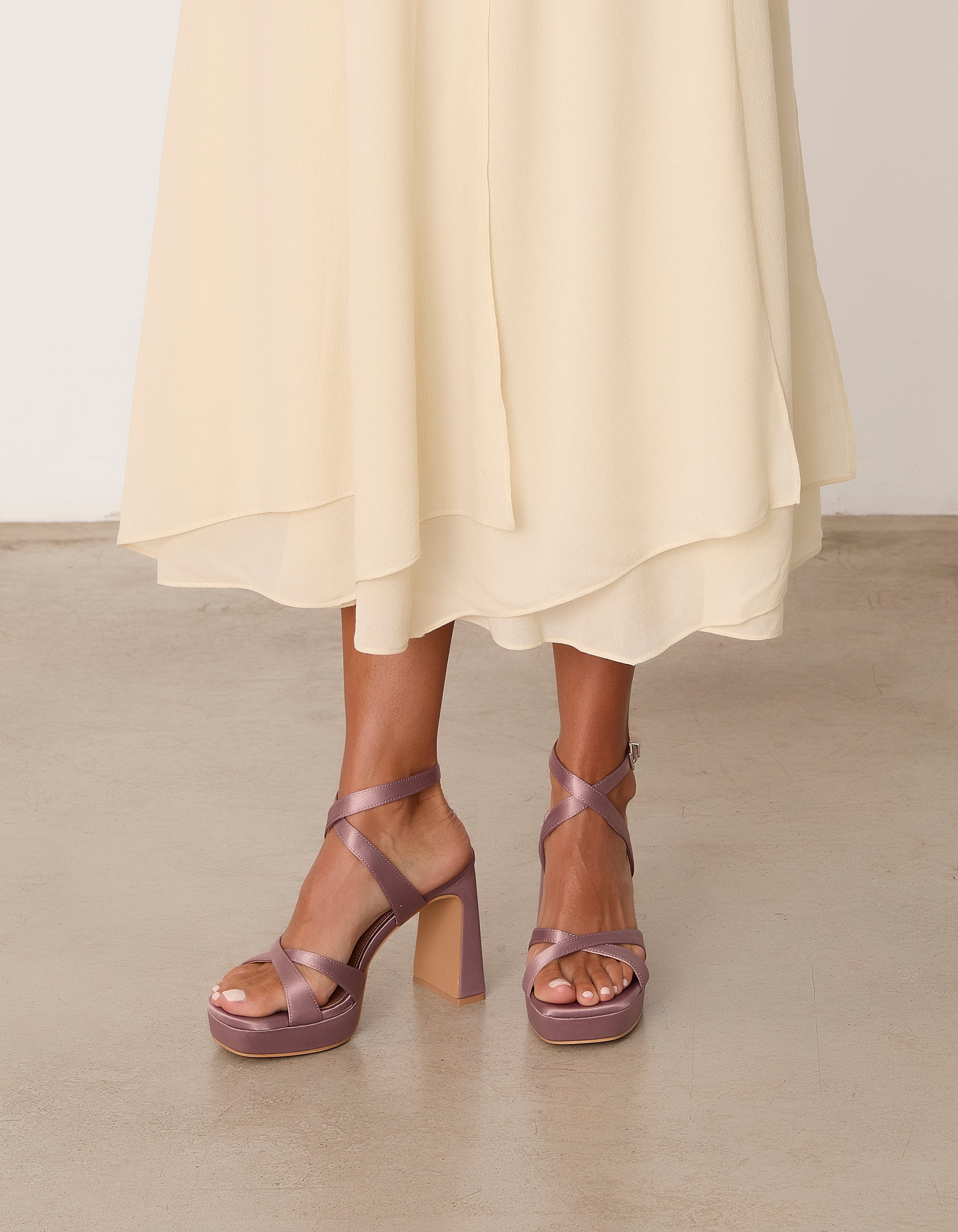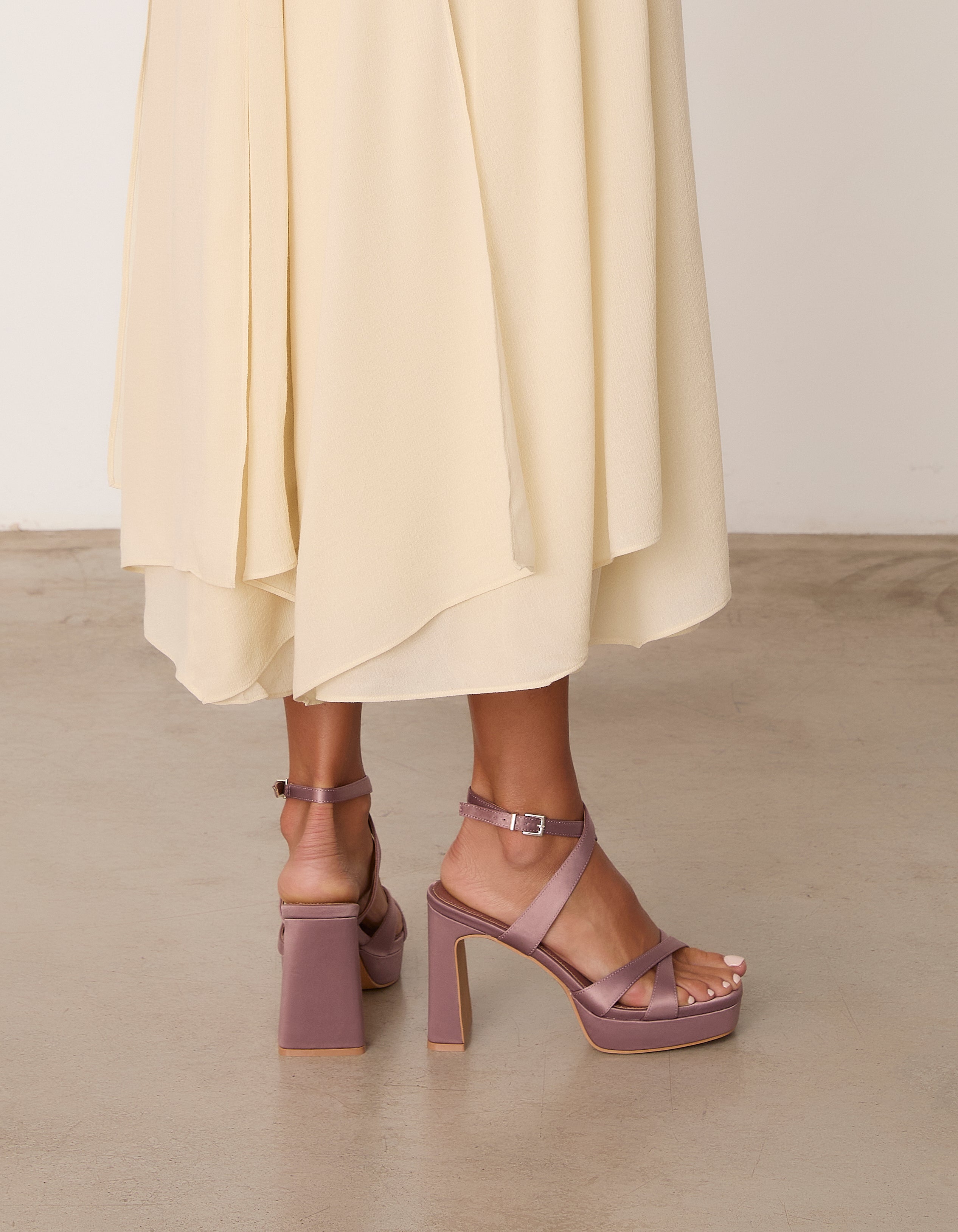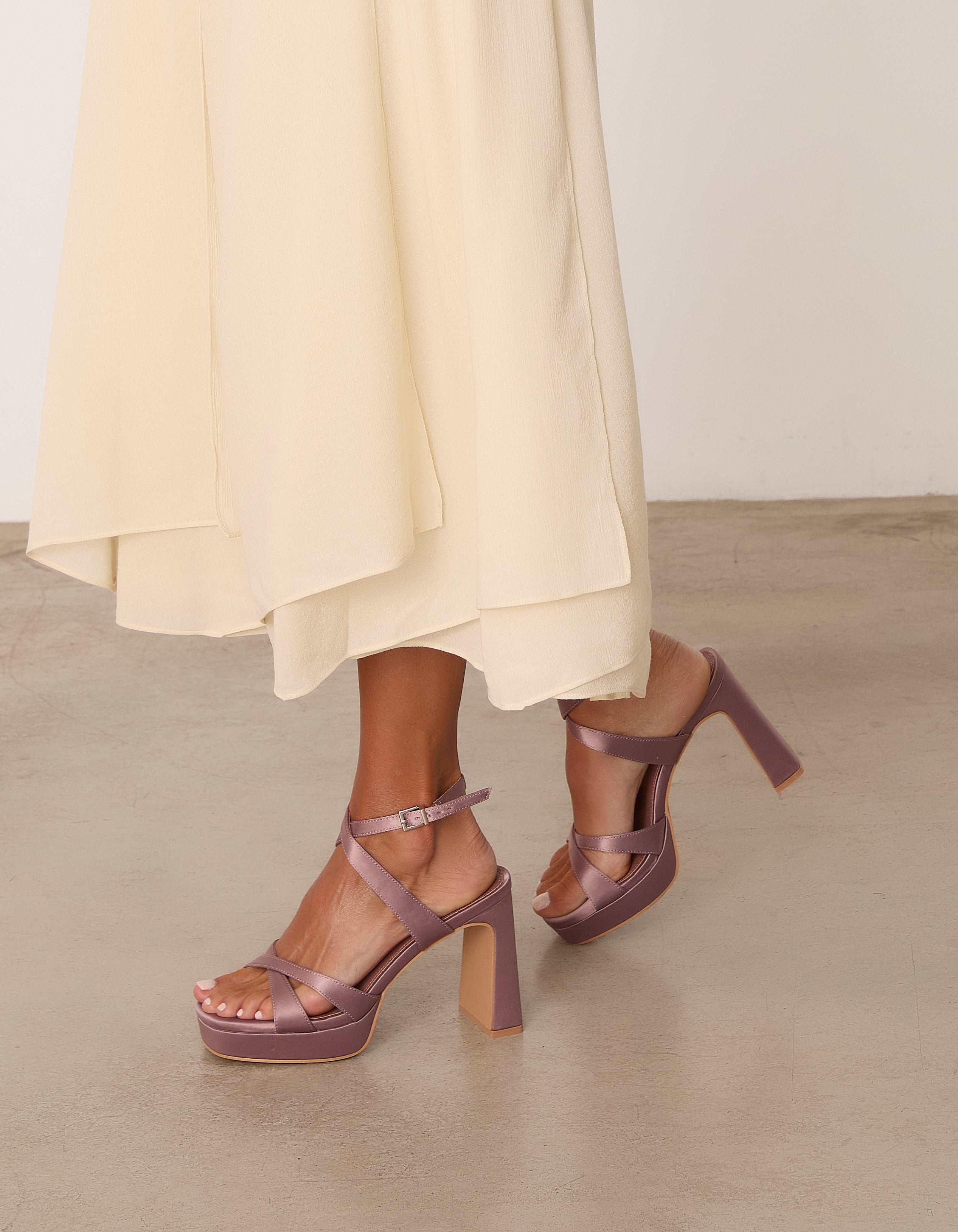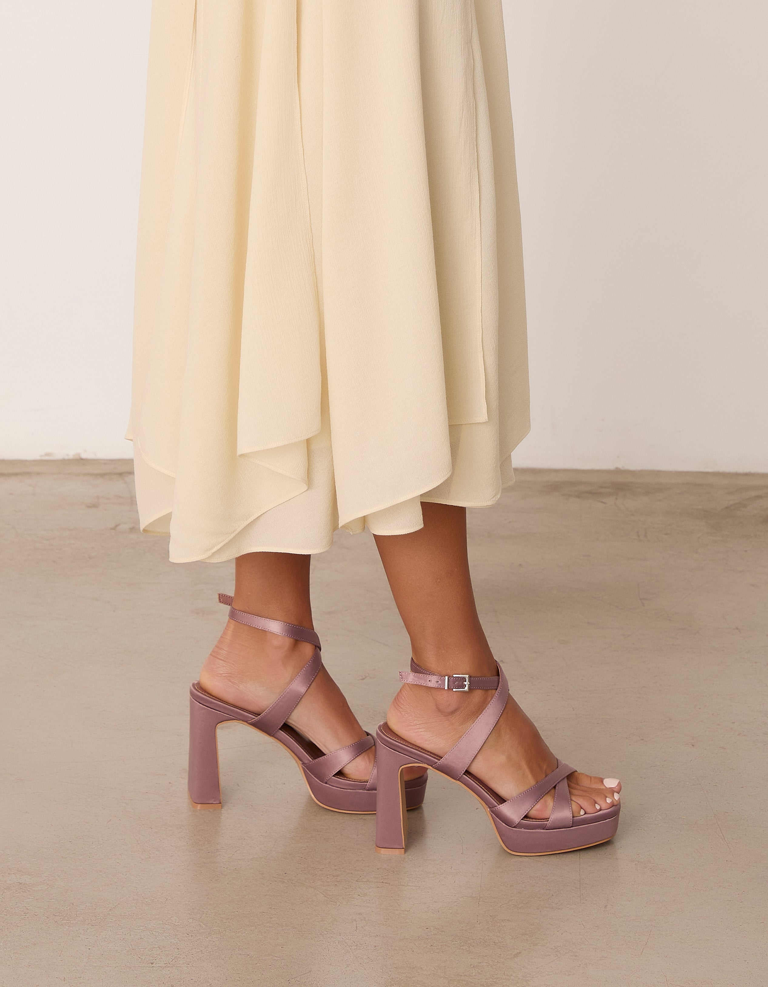 Sandalia de tacón con plataforma en color malva. Dos tiras cruzadas en la parte frontal y cierre con pulsera al tobillo con cruce delantero. Tacón rectangular.