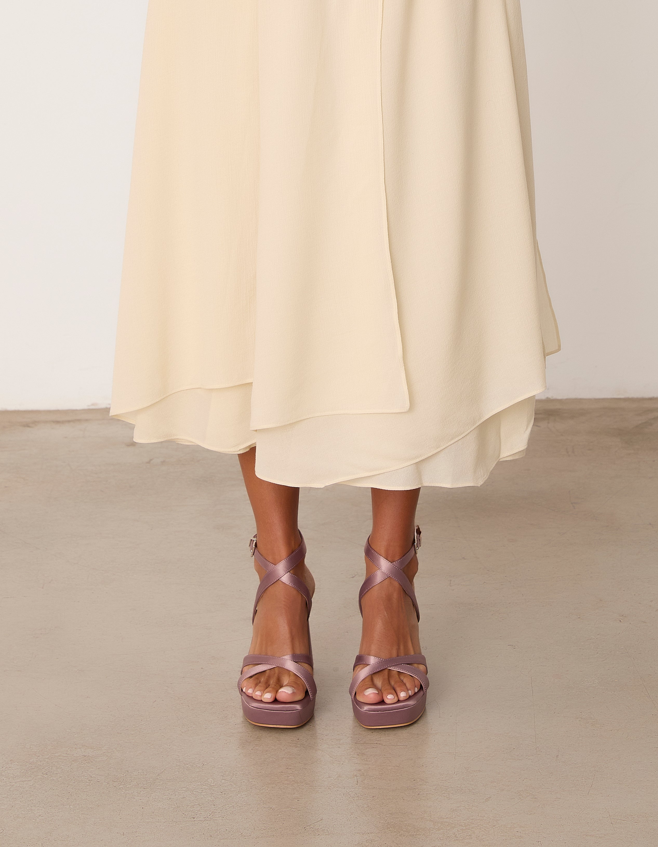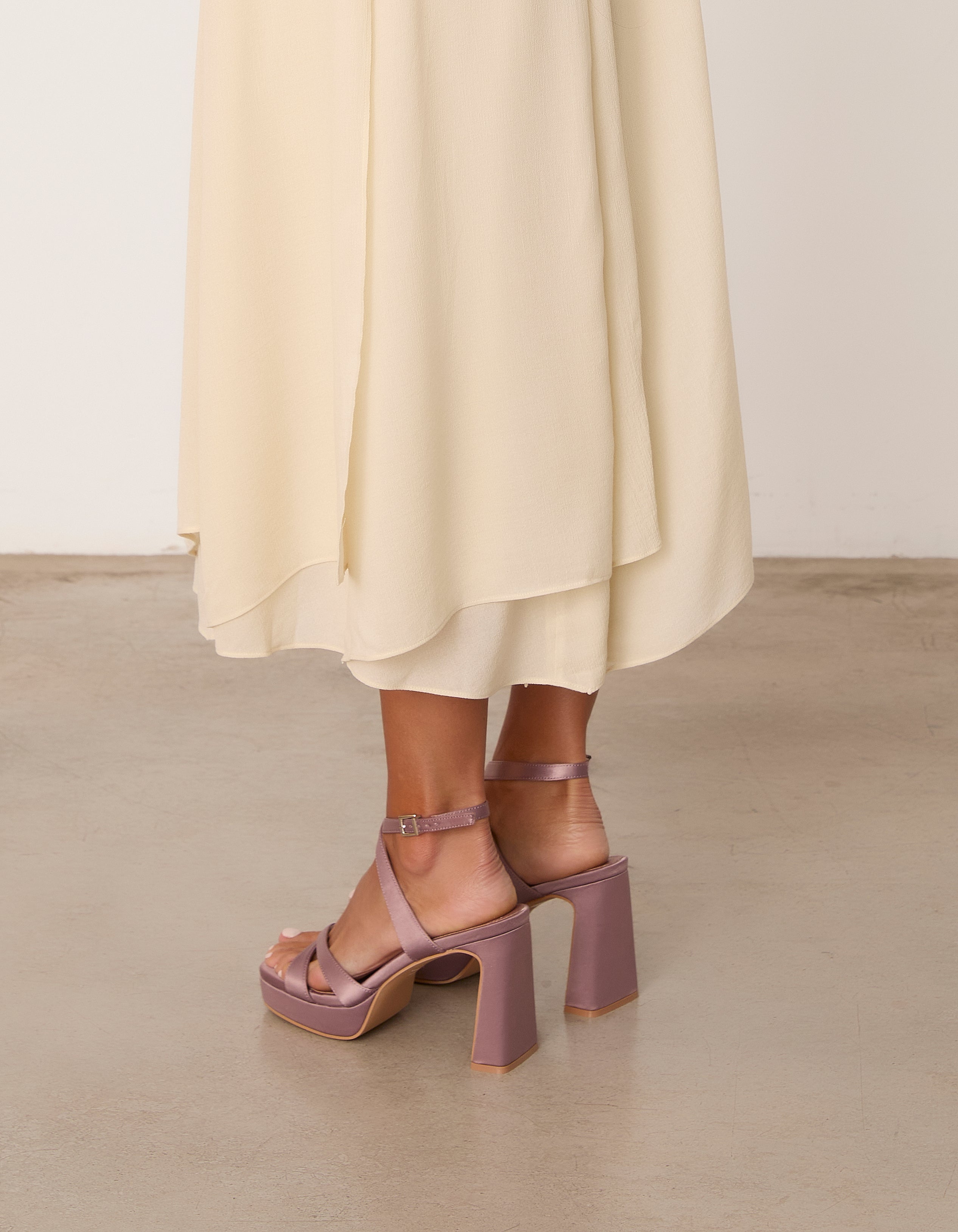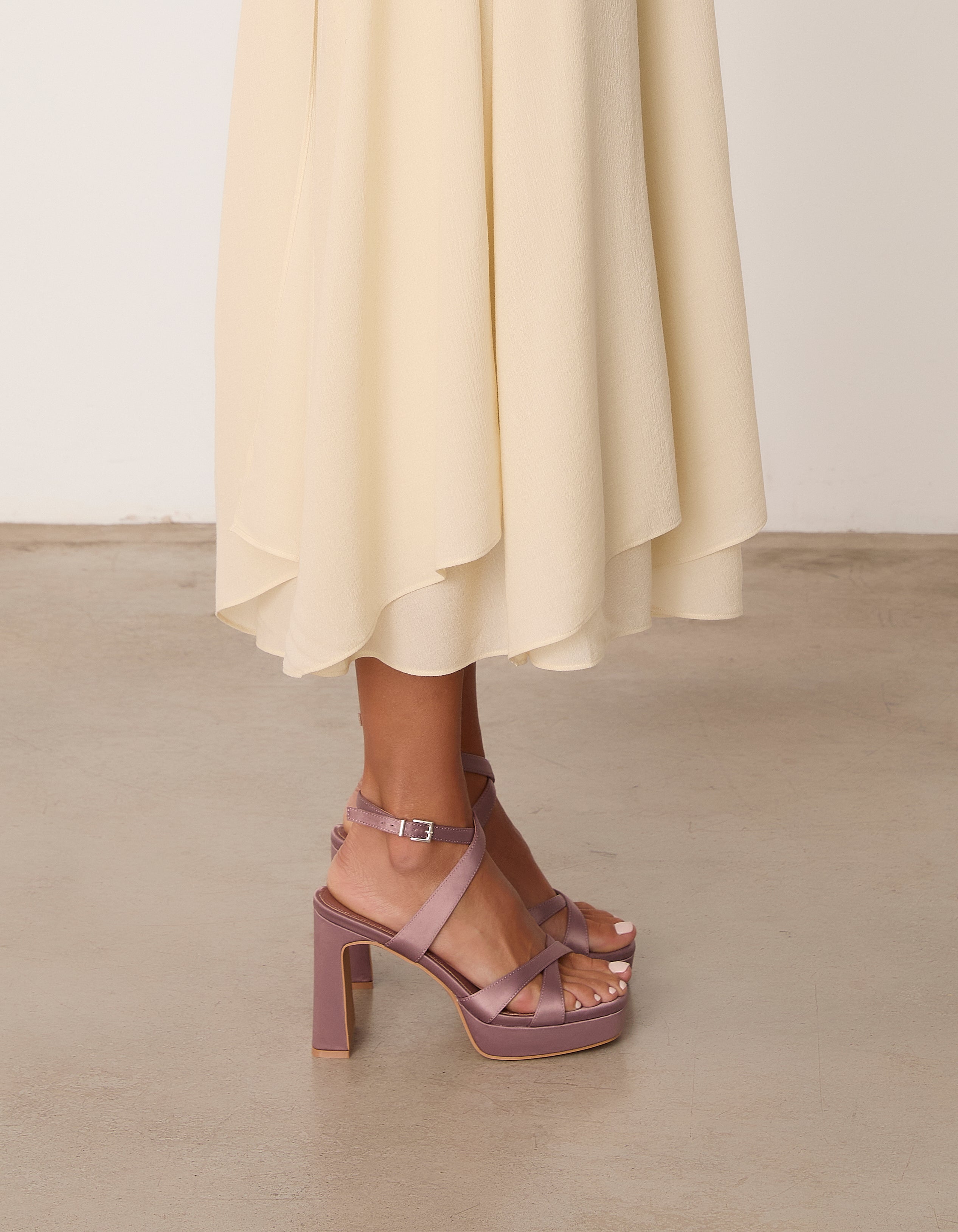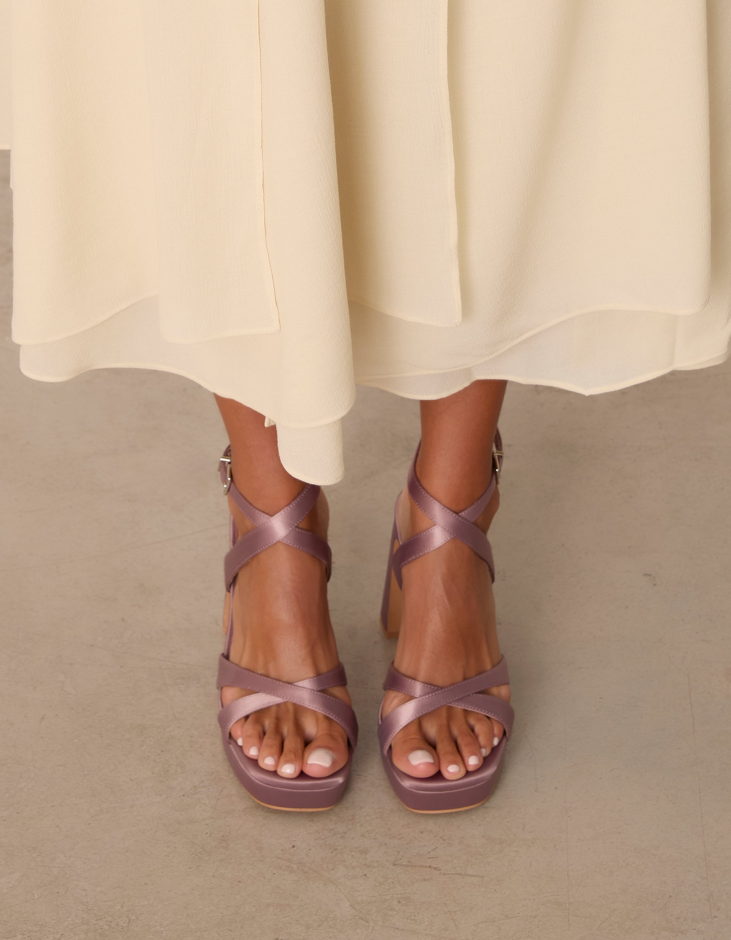 Sandalia de tacón con plataforma en color malva. Dos tiras cruzadas en la parte frontal y cierre con pulsera al tobillo con cruce delantero. Tacón rectangular.