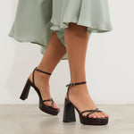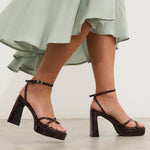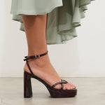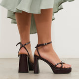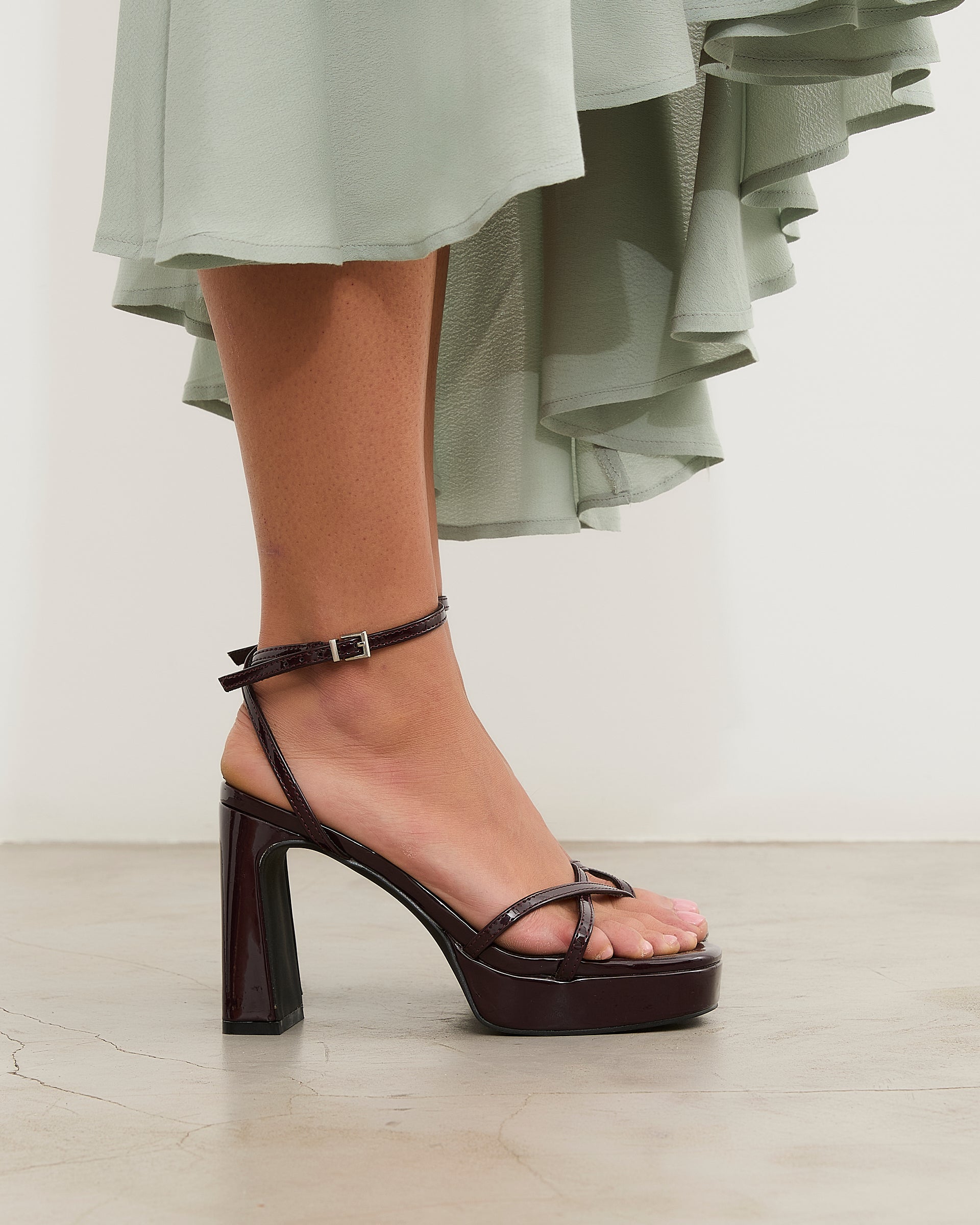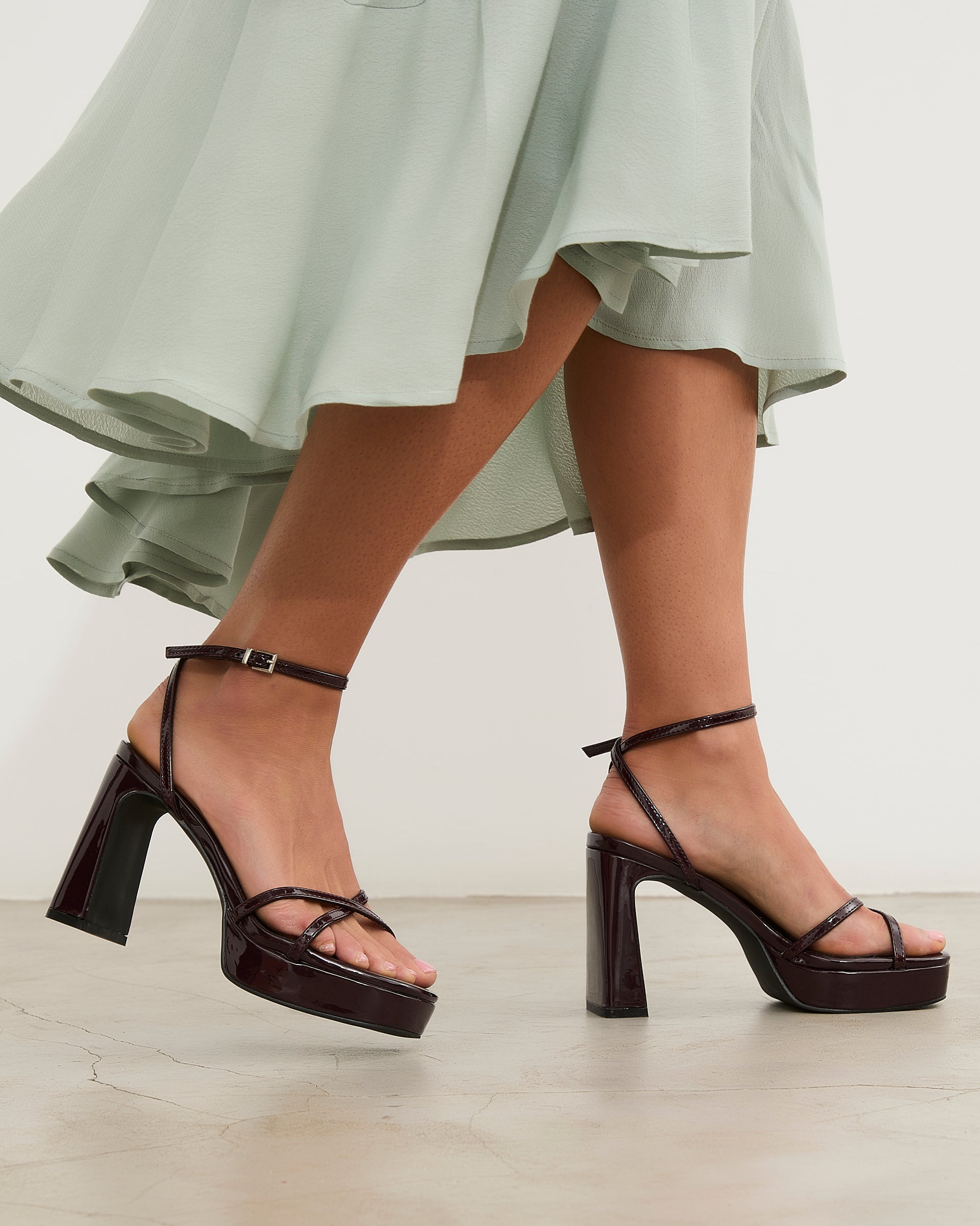 Sandalia de tacón en charol color burdeos y plataforma. Parte delantera abierta con tiras y tacón rectangular. Cierre de pulsera al tobillo con hebilla metálica.