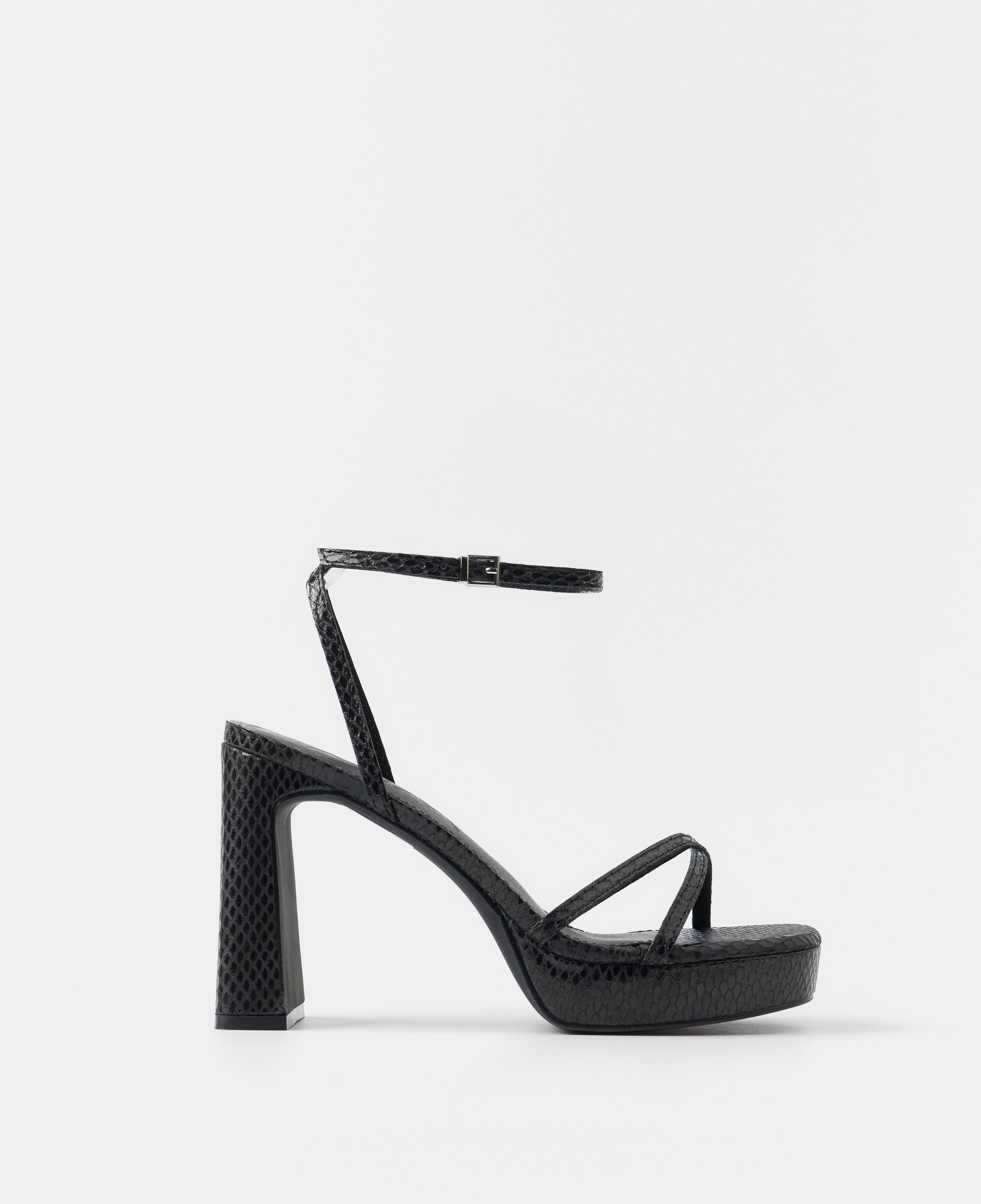Sandalia de tacón con plataforma en color negro con grabado de serpiente con tiras en la parte delantera. Cierre en el tobillo con hebilla.