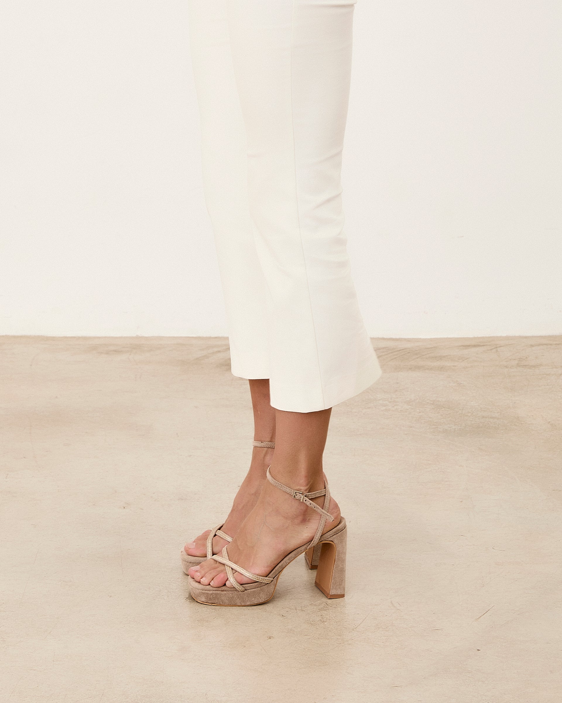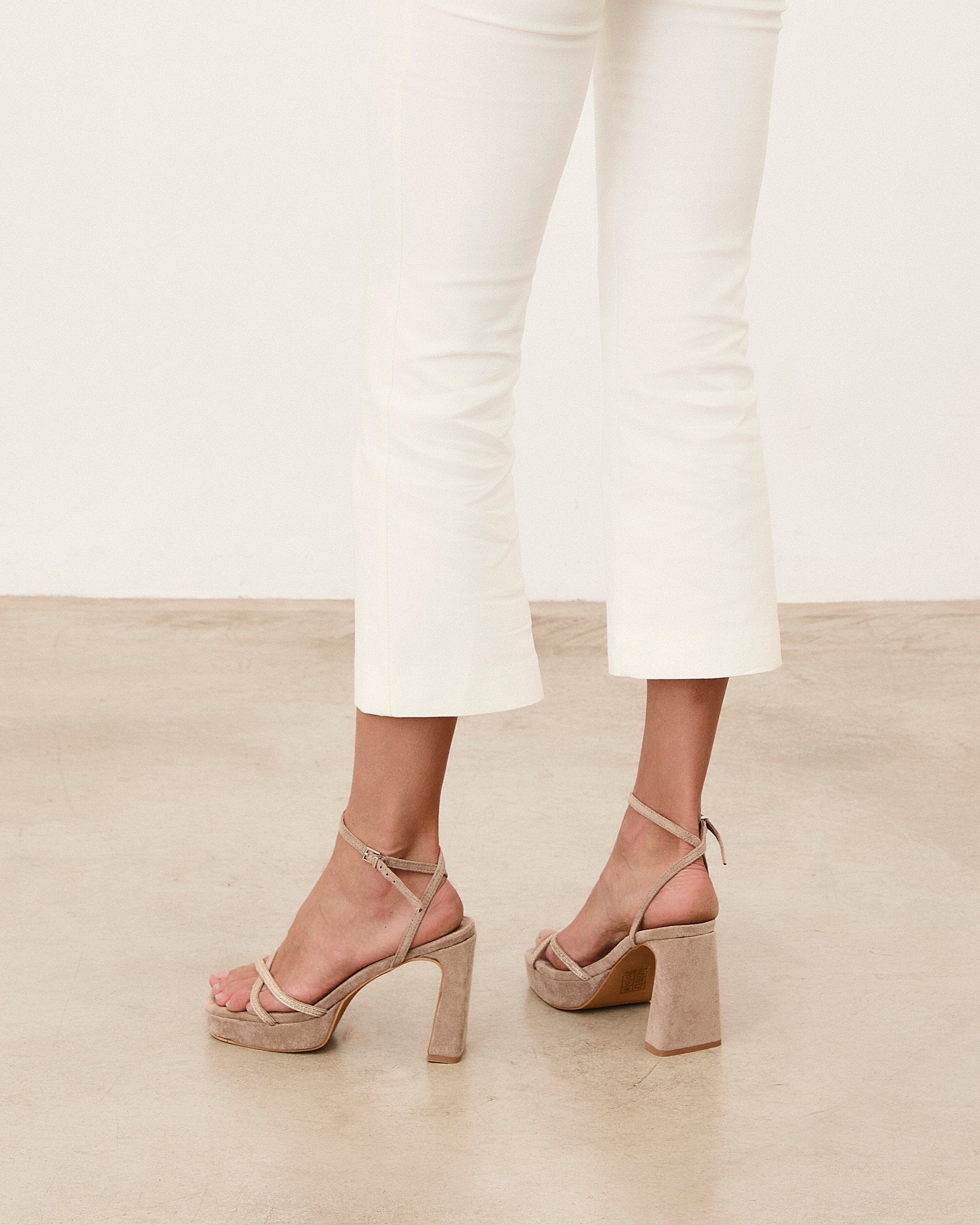 Sandalia de tacón con plataforma en ante vegano color topo con tiras en la parte delantera. Cierre en el tobillo con hebilla.