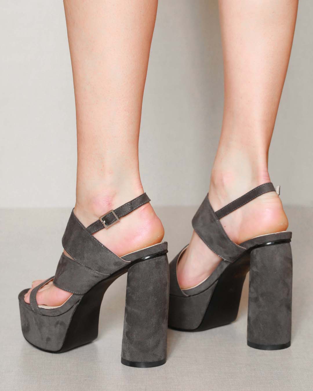 Sandalia de tacón con plataforma en ante vegano verde. Tacón redondo con mayor anchura en la base para su comodidad. Tiras cruzadas en el empeine y tira trasera con hebilla en la pulsera del tobillo. Tacón y plataforma forrados con material.