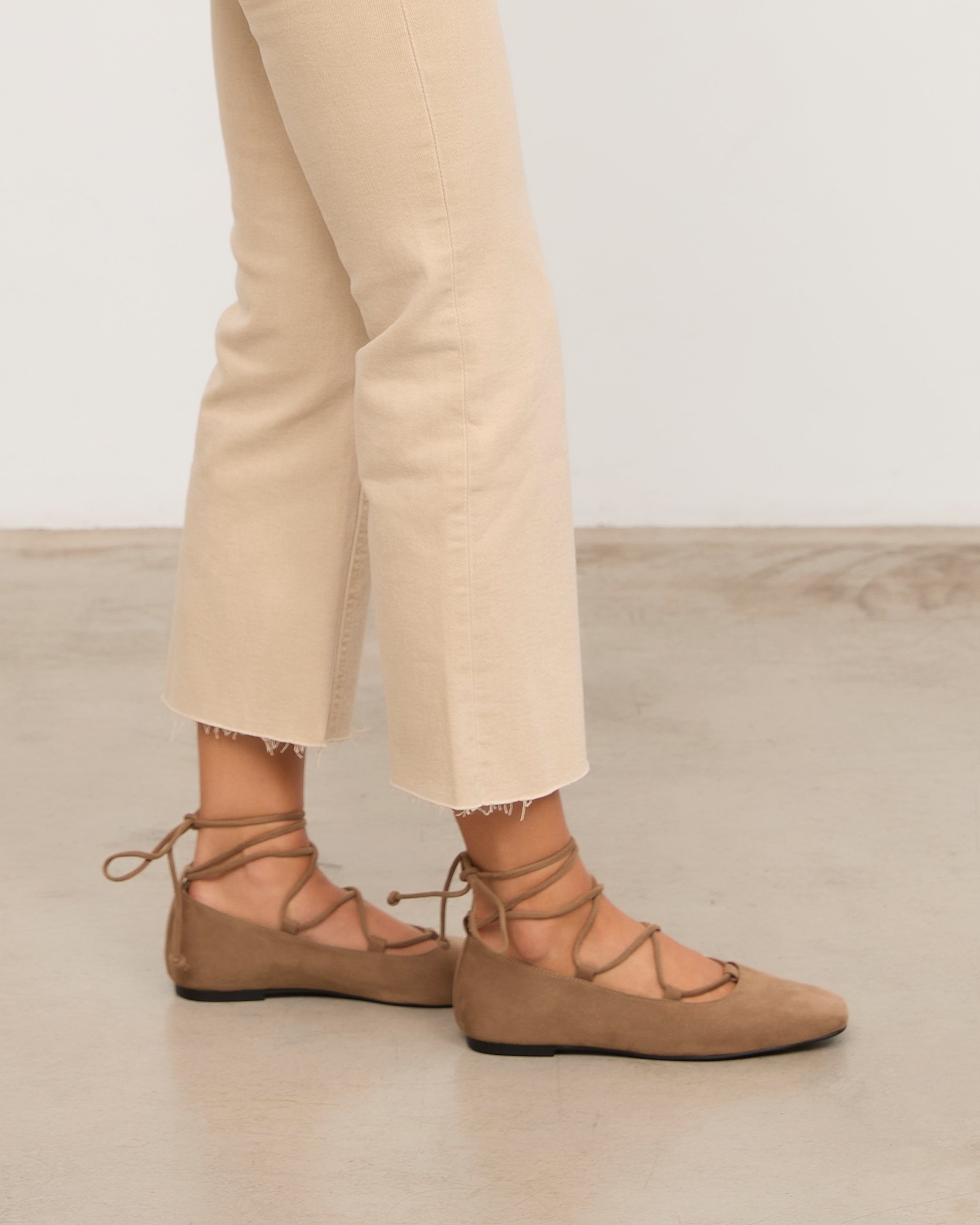 Zapato plano cerrado con puntera cuadrada en ante color topo con grabado de serpiente. Detalle de ajuste con cordones al tobilo.