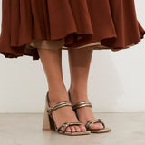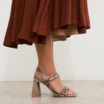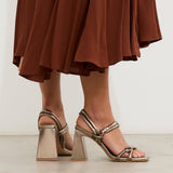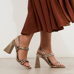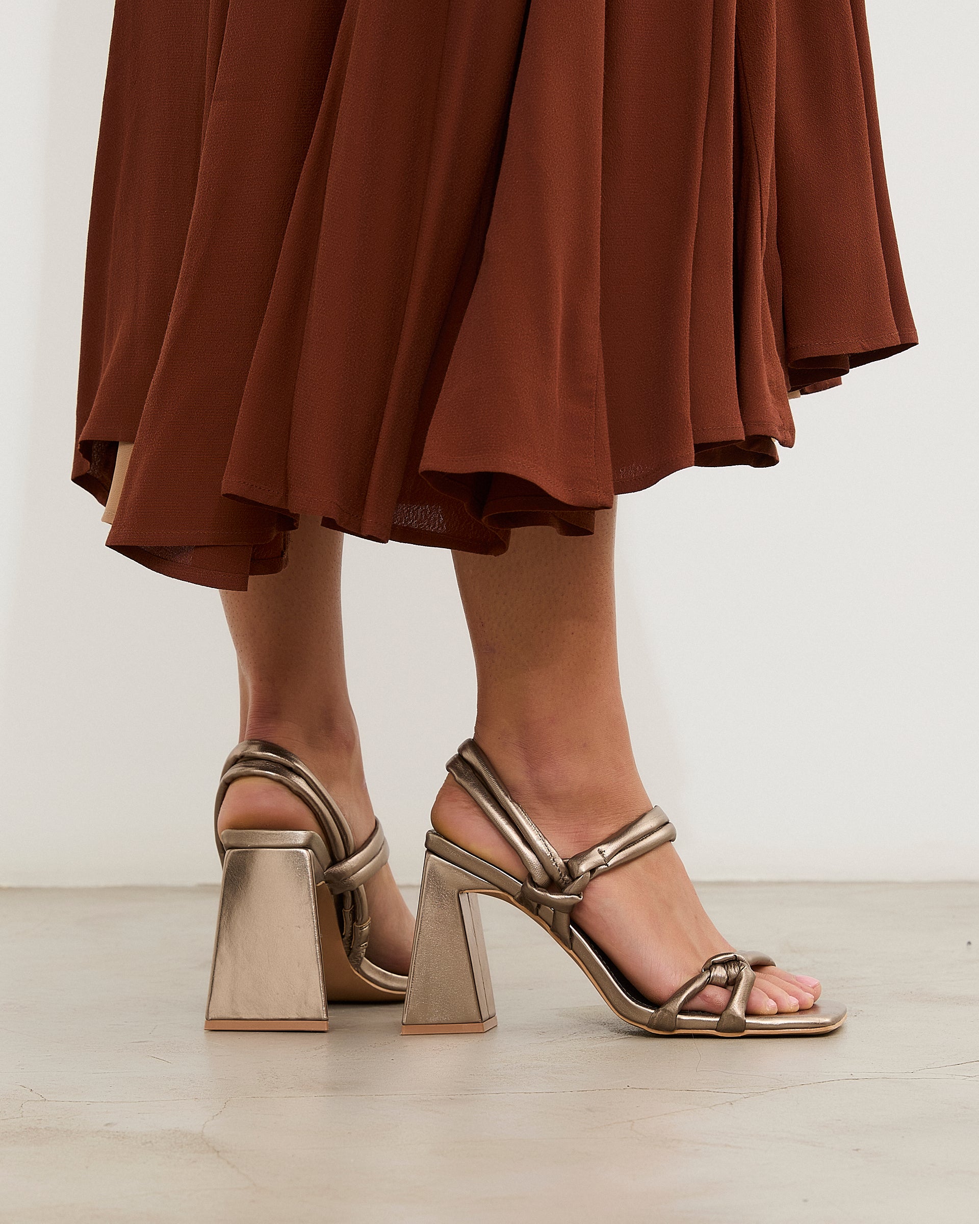 Sandalia de tacón con puntera cuadrada en color azul metalizado. Compuesto por tiras acolchadas en parte delantera y trasera anudades en el laterial exterior. Elástico para ajuste en tira trasera. Tacón ancho geométrico.