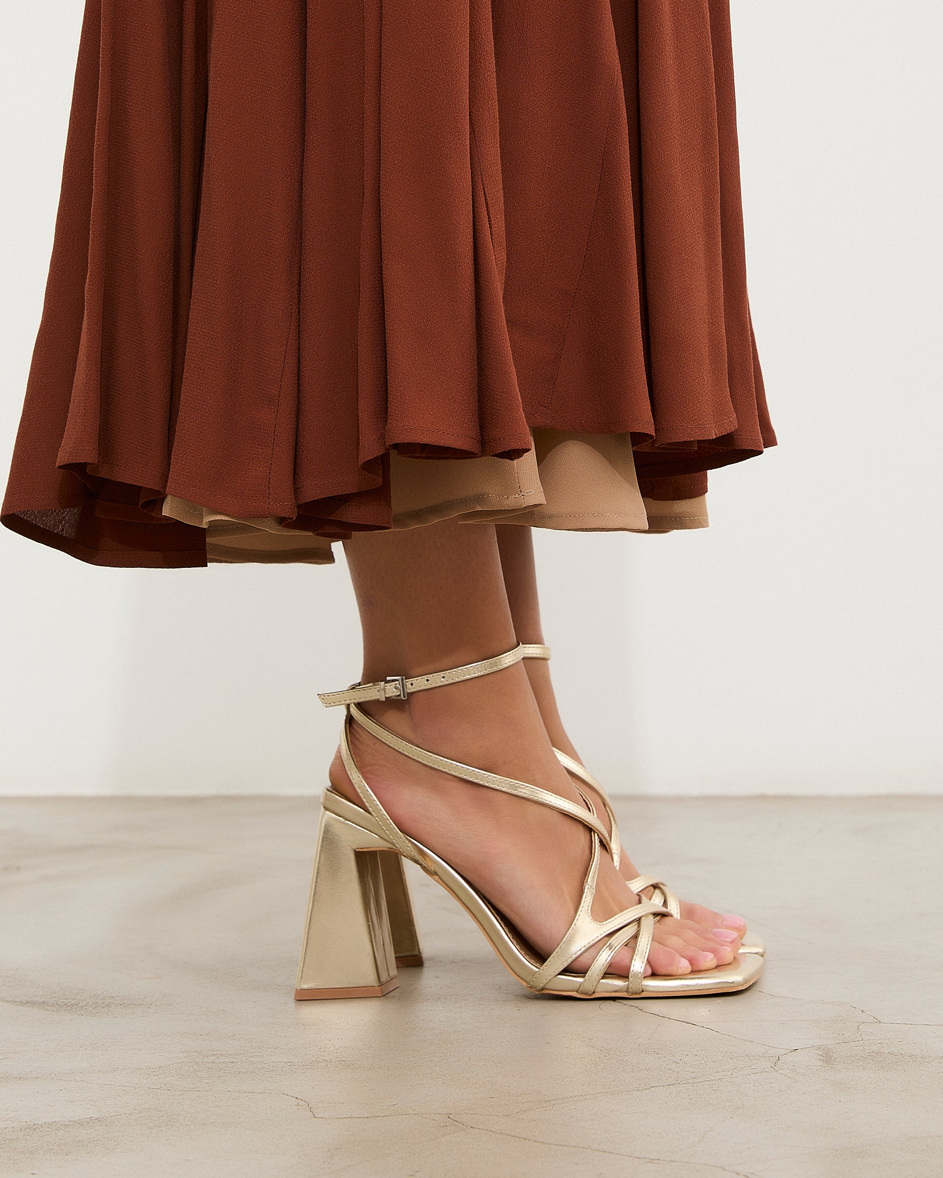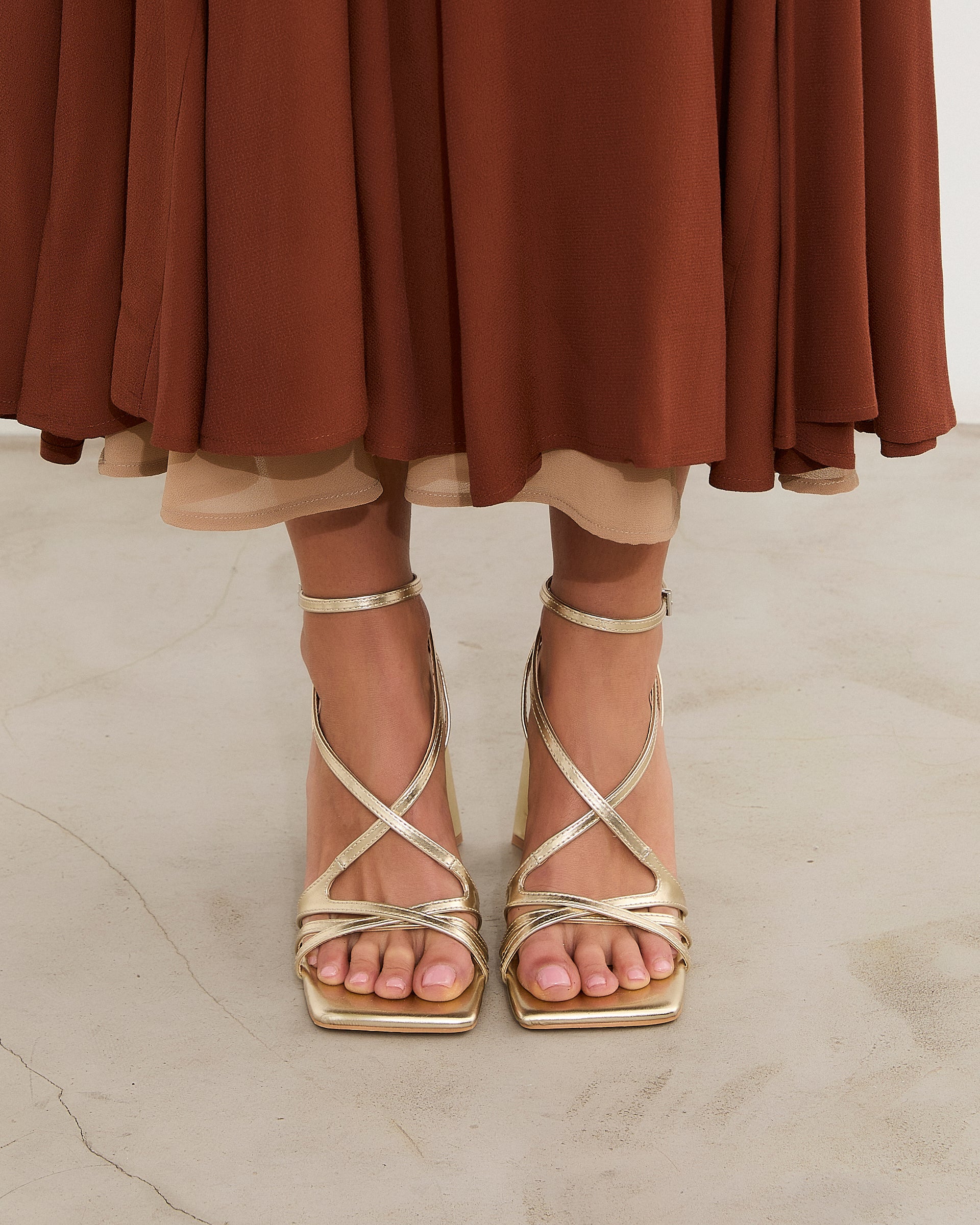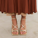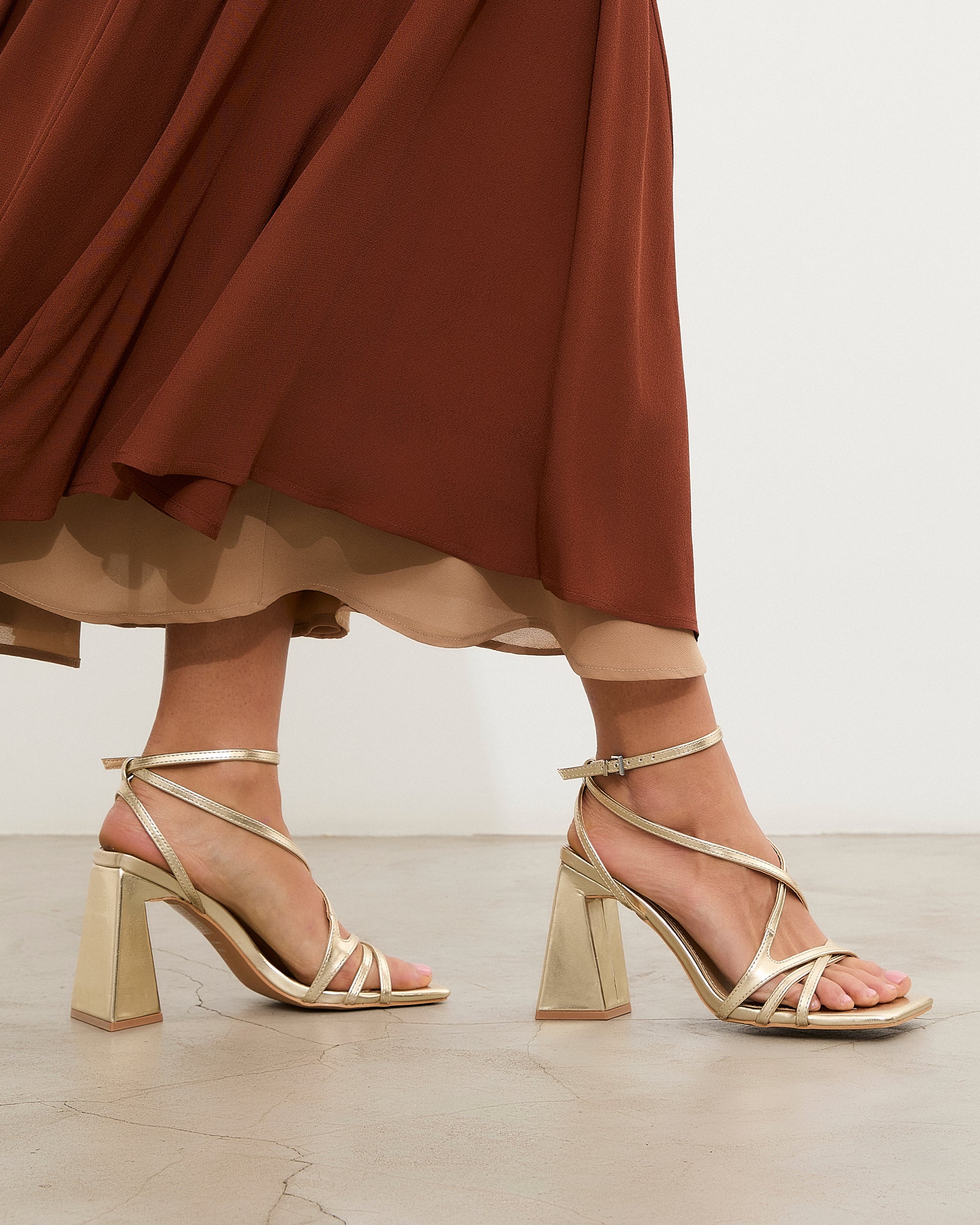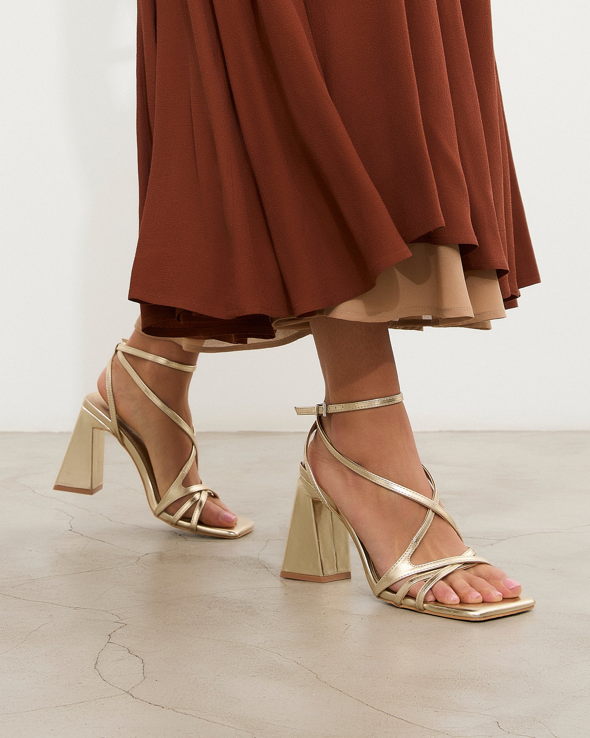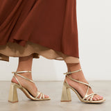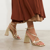 Sandalia de tacón con puntera cuadrada en color dorado. Compuesto por tiras cruzadas en el empeine con cierre en tobillo con hebilla. Tacón ancho geométrico.