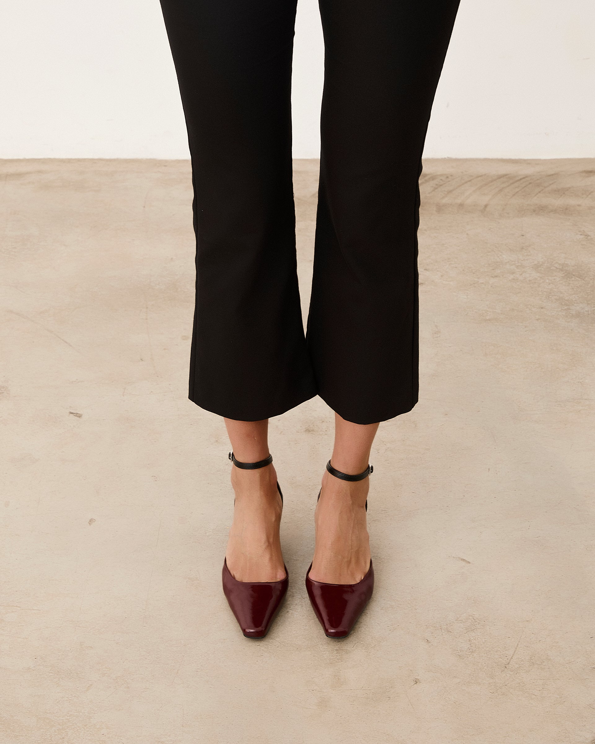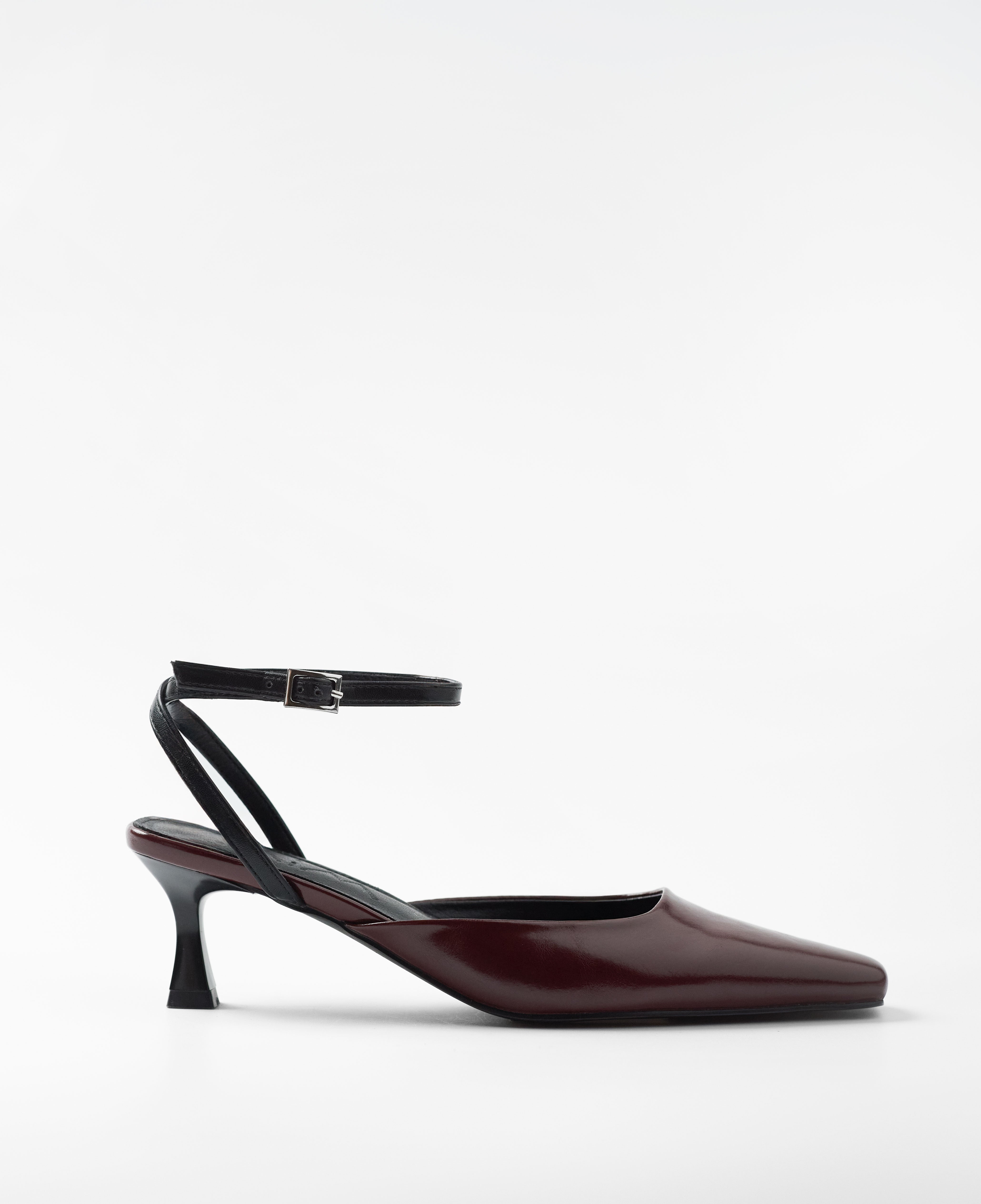 Tacón cerrado de tacón tipo aguja con acabado en punta en color burdeos. Pulsera para cierre en tobillo.