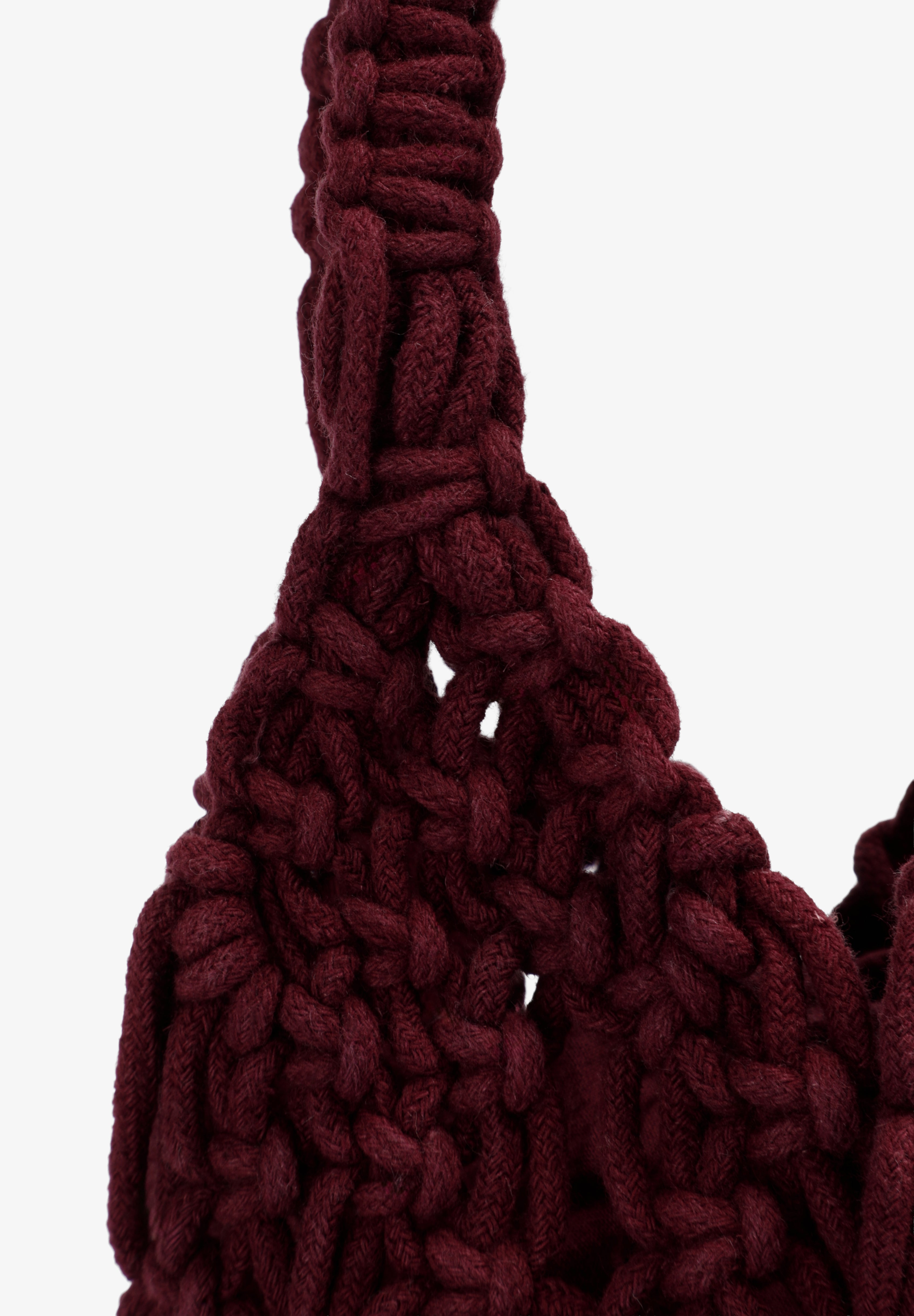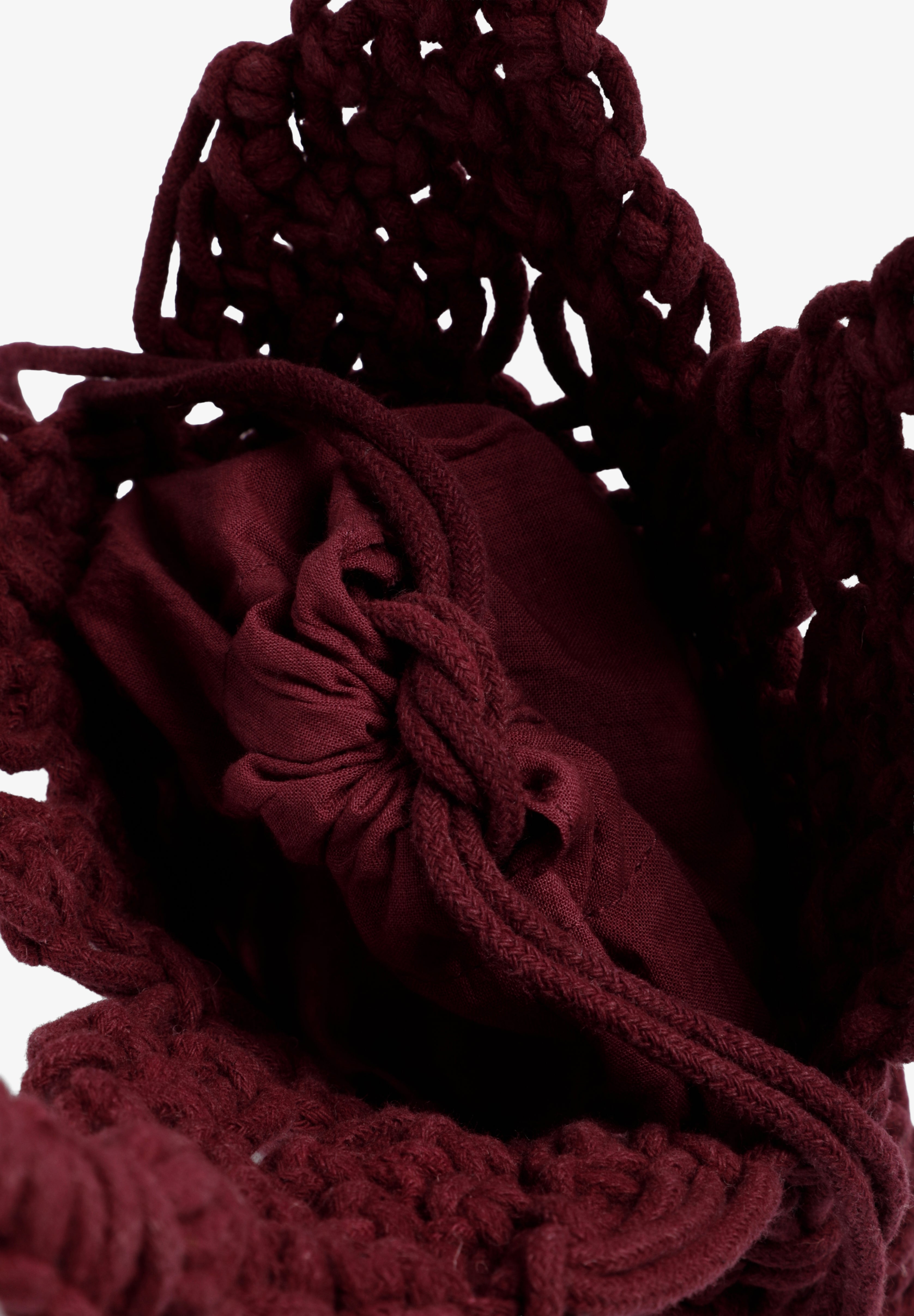 Bolso de mano trenzado rectangular con dos asas en color burdeos. Bolsa de tela interior.