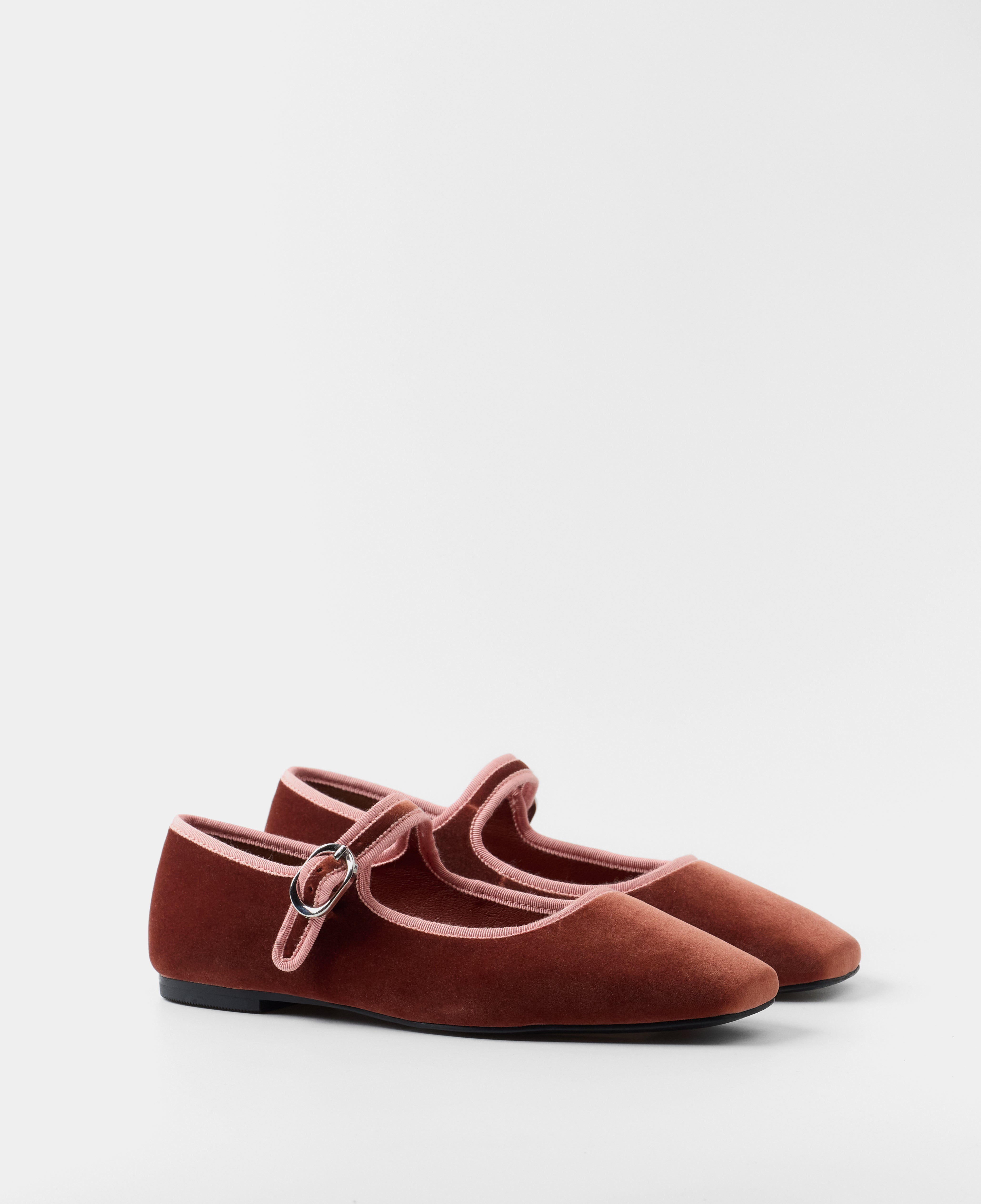Zapato cerrado estilo mercedita en terciopelo color teja con punta cuadrada. Detalle de ribete a contraste en color rosa palo.