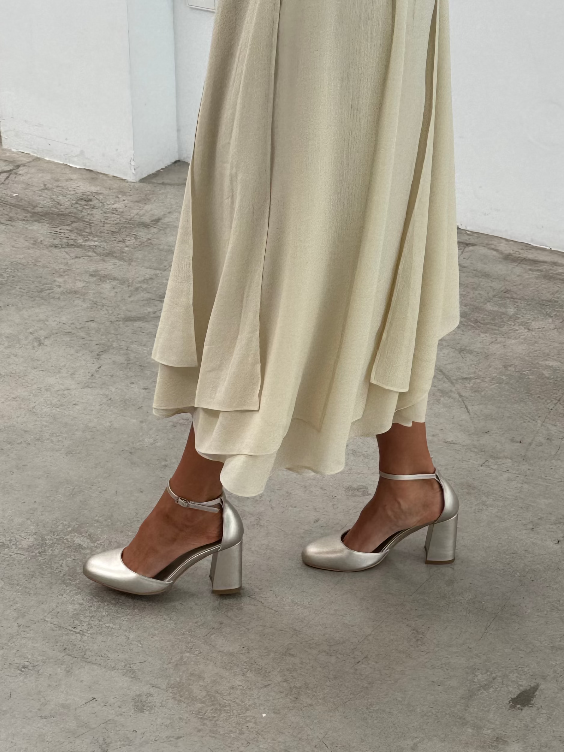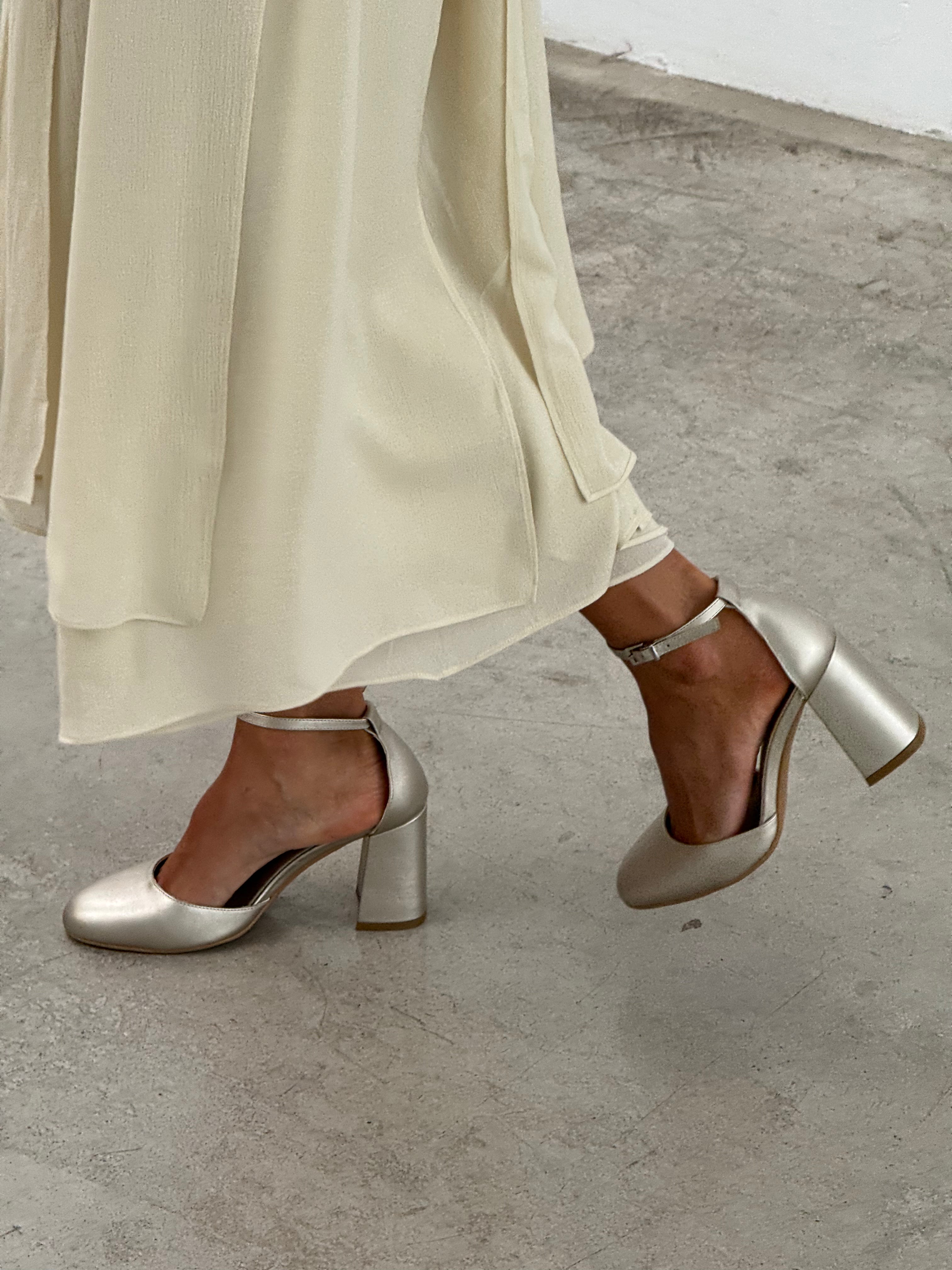 Zapato de tacón cerrado con puntera redonda en color champán. Talonera con pulsera al tobillo. Tacón cuadrado.