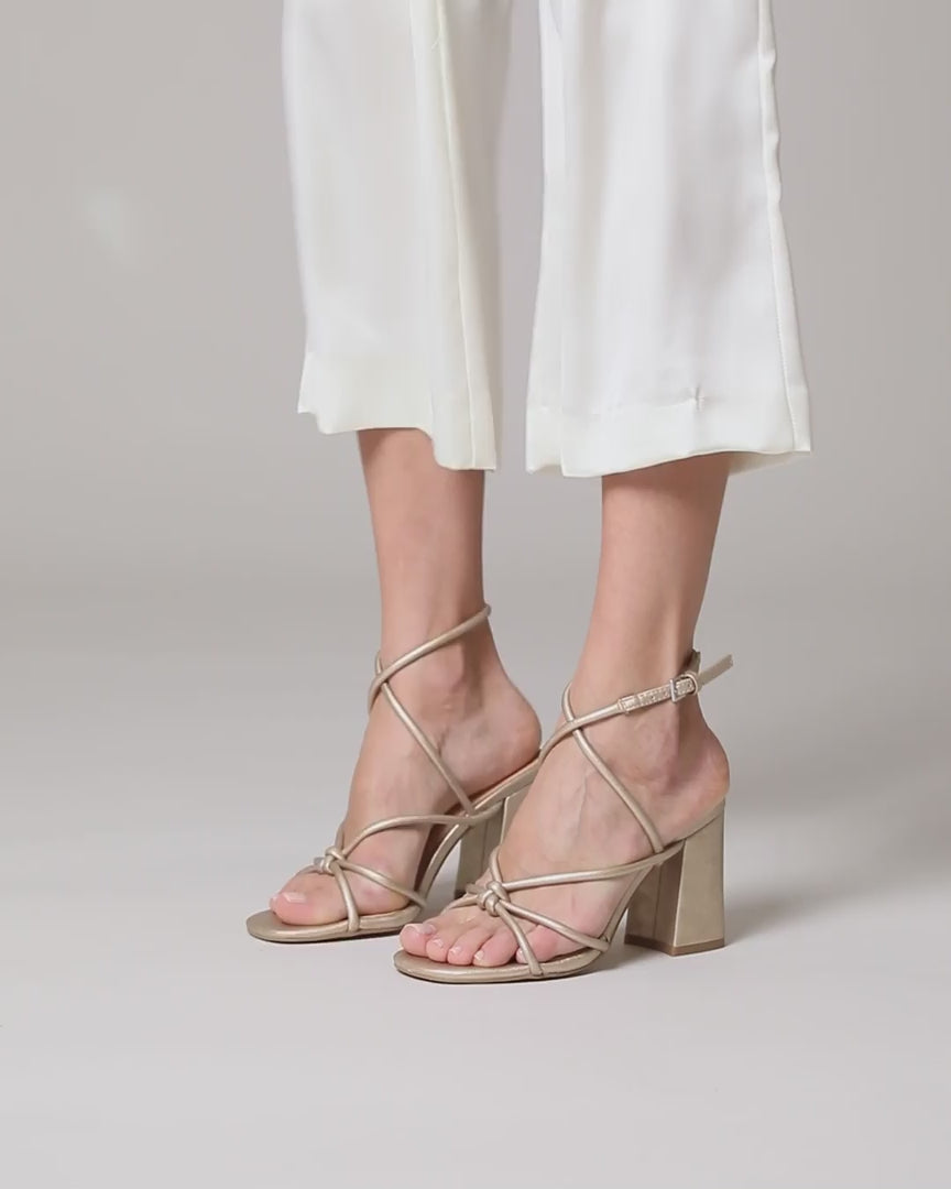 Sandalia de tacón en piel vegana color dorado. Parte delantera abierta sin plataforma con tiras en estrella y cierre de tiras al tobillo con hebilla metálica.