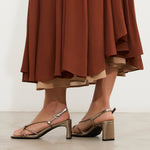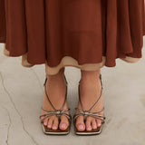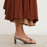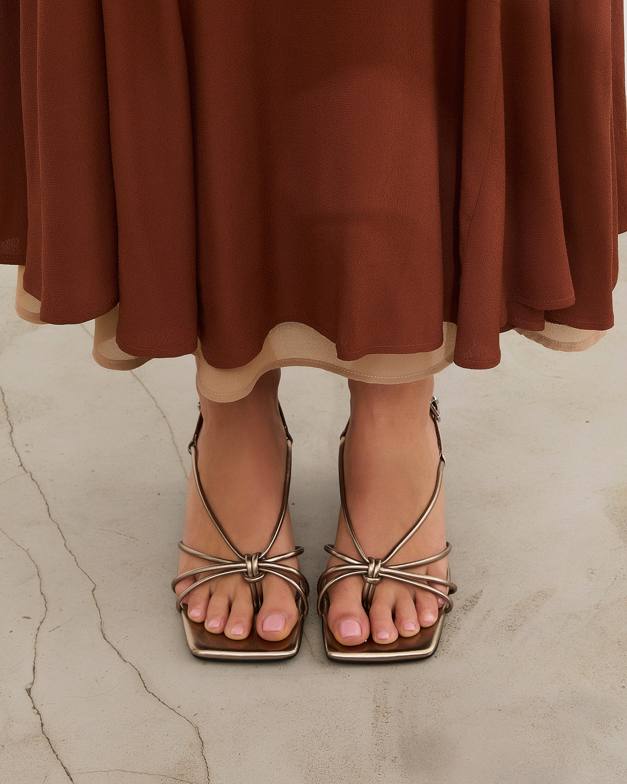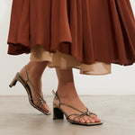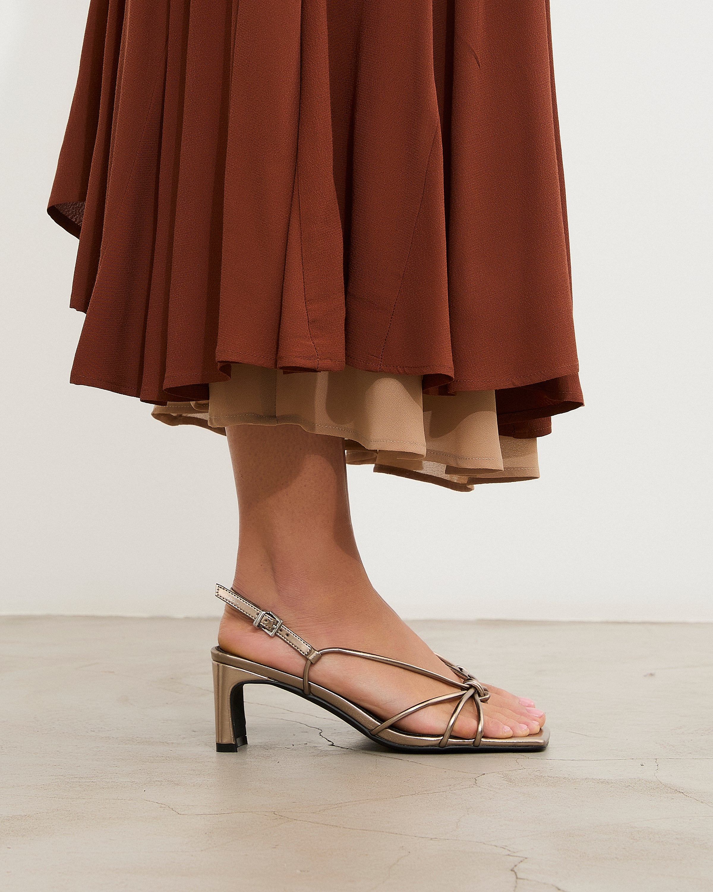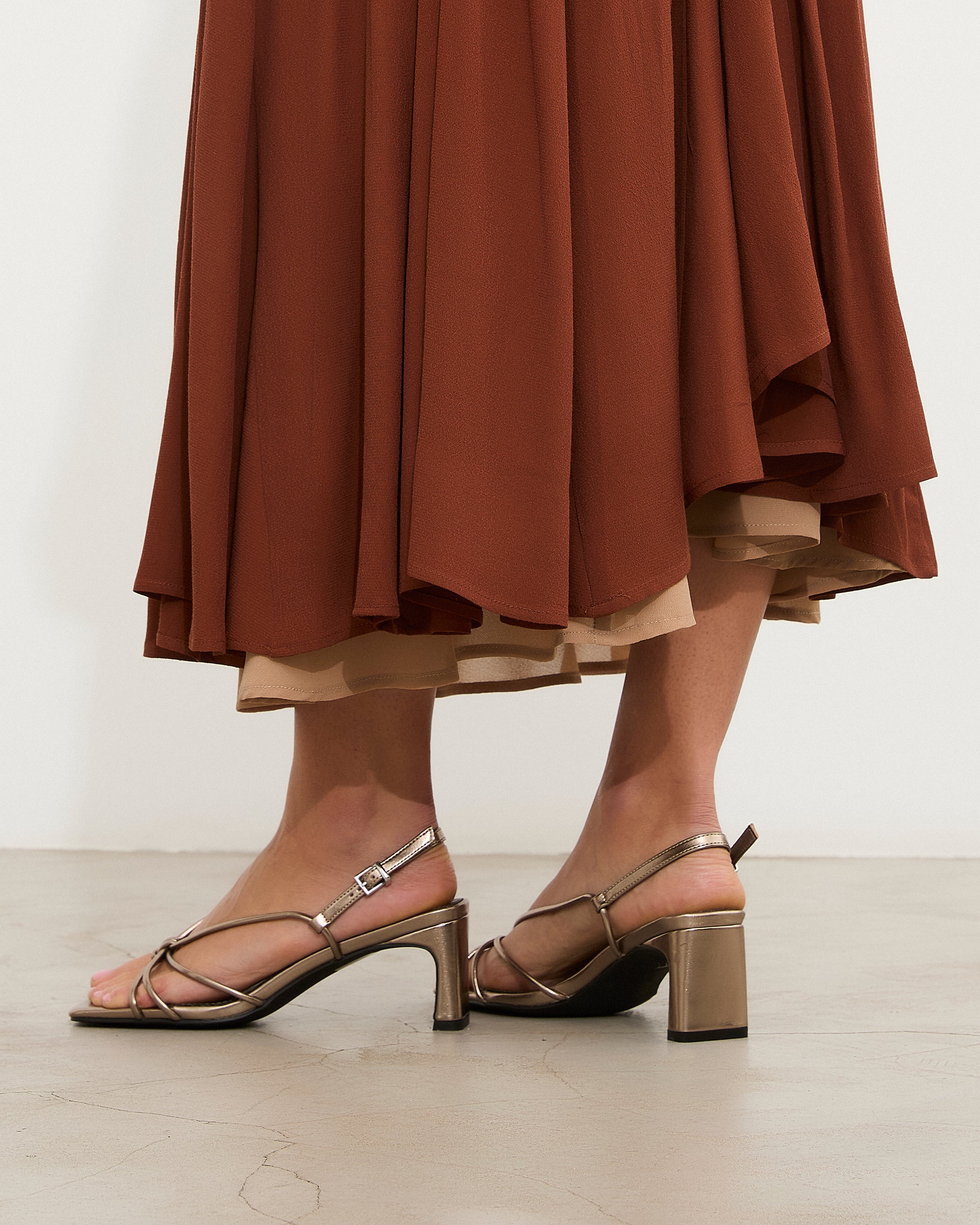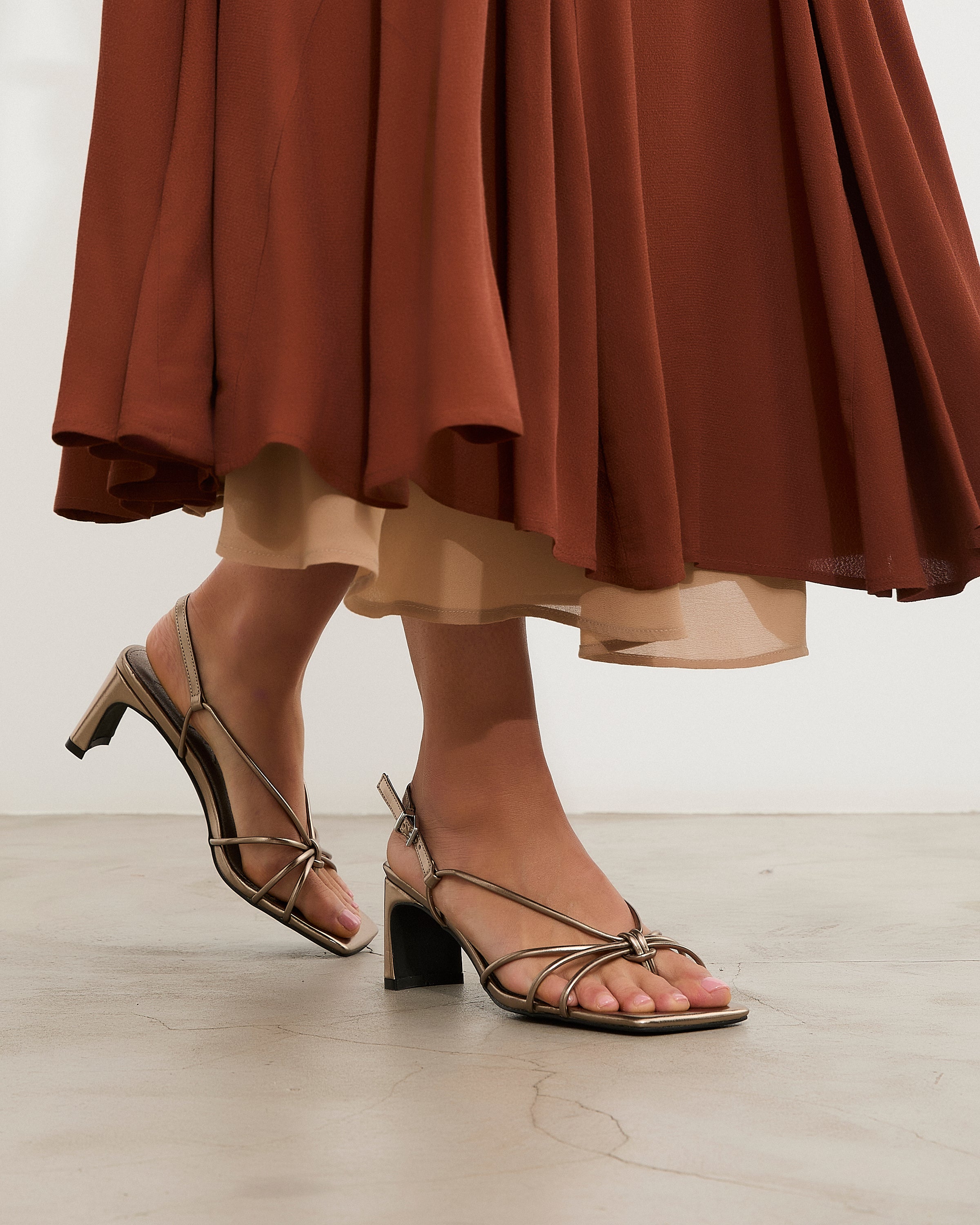 Sandalia de tacón con puntera cuadrada en color metalizado. Multiples tiras en la parte delantera unidades con sujección en dedo. Cinta tarsera para sujección en talón con hebilla. Tacón geométrico bajo.
