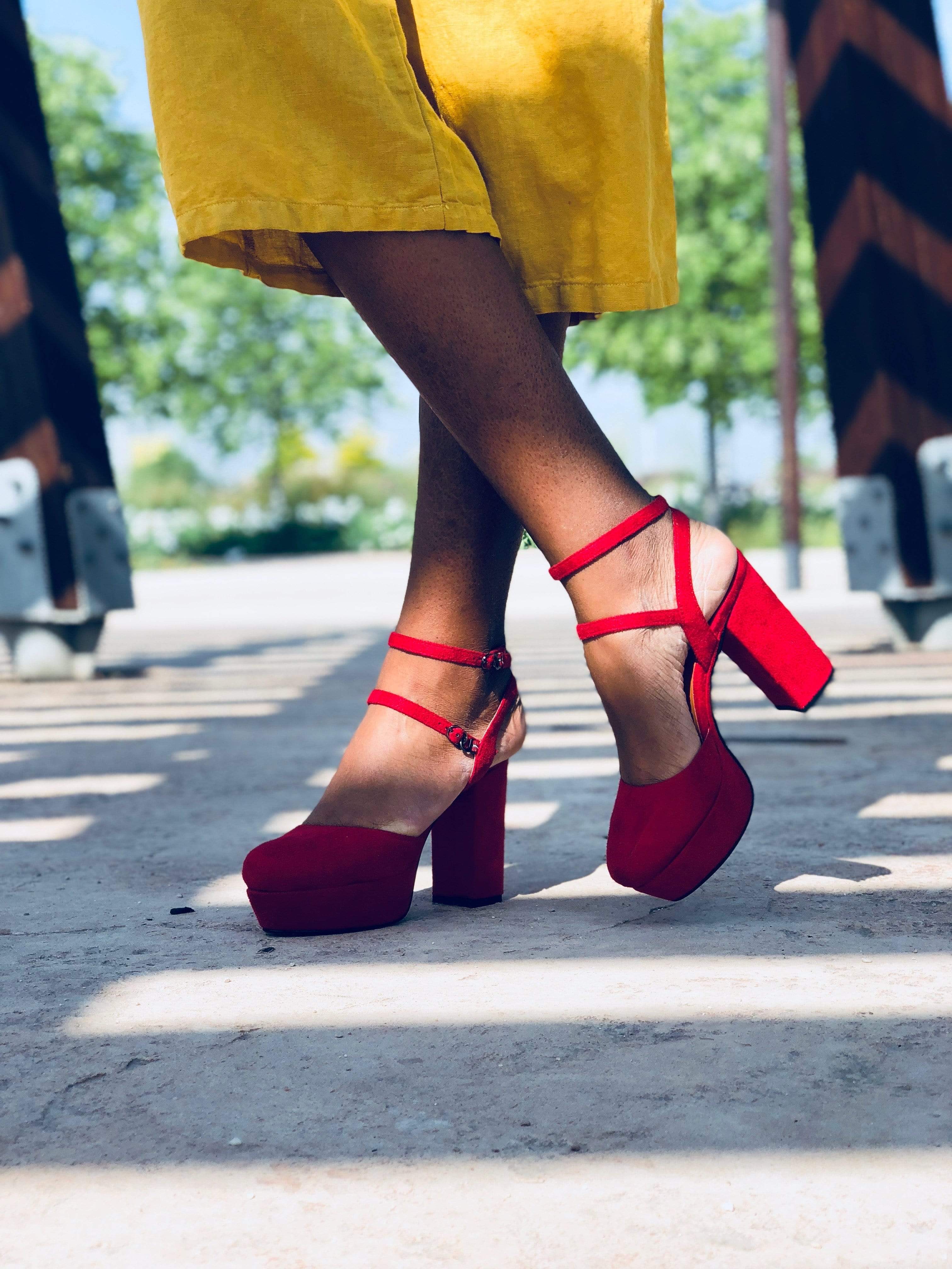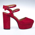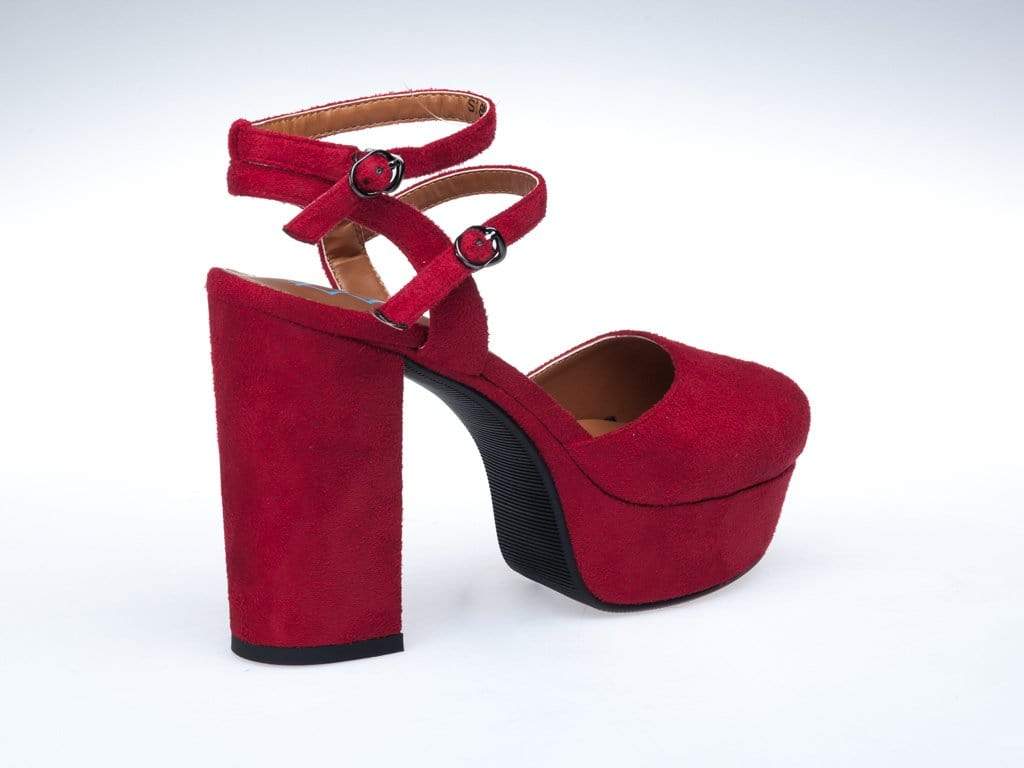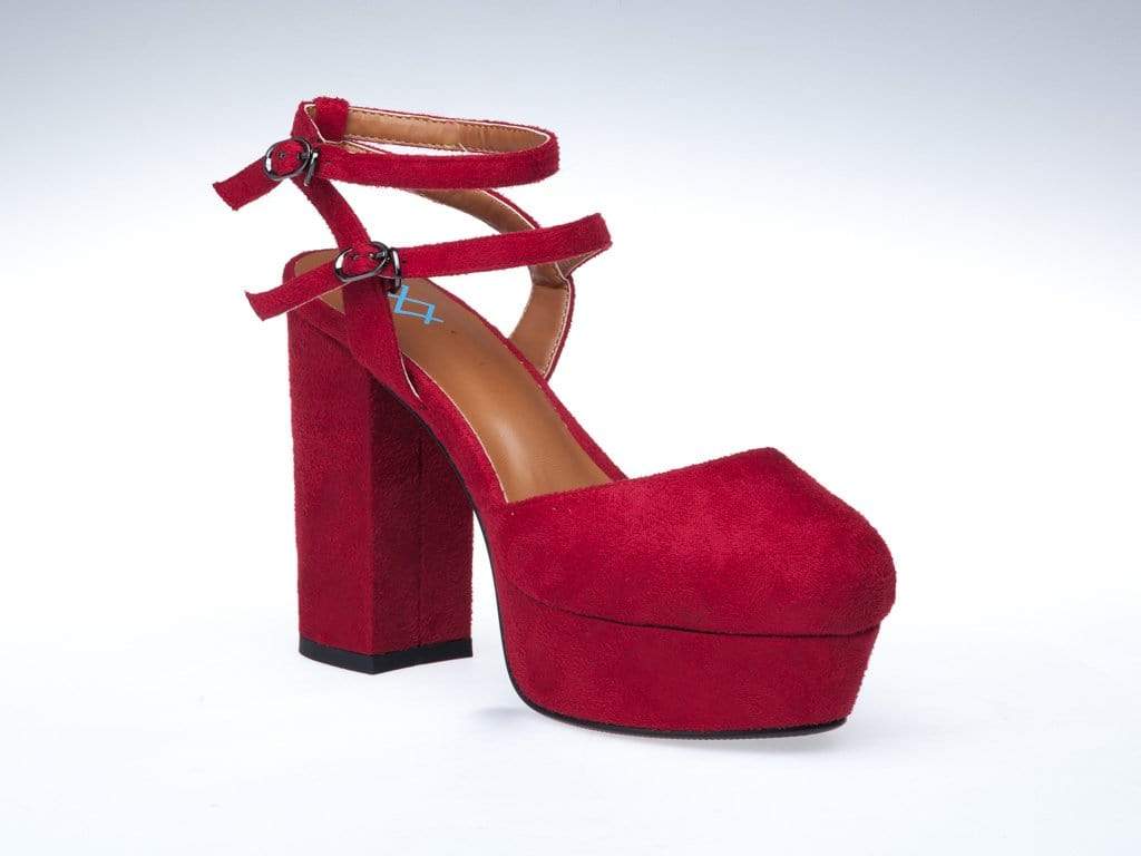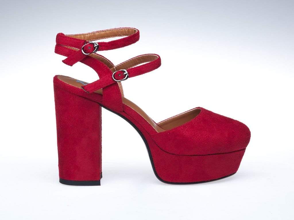 Tacón de color rojo, cerrado en la parte delantera. Cierre mediante dos cintas a la altura del tobillo con hebilla lateral.