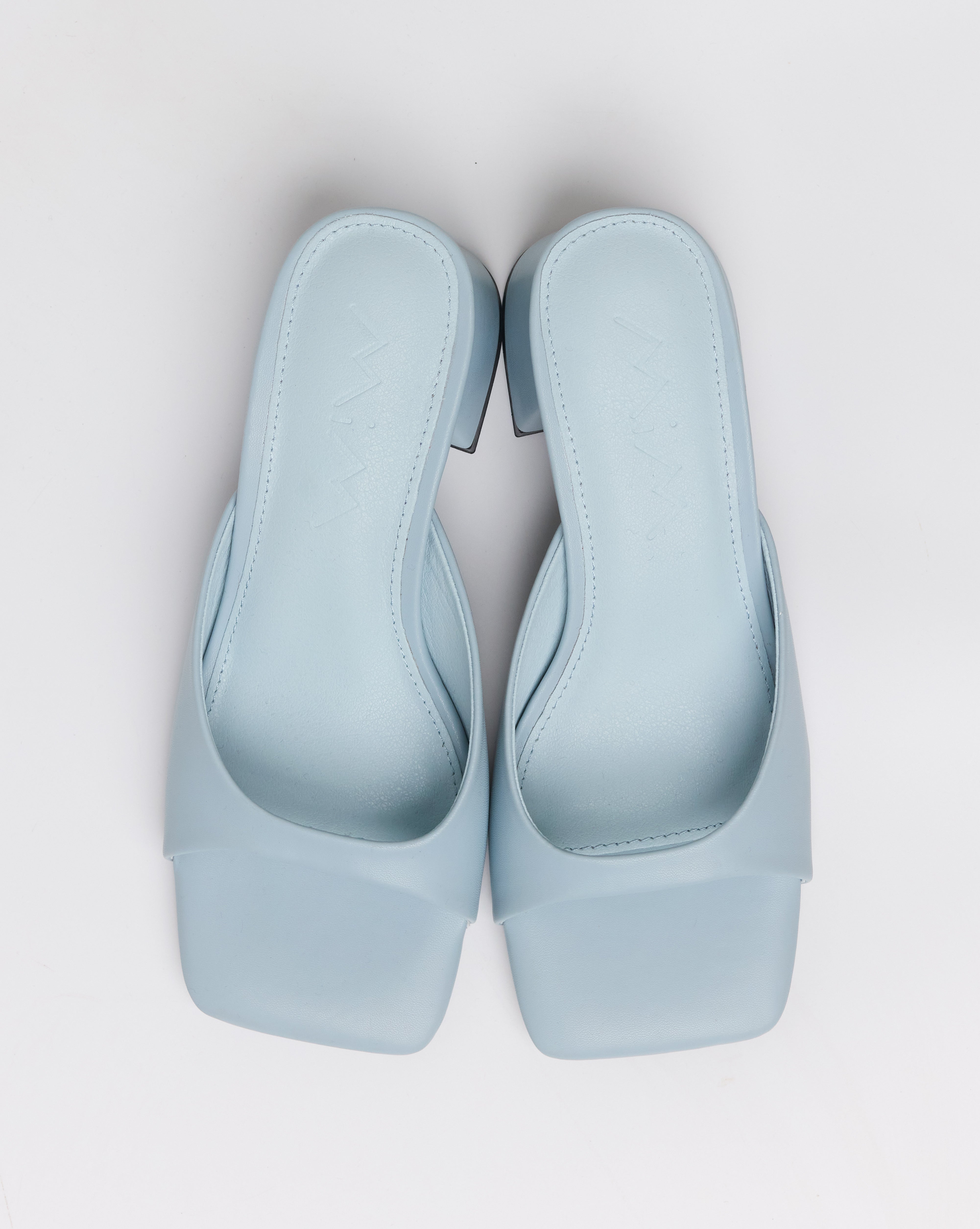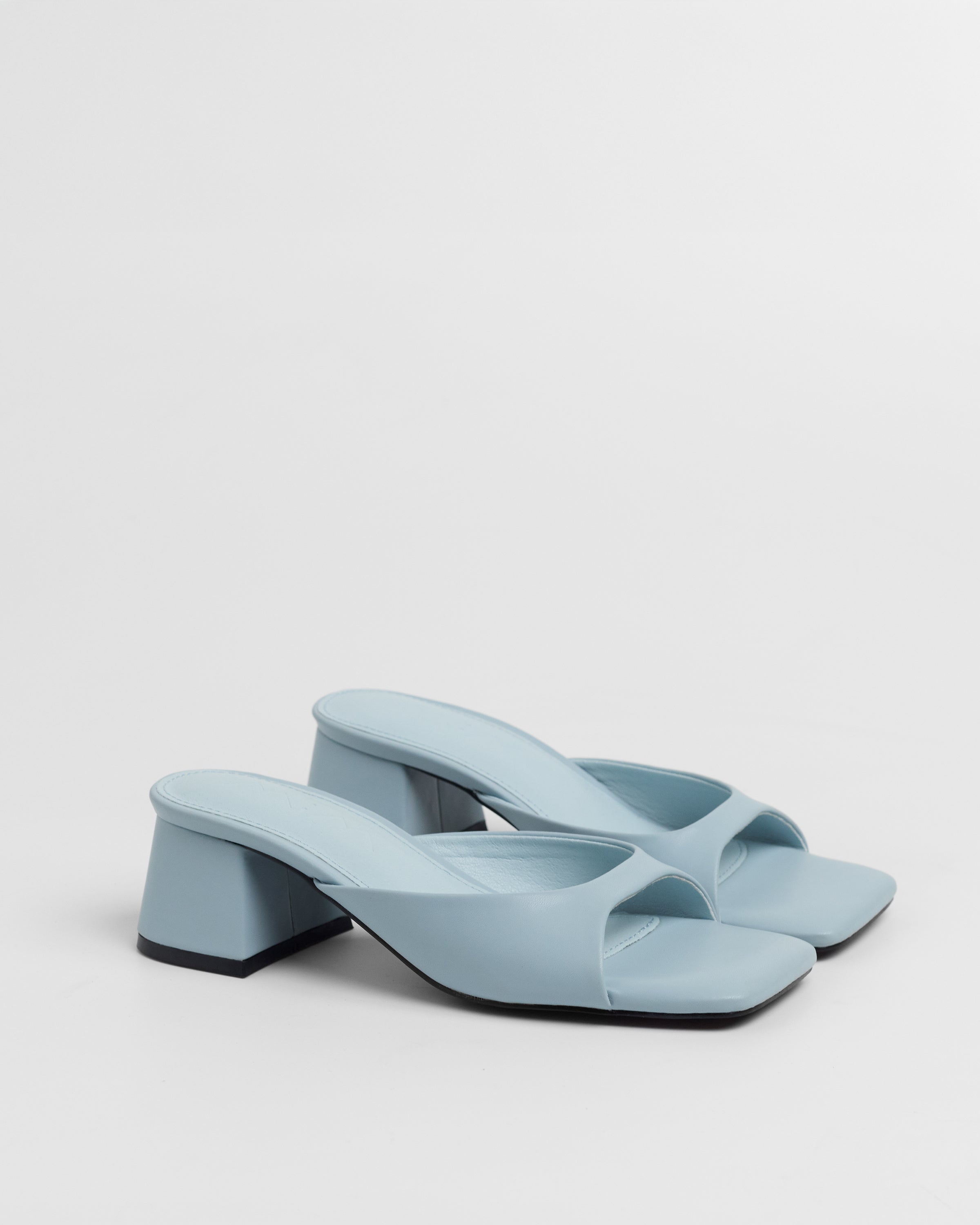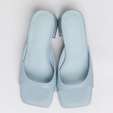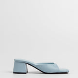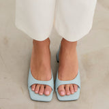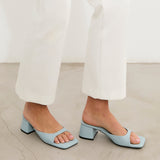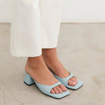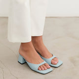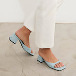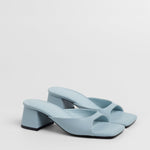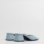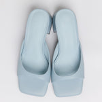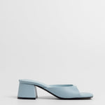 Sandalia de tacón tipo mule con puntera cuadrada en color celeste. Tira delantera envolvente en laterales. Tacón cuadrado bajo.