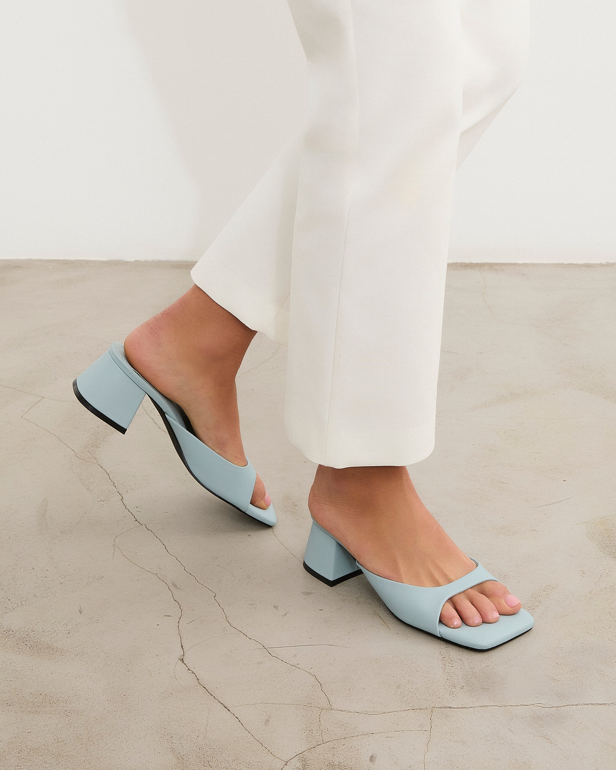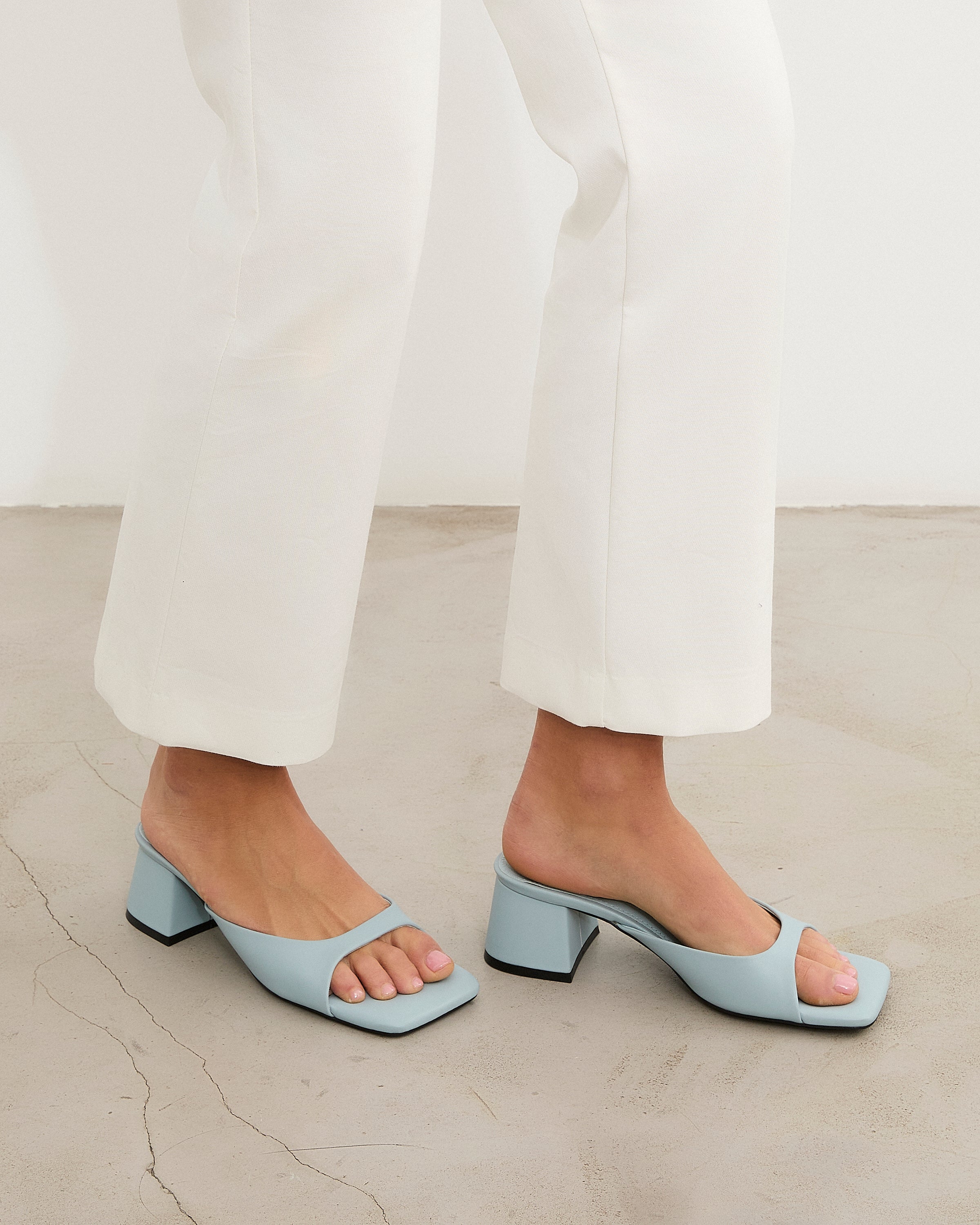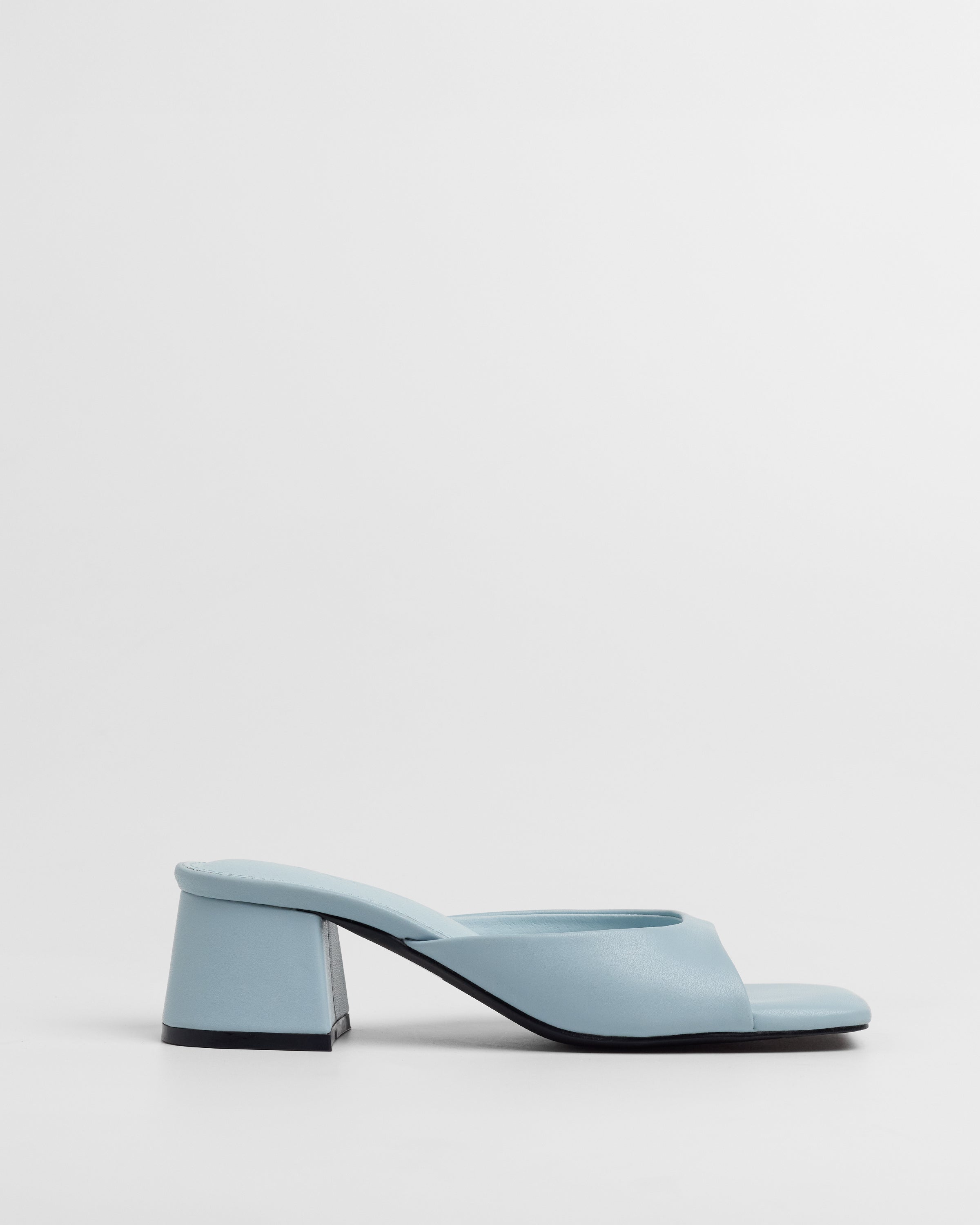 Sandalia de tacón tipo mule con puntera cuadrada en color celeste. Tira delantera envolvente en laterales. Tacón cuadrado bajo.