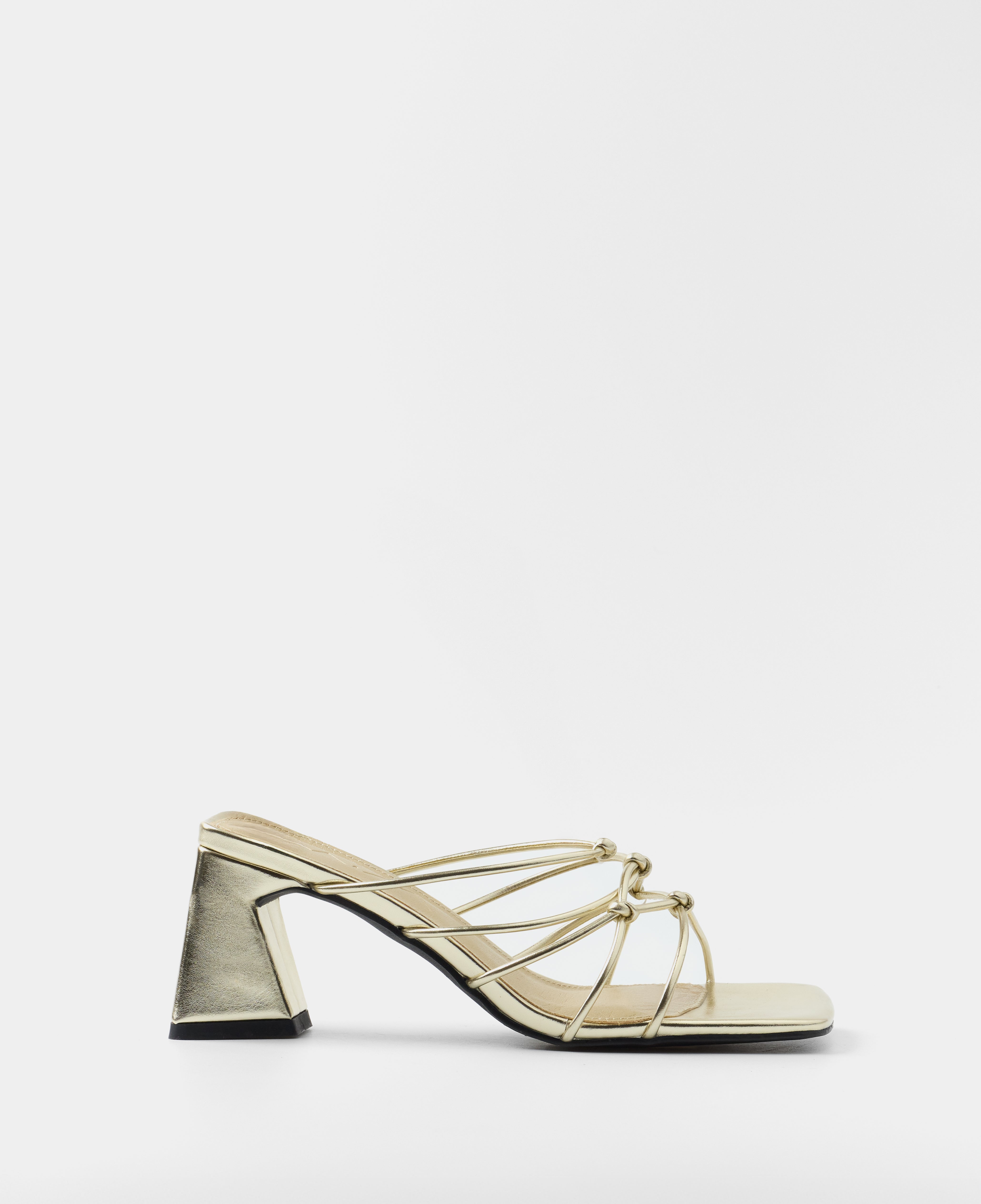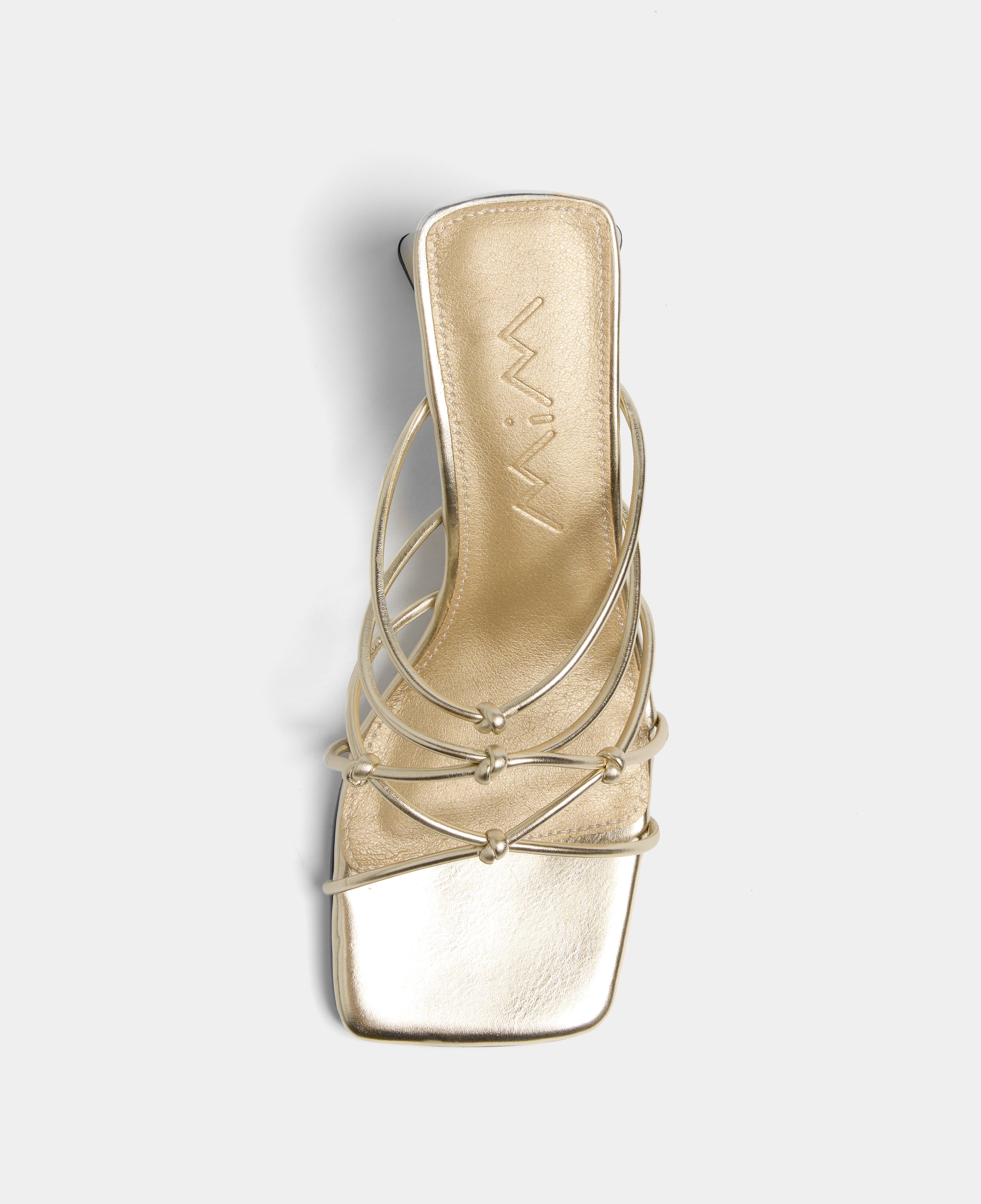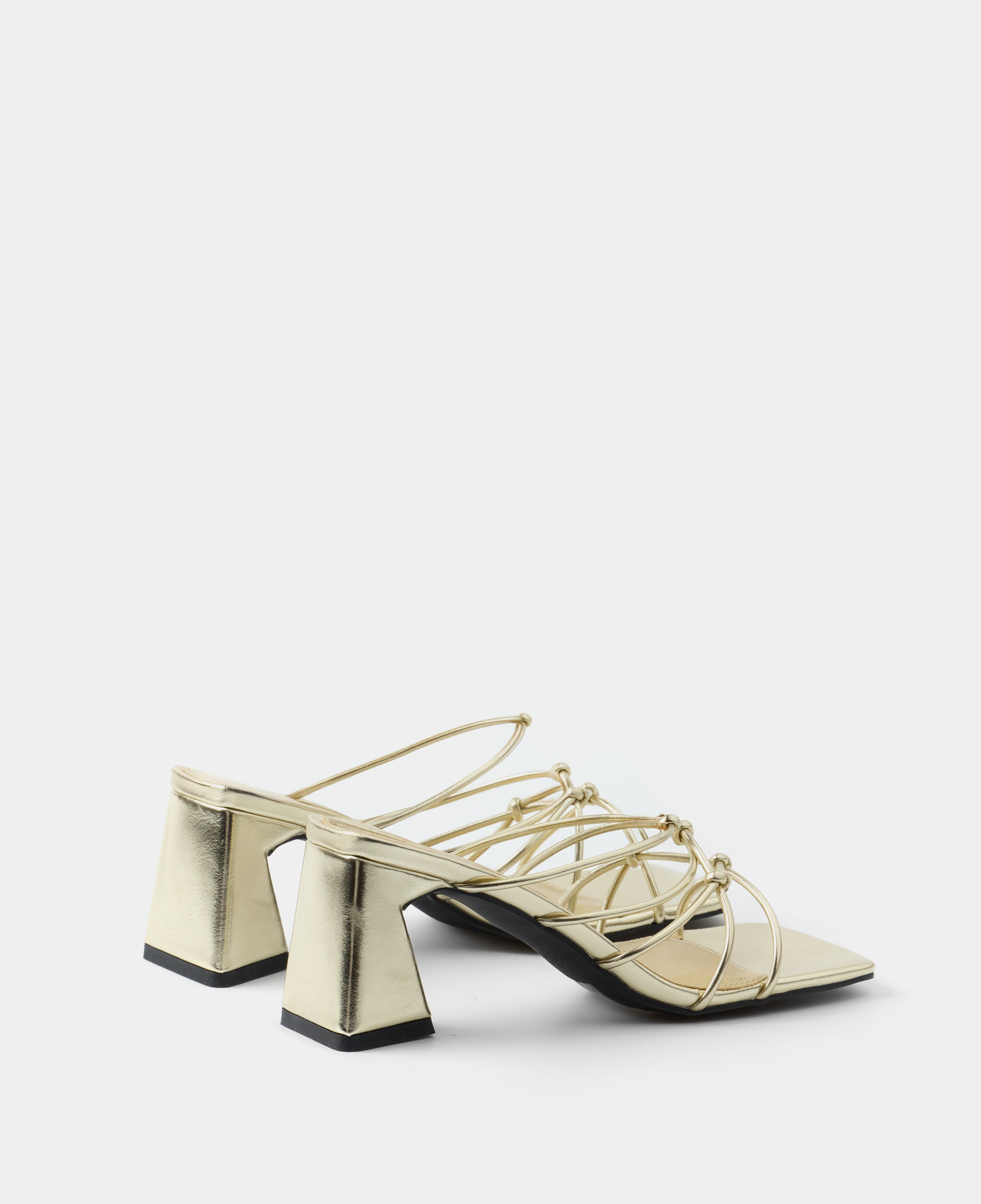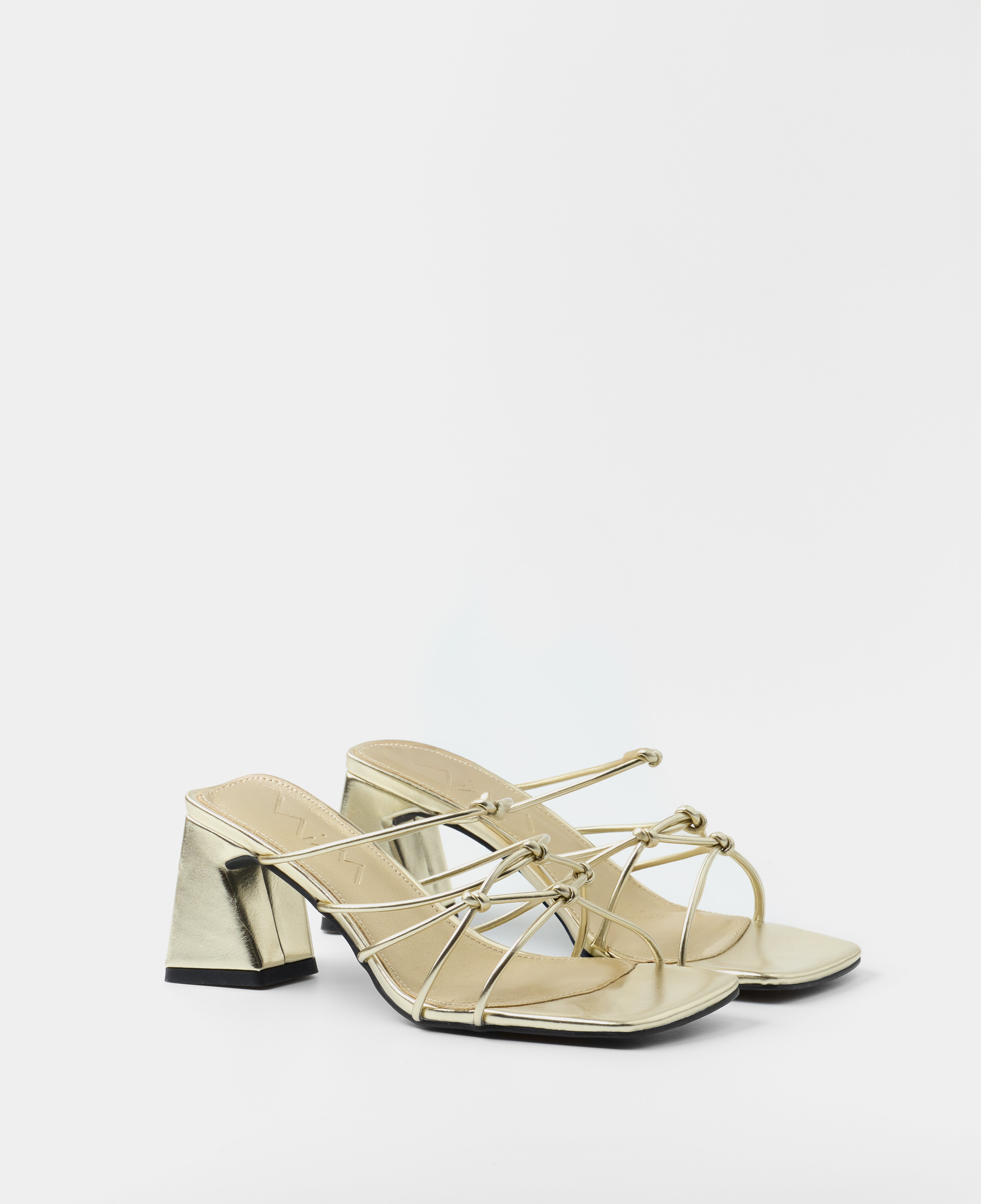 Sandalia de tacon en color dorado. Parte delantera formada con tiras anudadas.