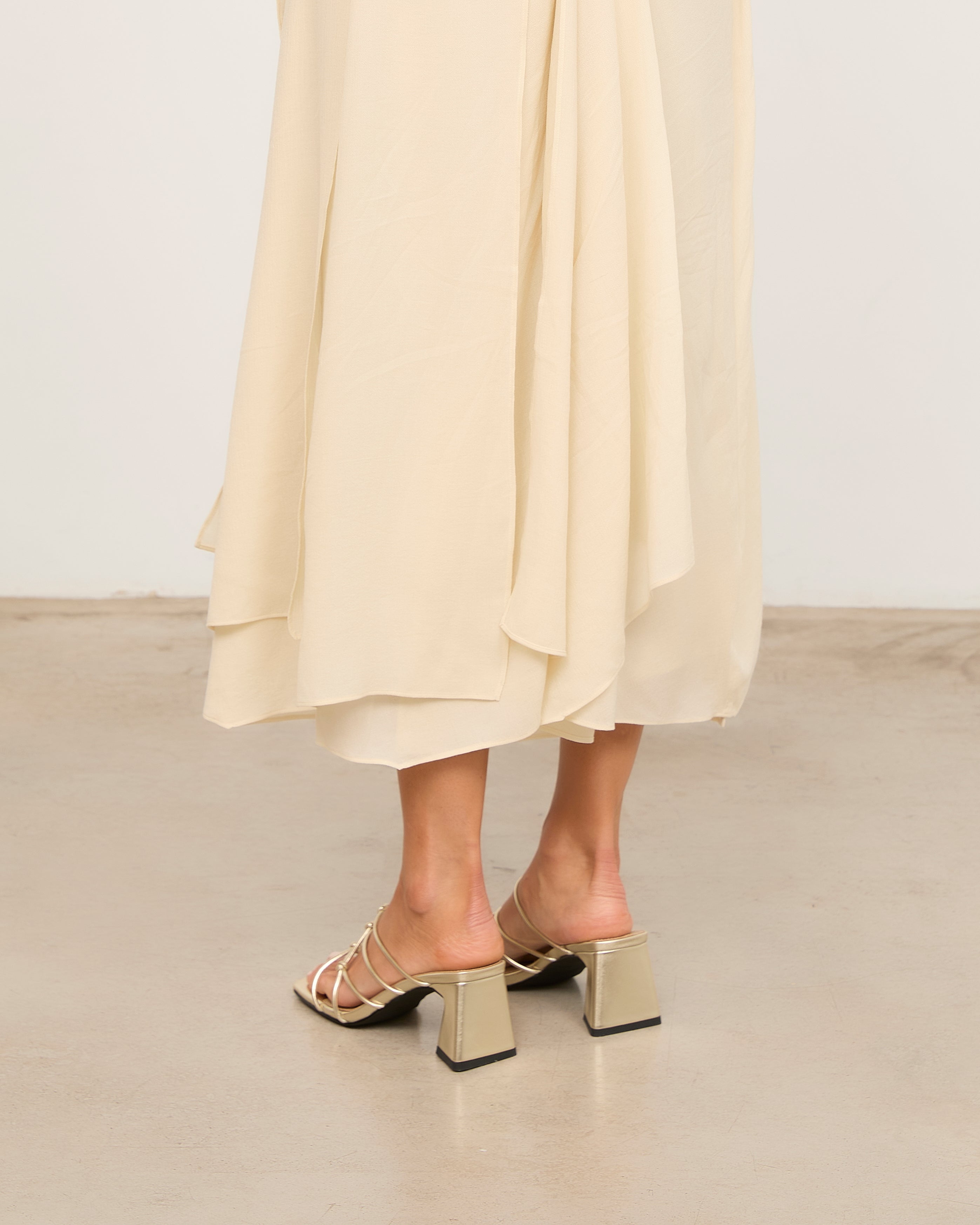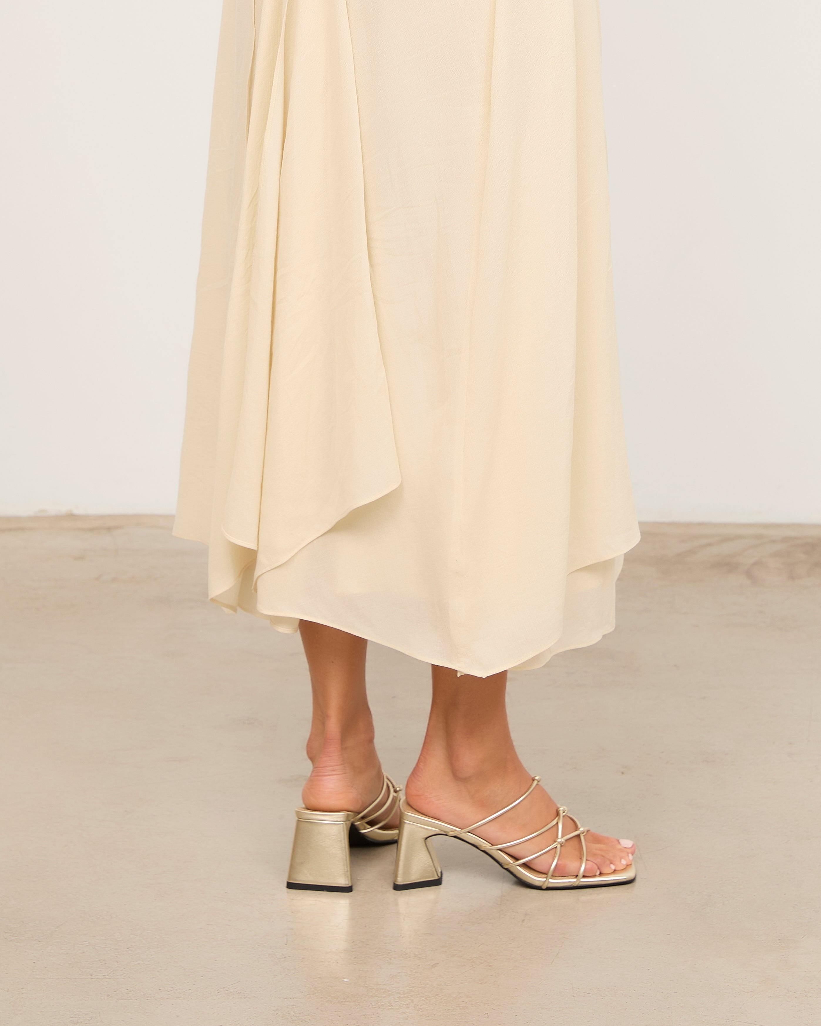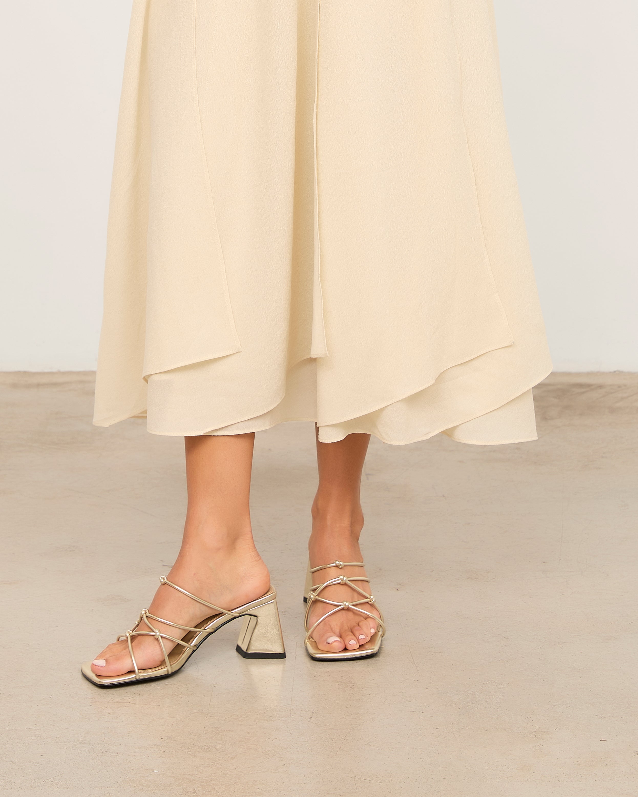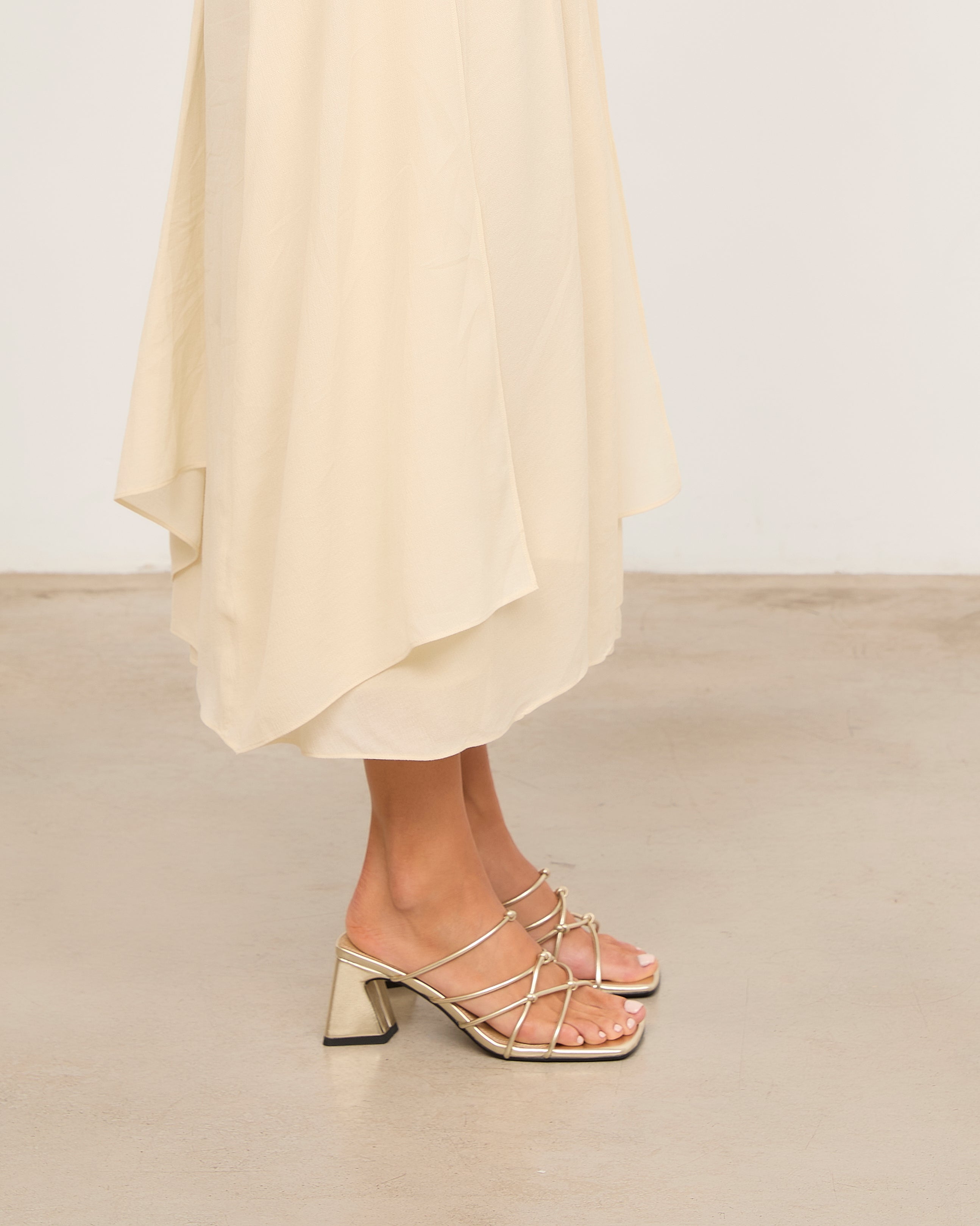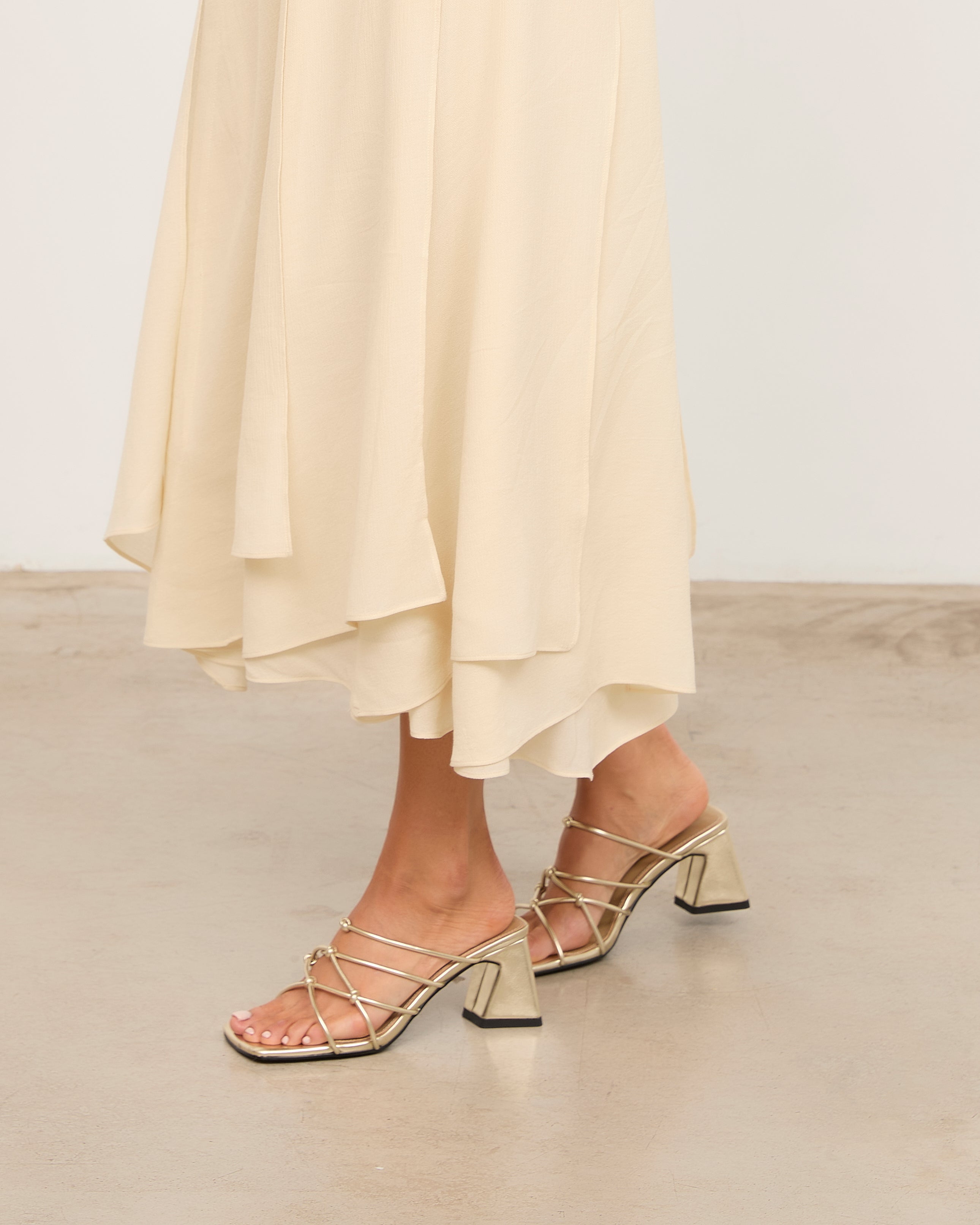 Sandalia de tacon en color dorado. Parte delantera formada con tiras anudadas.