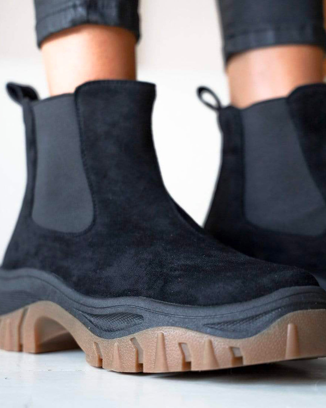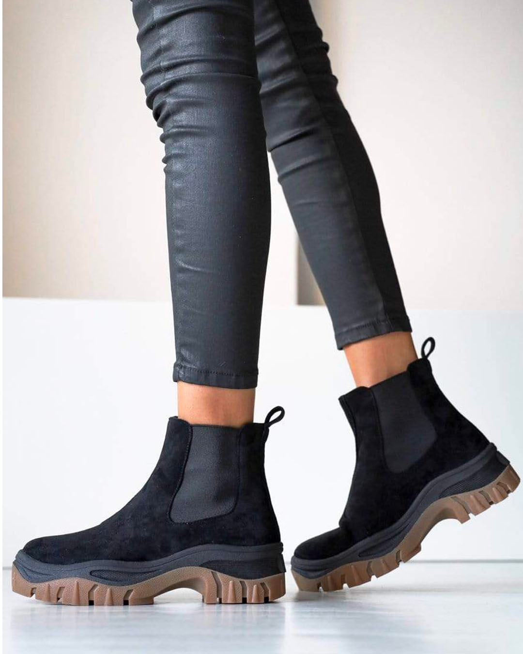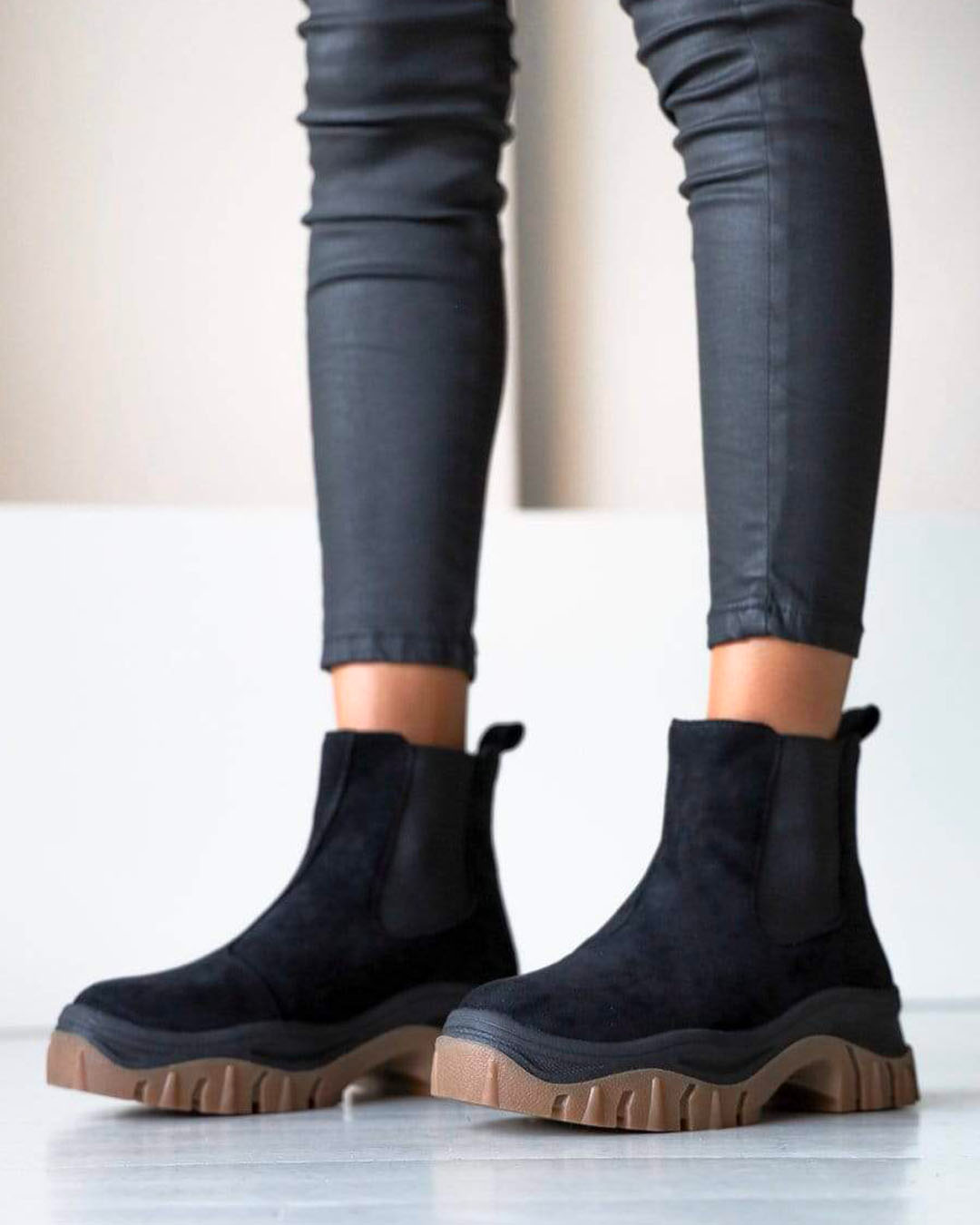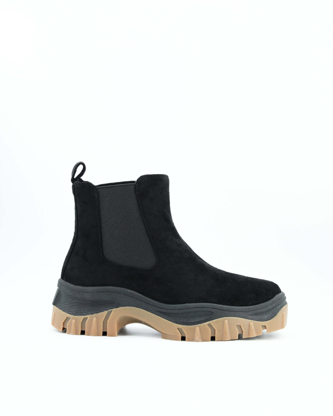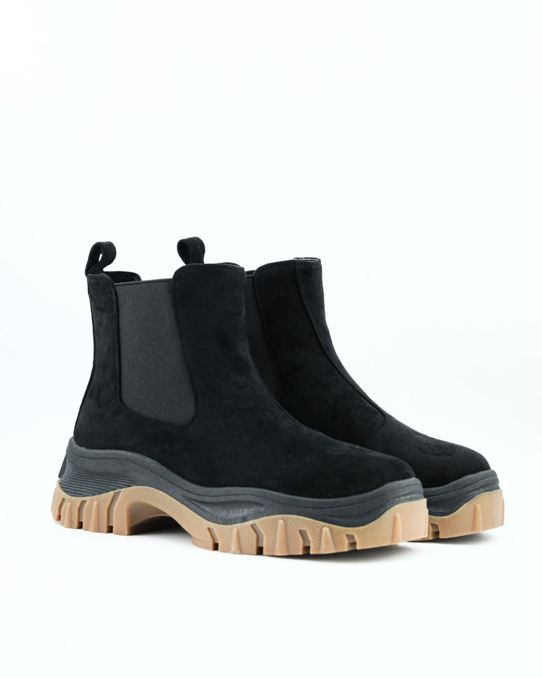 Bota de ante vegano negra con dos gomas laterales para una mayor comodidad. Suela de plataforma en dos colores, marron y negro.