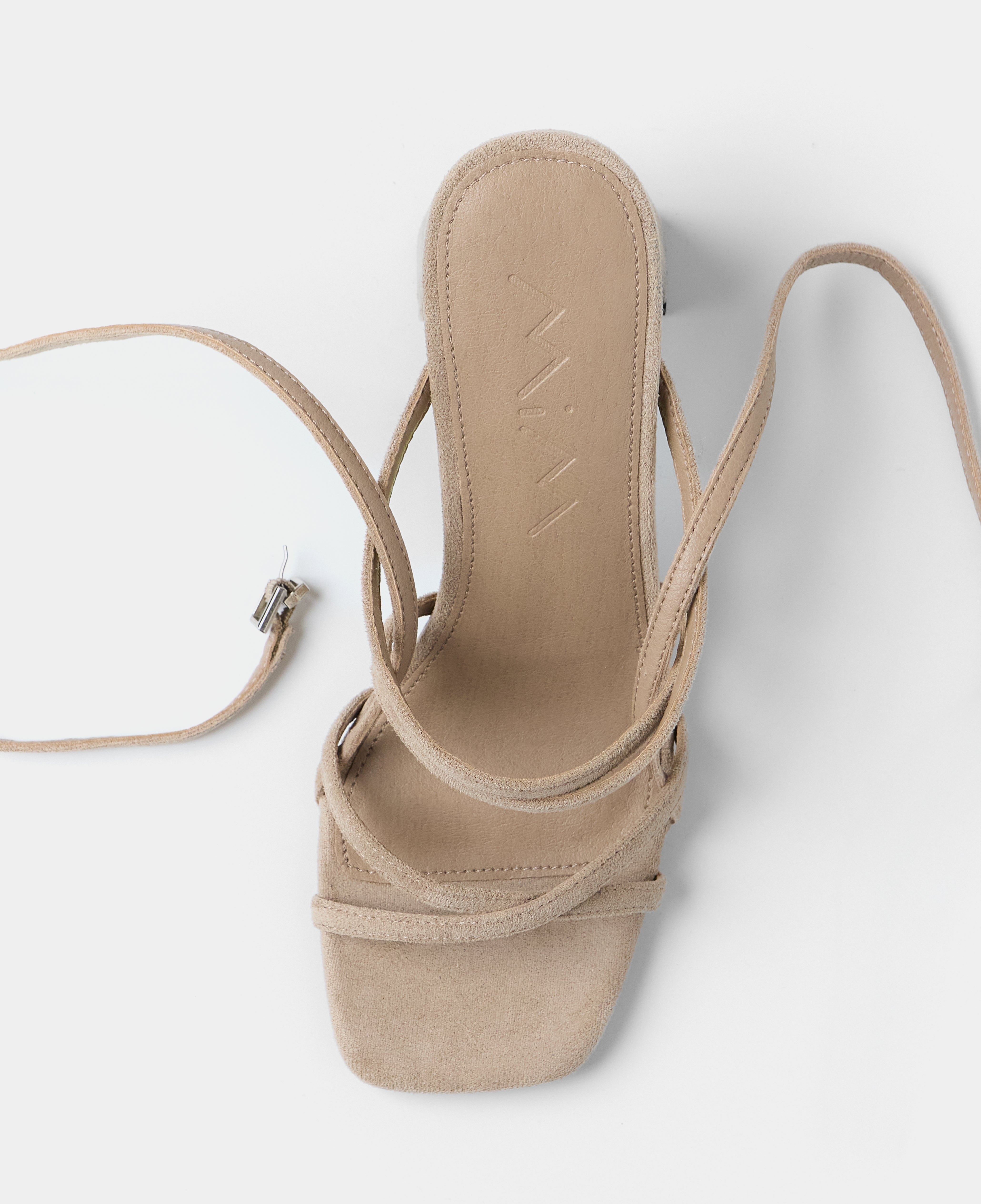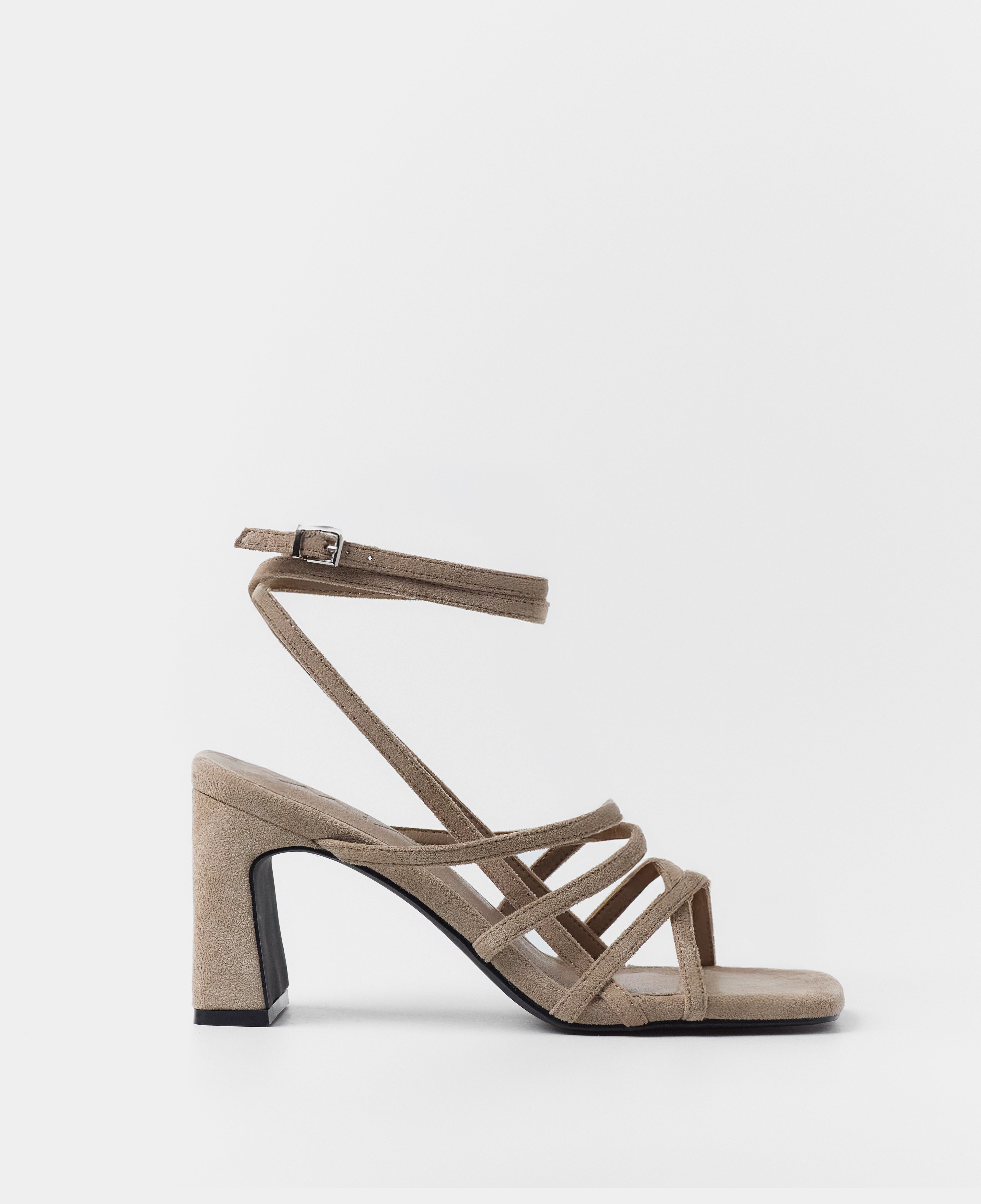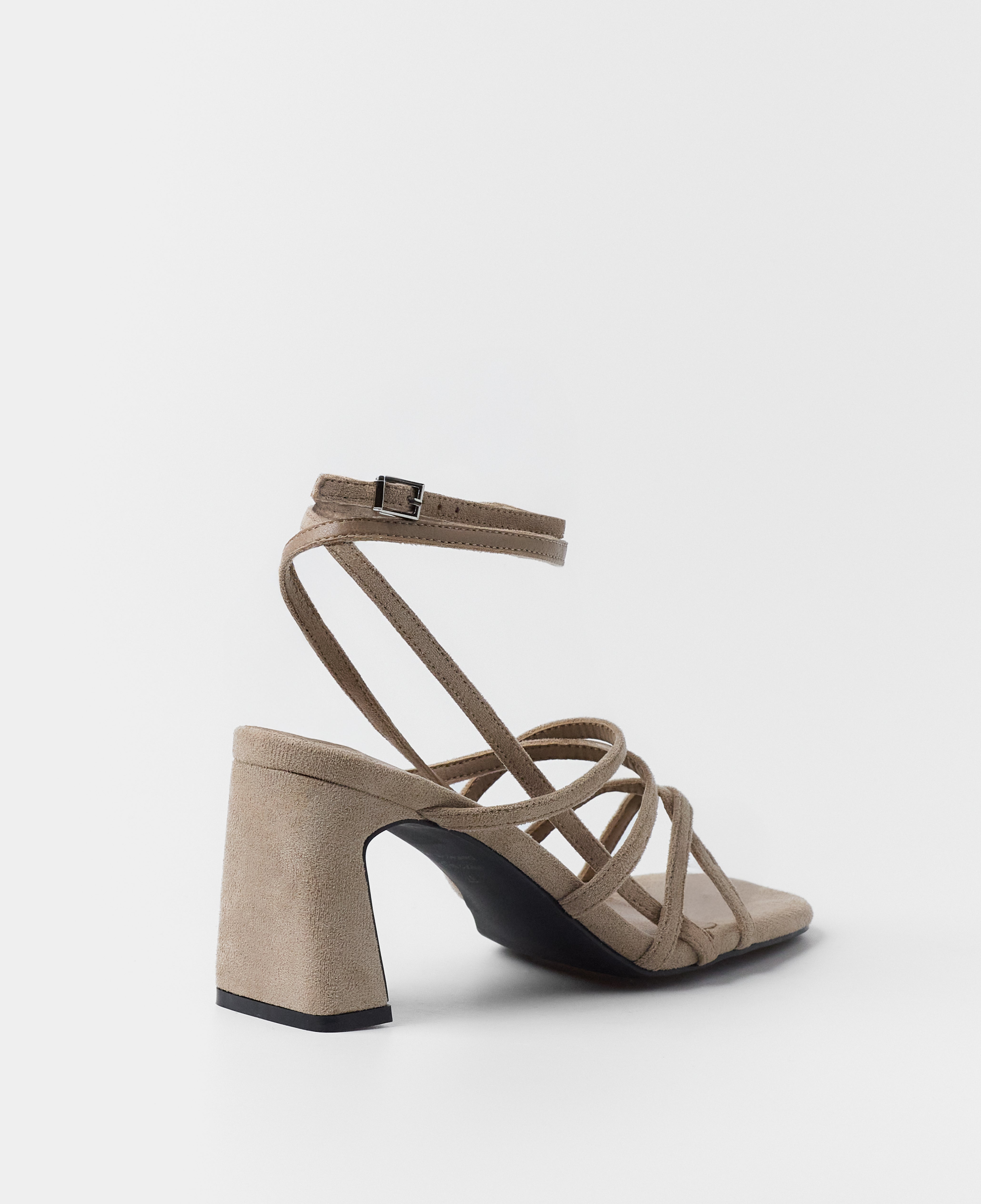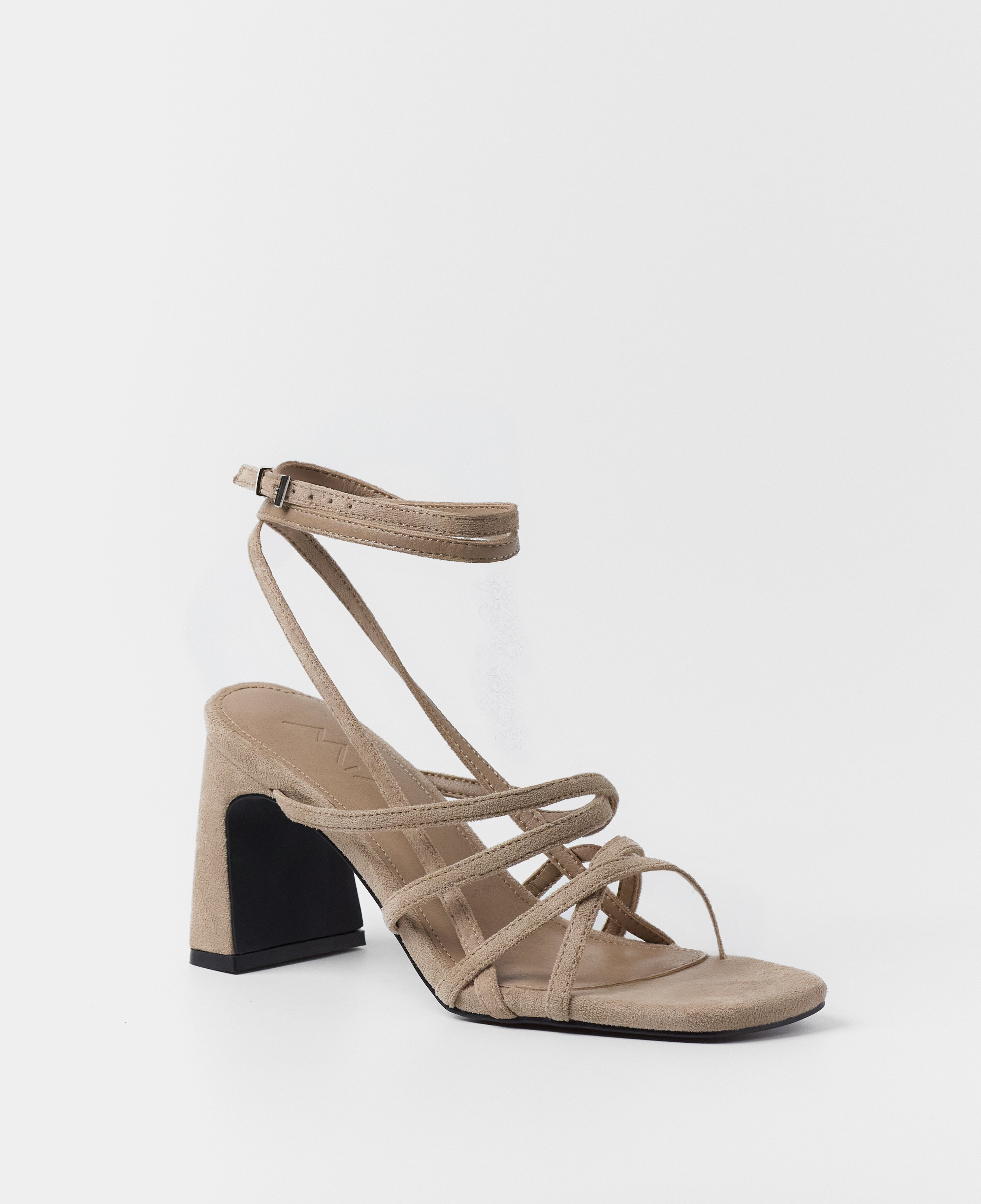 Sandalia de tacón en color topo. Compuesto por varias tiras y dos tiras largas para atar en el tobillo. Cierre con hebilla.