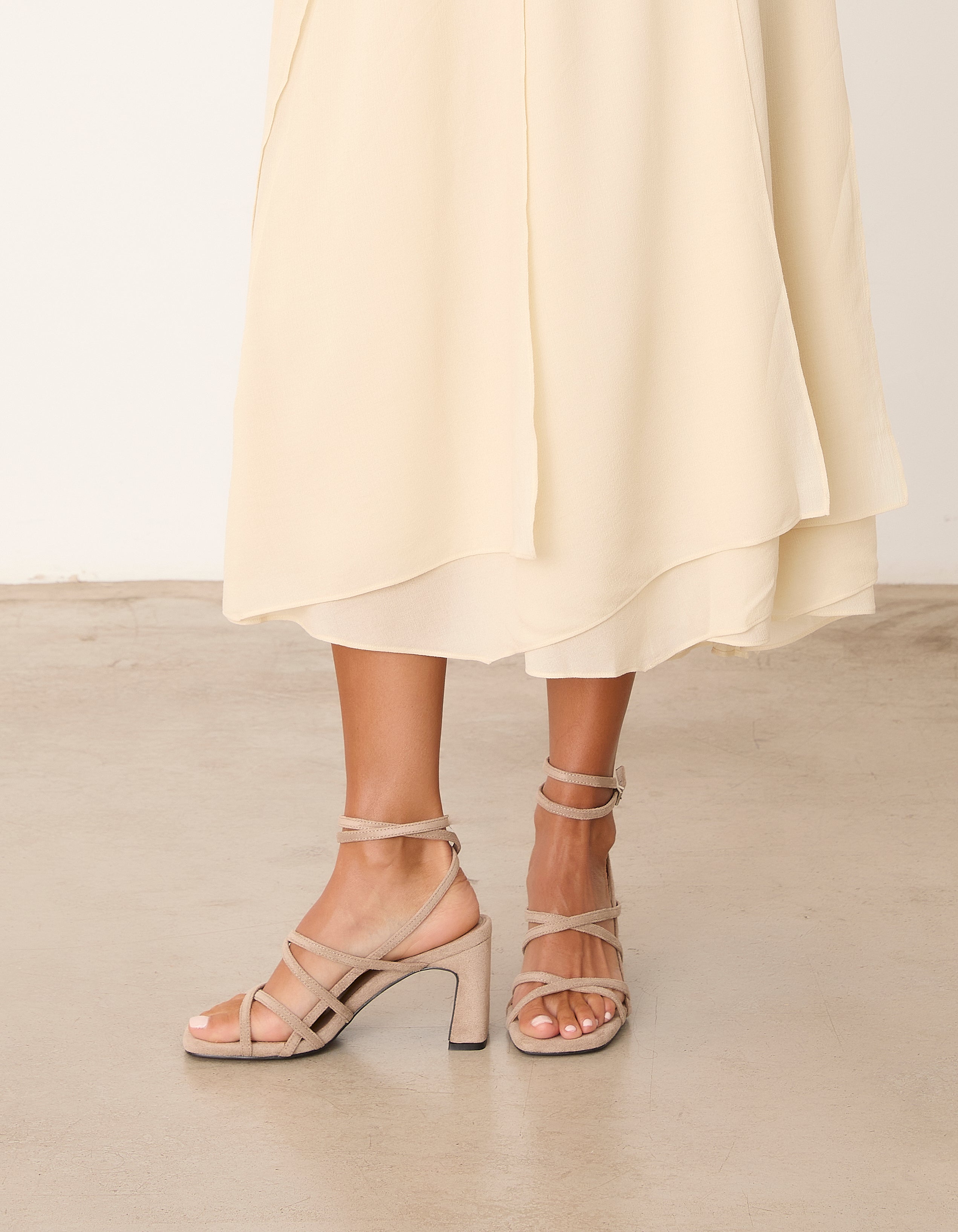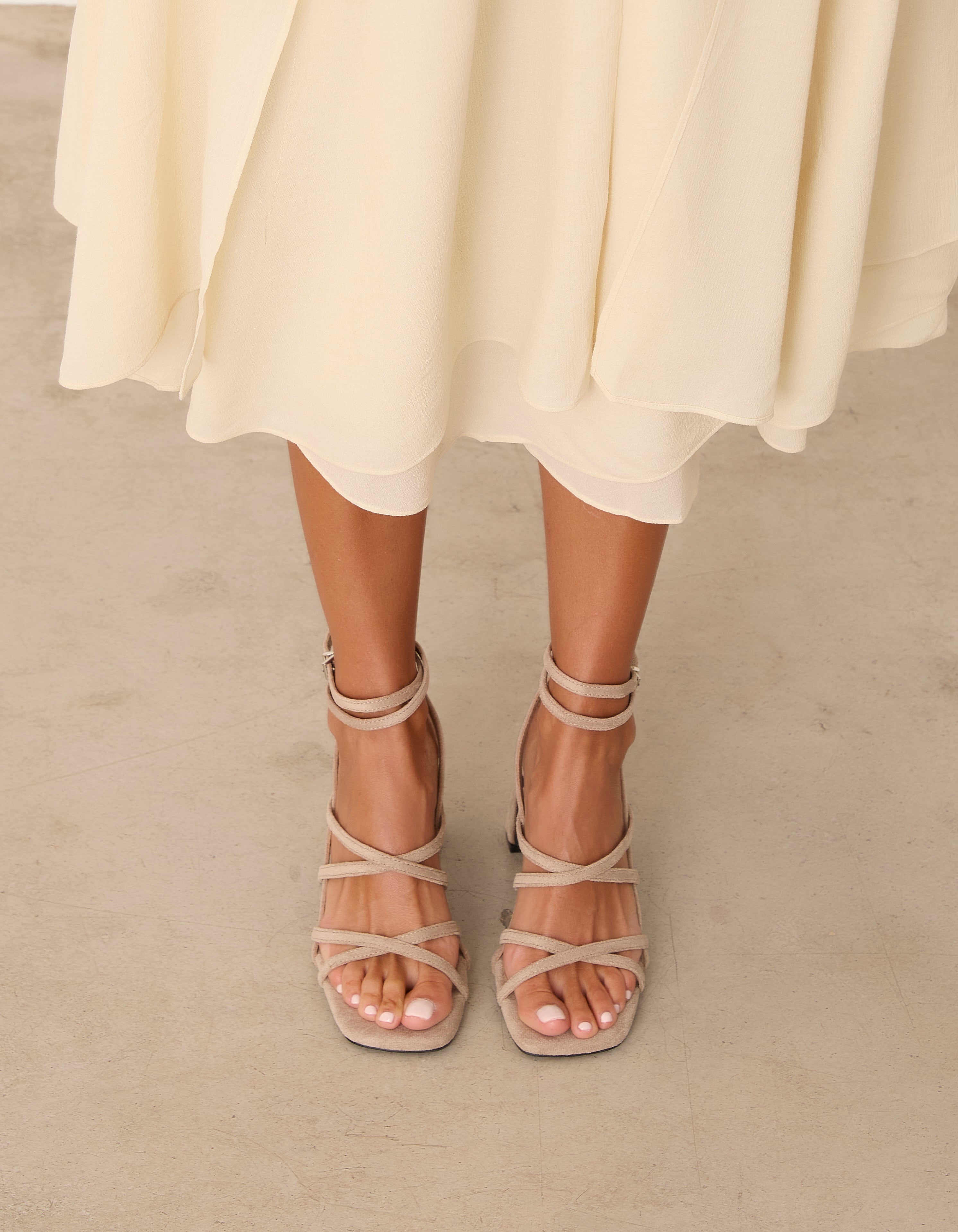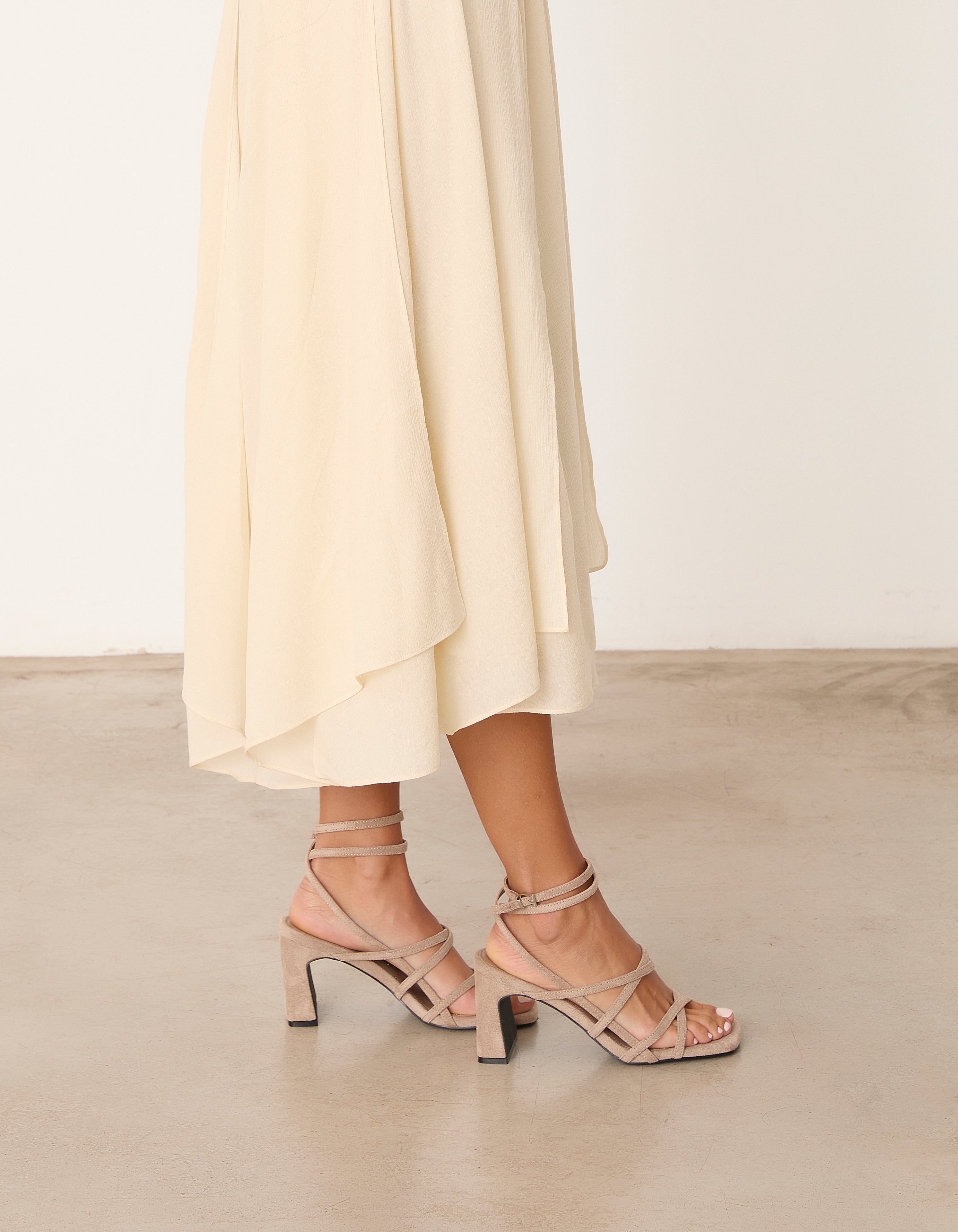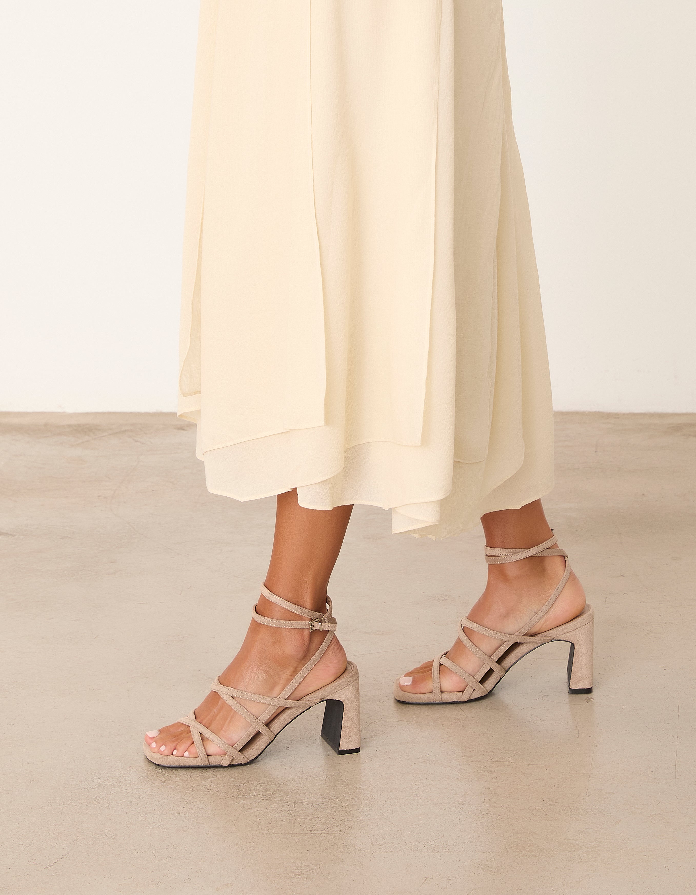 Sandalia de tacón en color topo. Compuesto por varias tiras y dos tiras largas para atar en el tobillo. Cierre con hebilla.