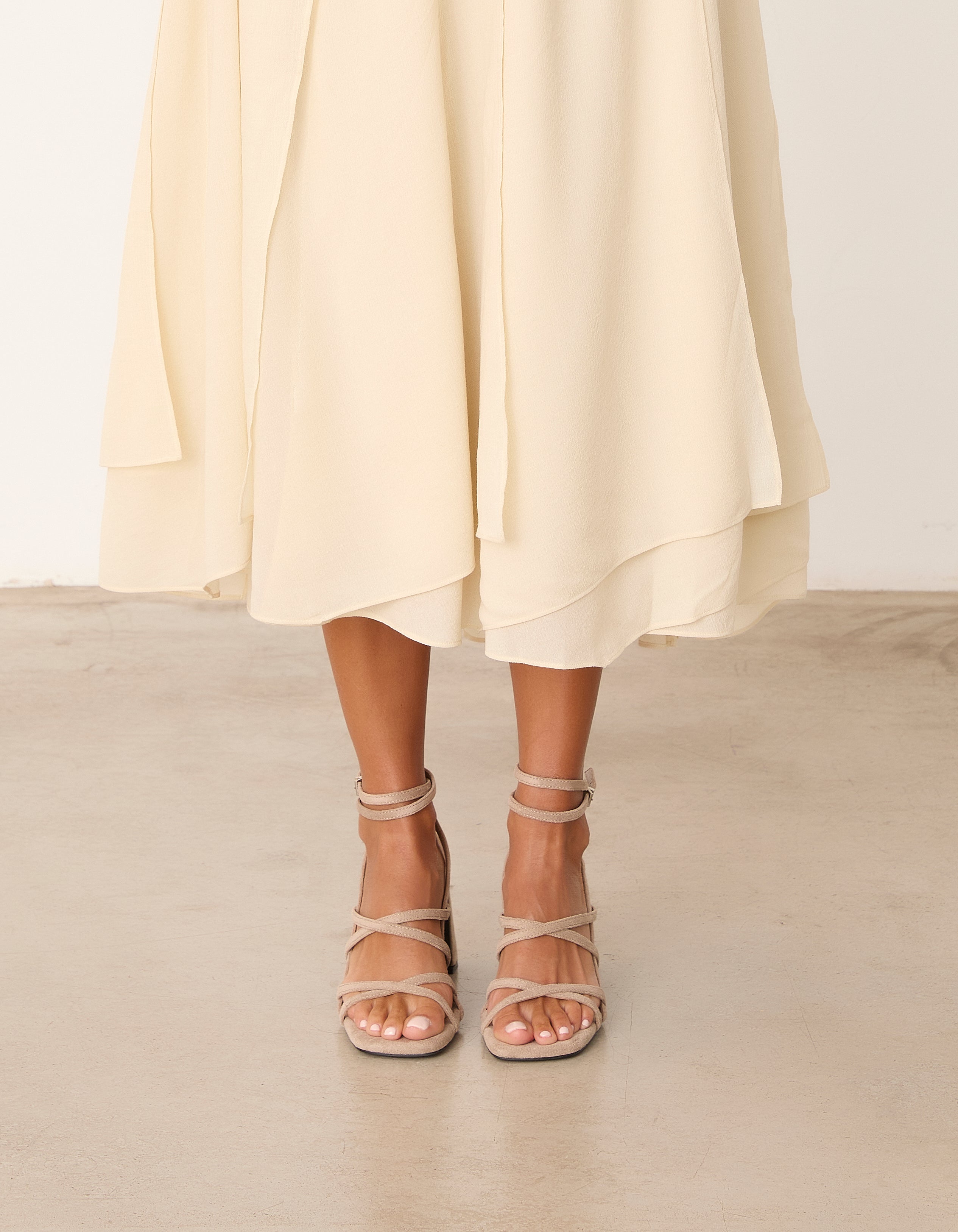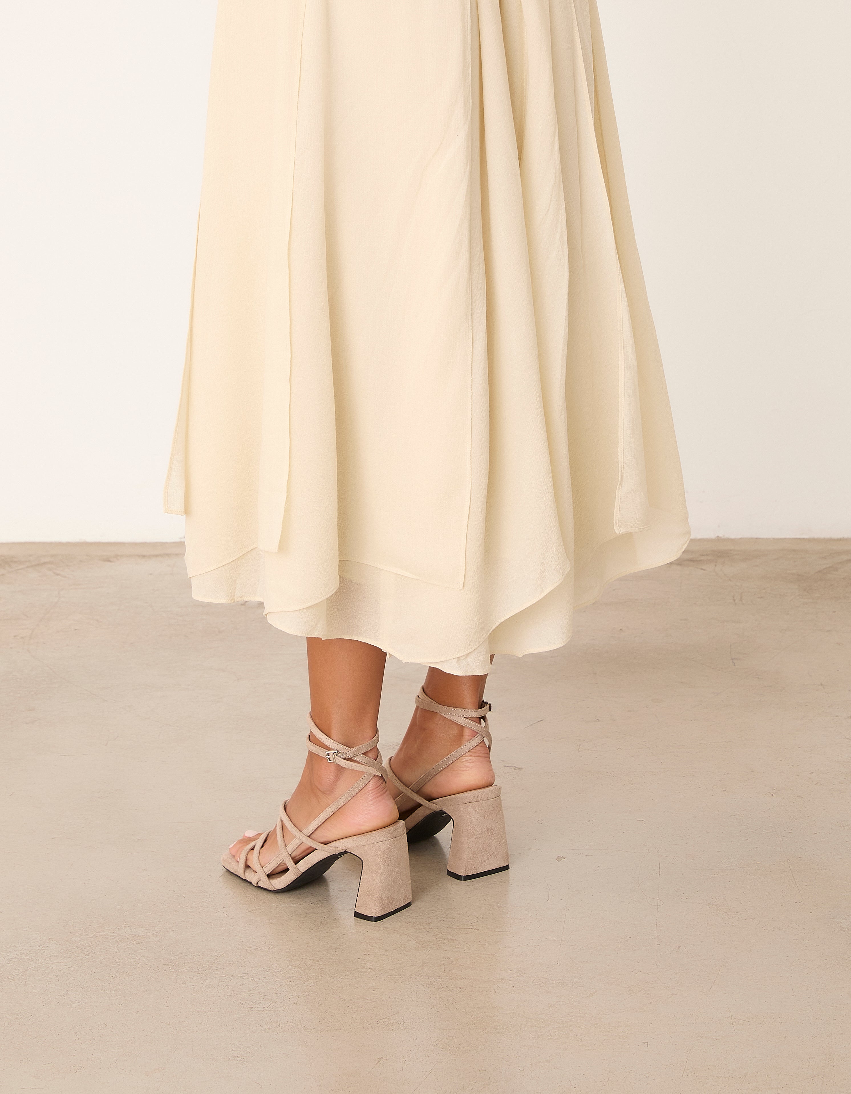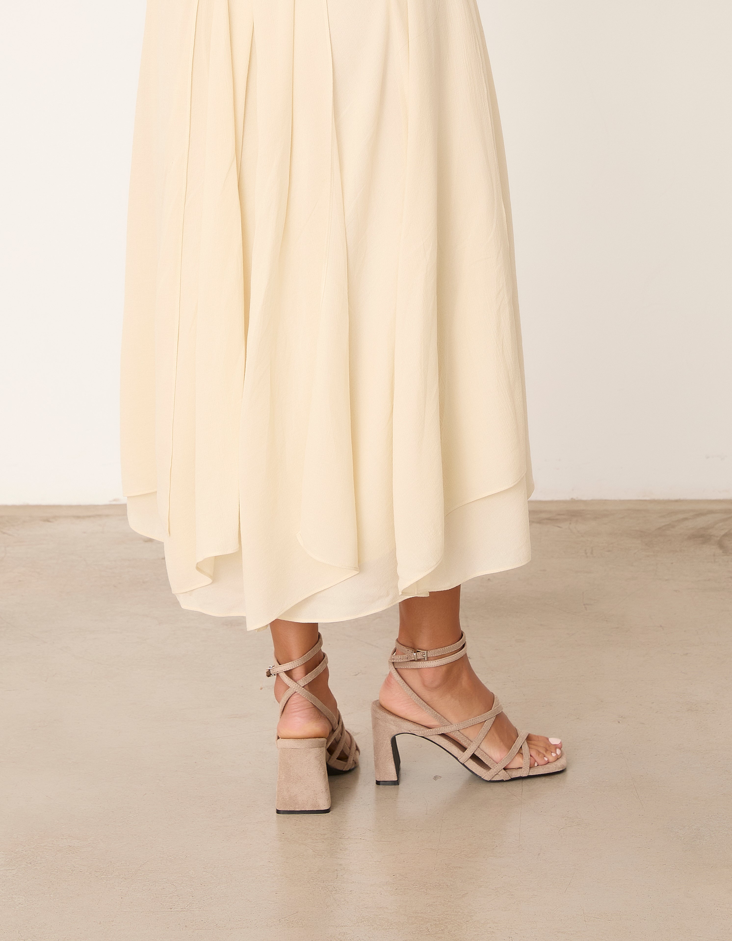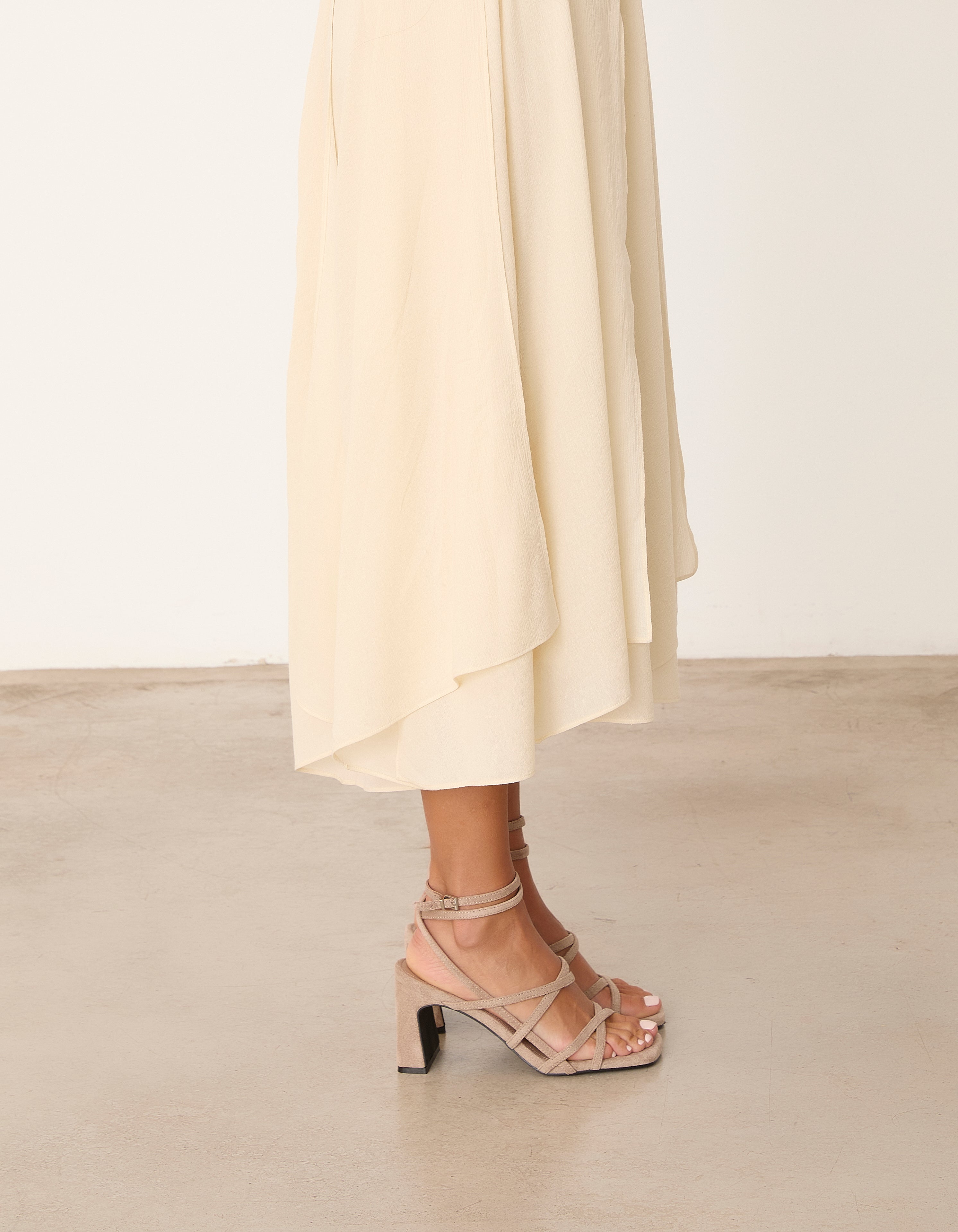 Sandalia de tacón en color topo. Compuesto por varias tiras y dos tiras largas para atar en el tobillo. Cierre con hebilla.