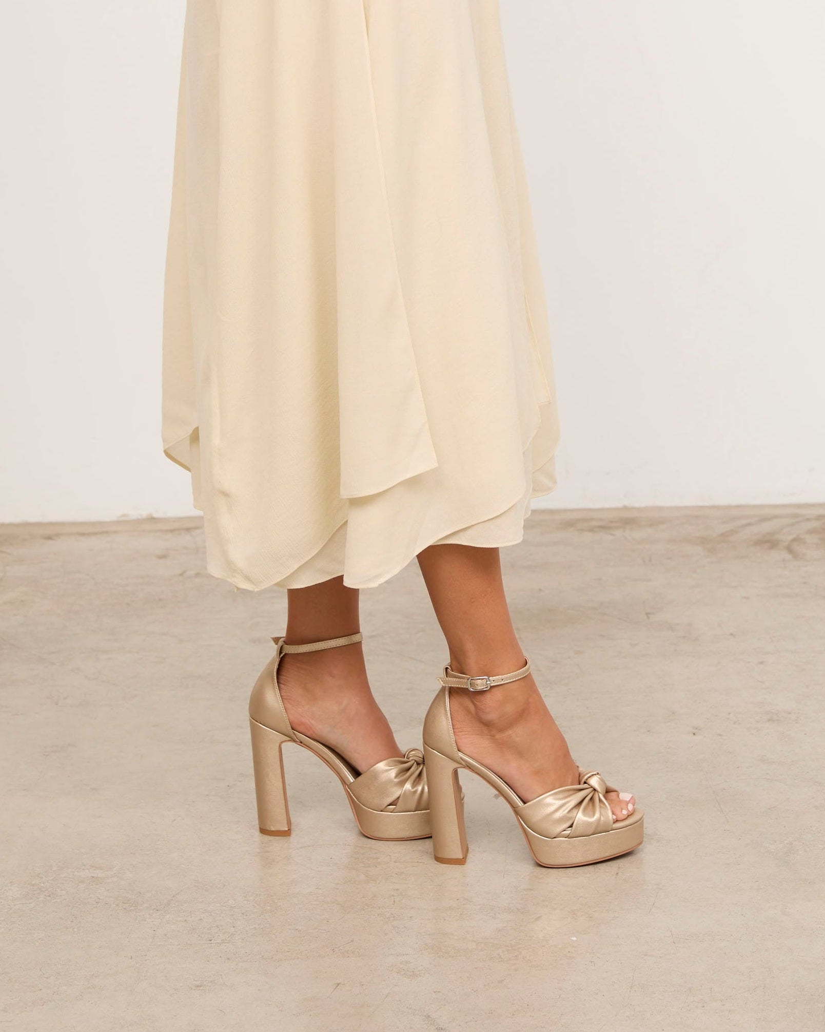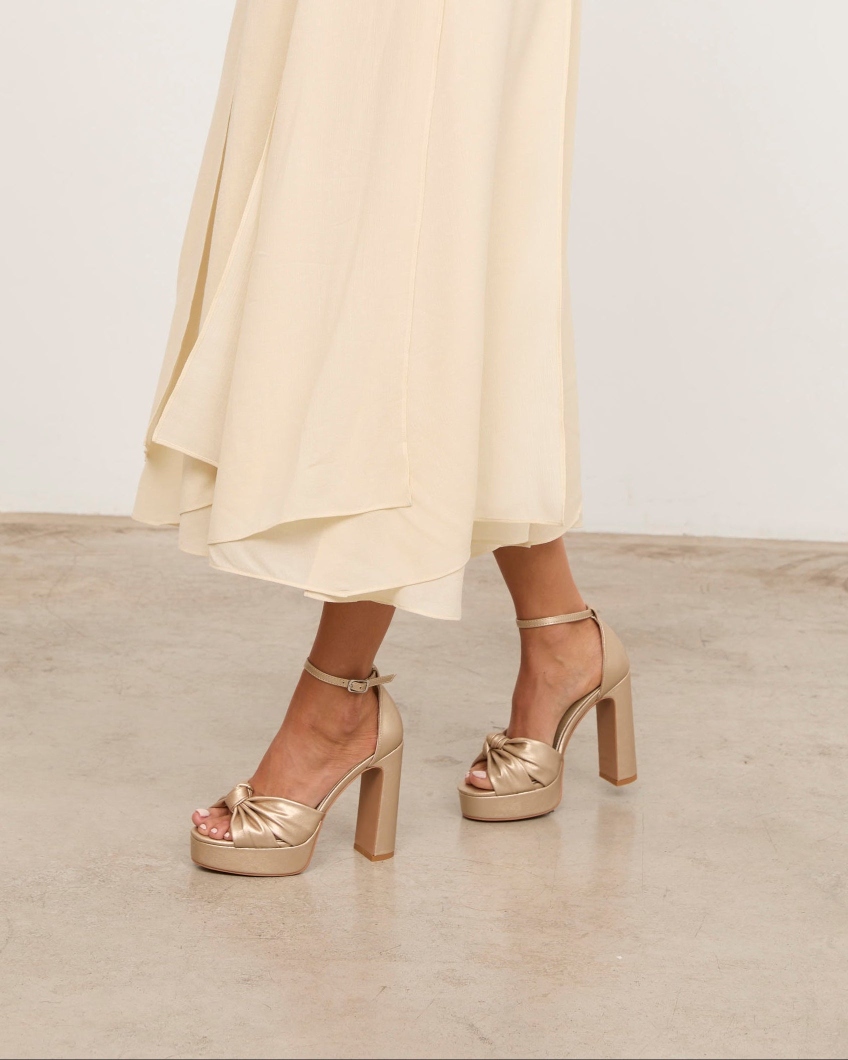 Sandalia de tacón con plataforma XL en color dorado envejecido. Parte delantera con detalle de nudo. Tira trasera para cierre en tobillo con hebilla y talonera. Tacón rectangular.