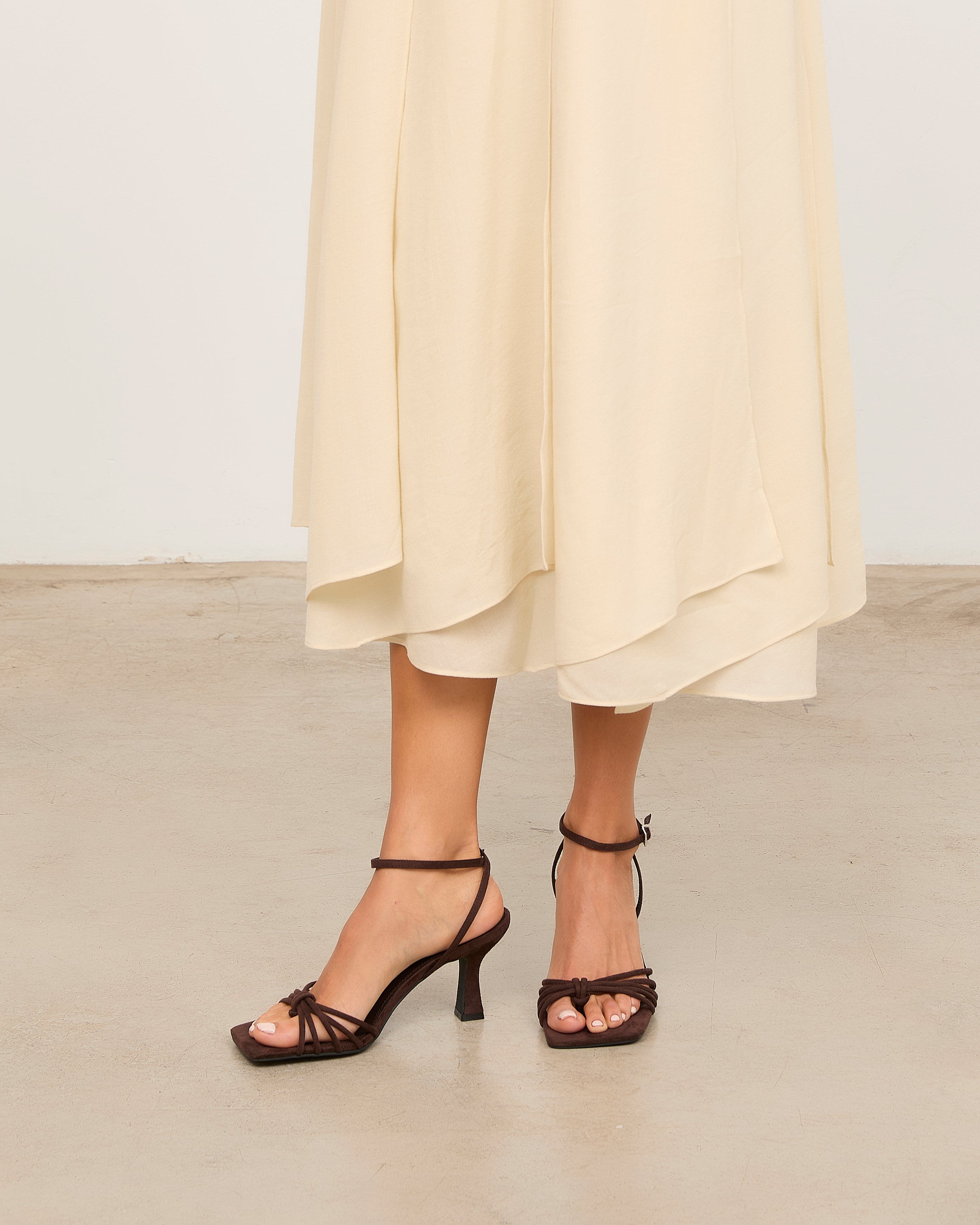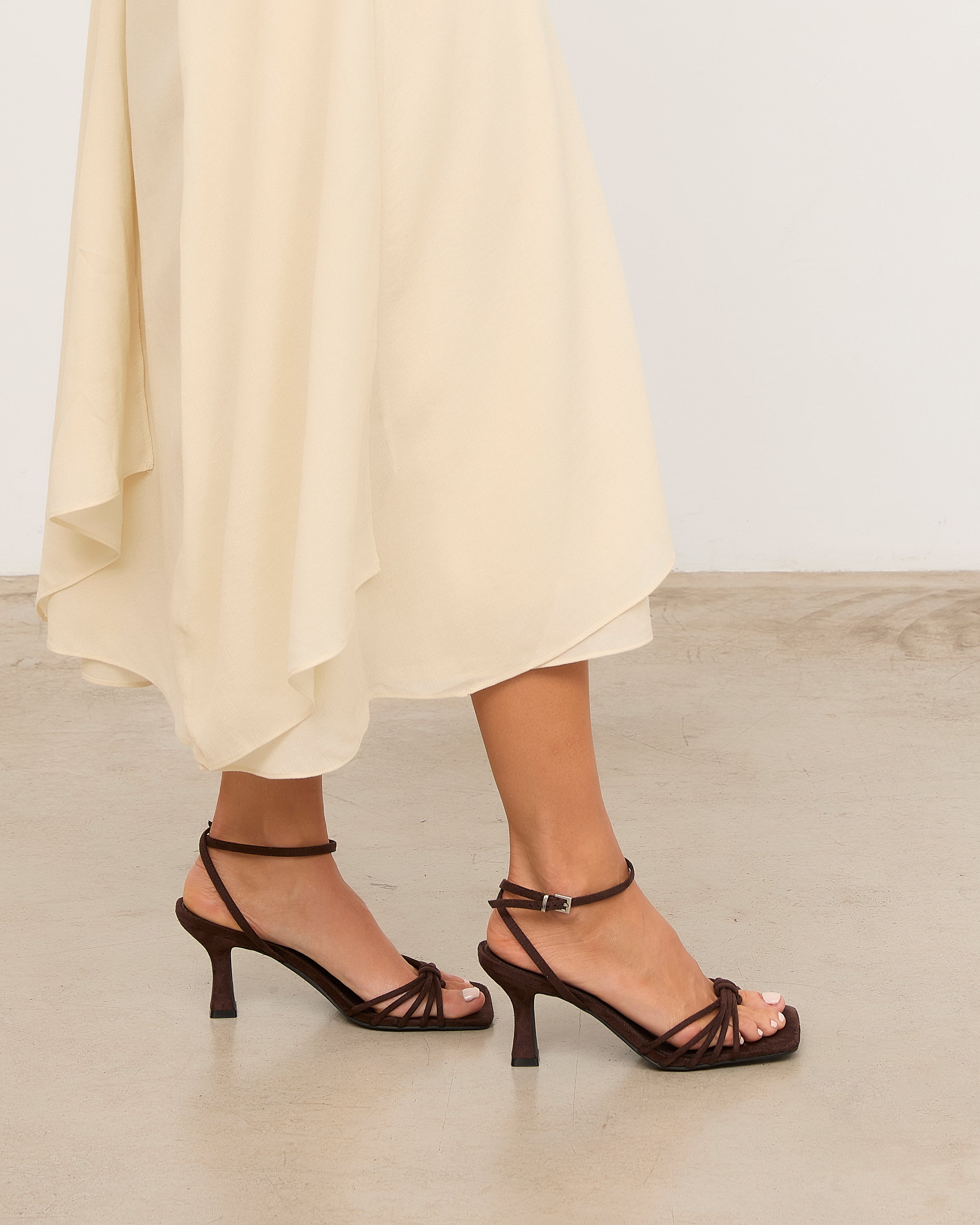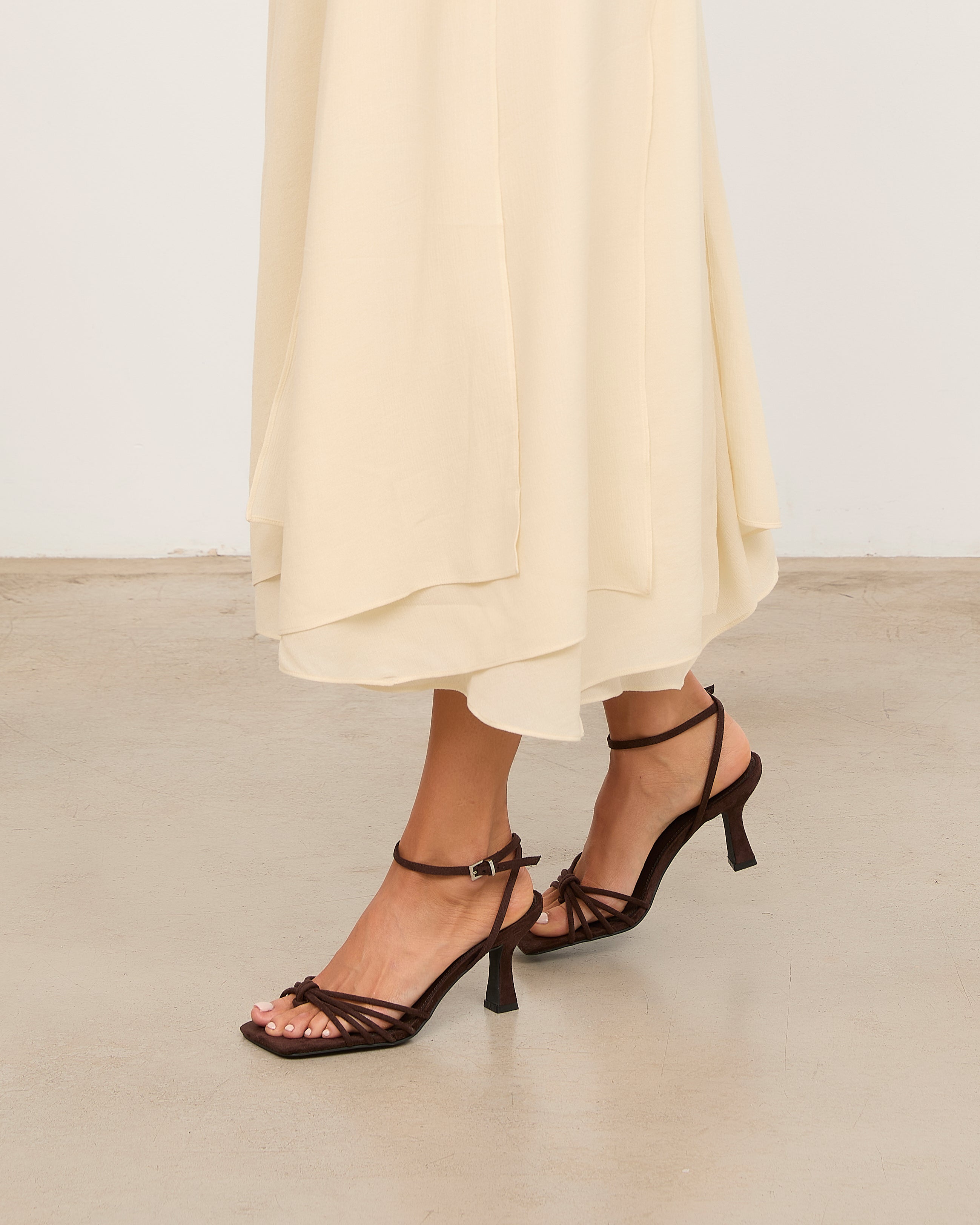 Sandalia de tacón con puntera cuadrada en color chocolate. Multiples tiras en la parte delantera unidas con sujección en dedo. Tira trasera para sujección en talón con hebilla. Tacón tipo aguja de base ancha.