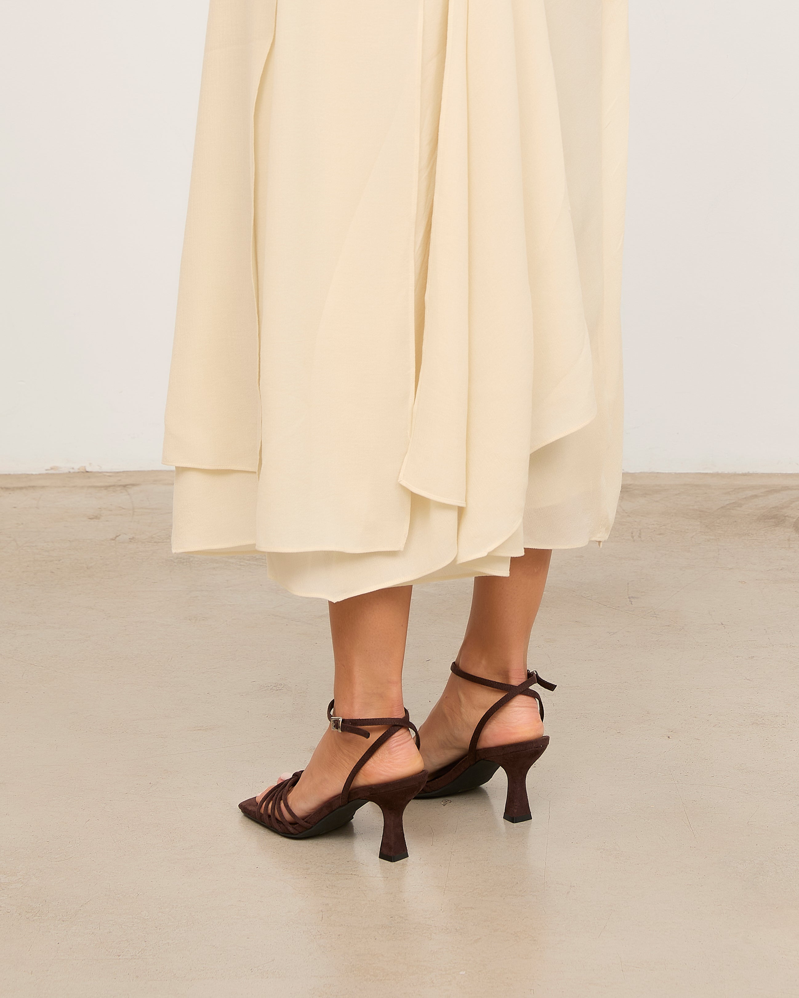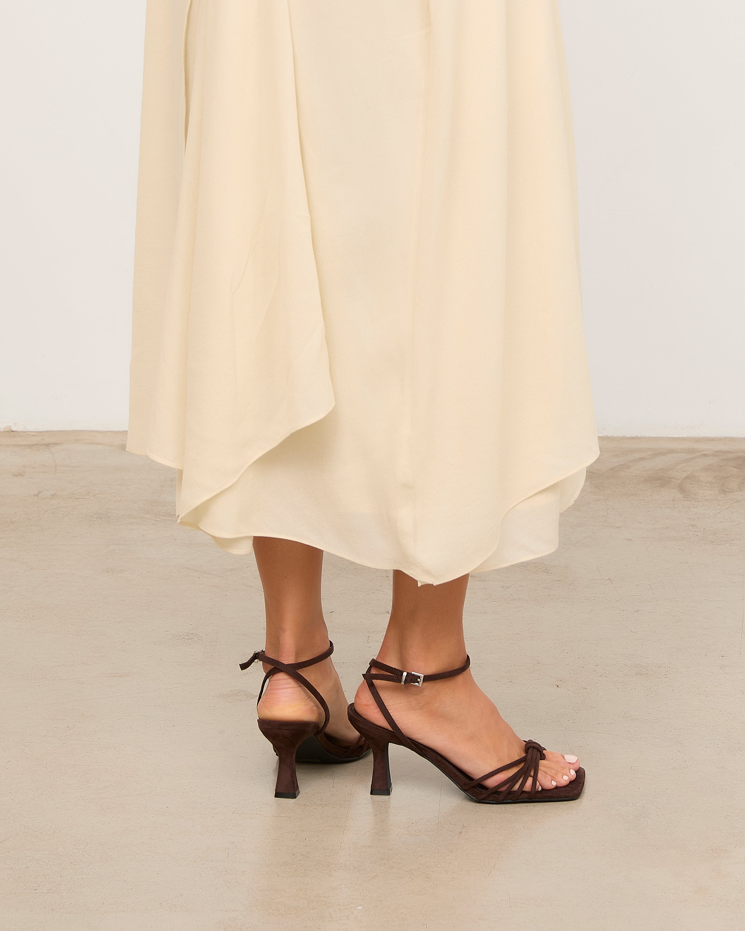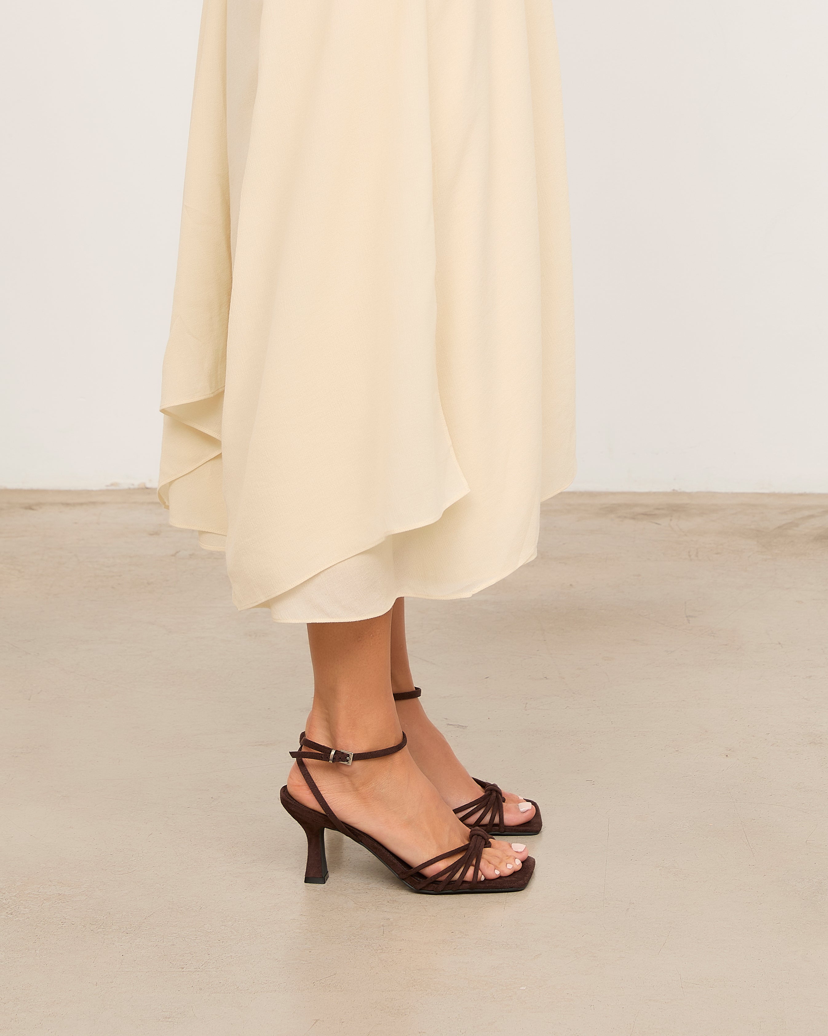 Sandalia de tacón con puntera cuadrada en color chocolate. Multiples tiras en la parte delantera unidas con sujección en dedo. Tira trasera para sujección en talón con hebilla. Tacón tipo aguja de base ancha.