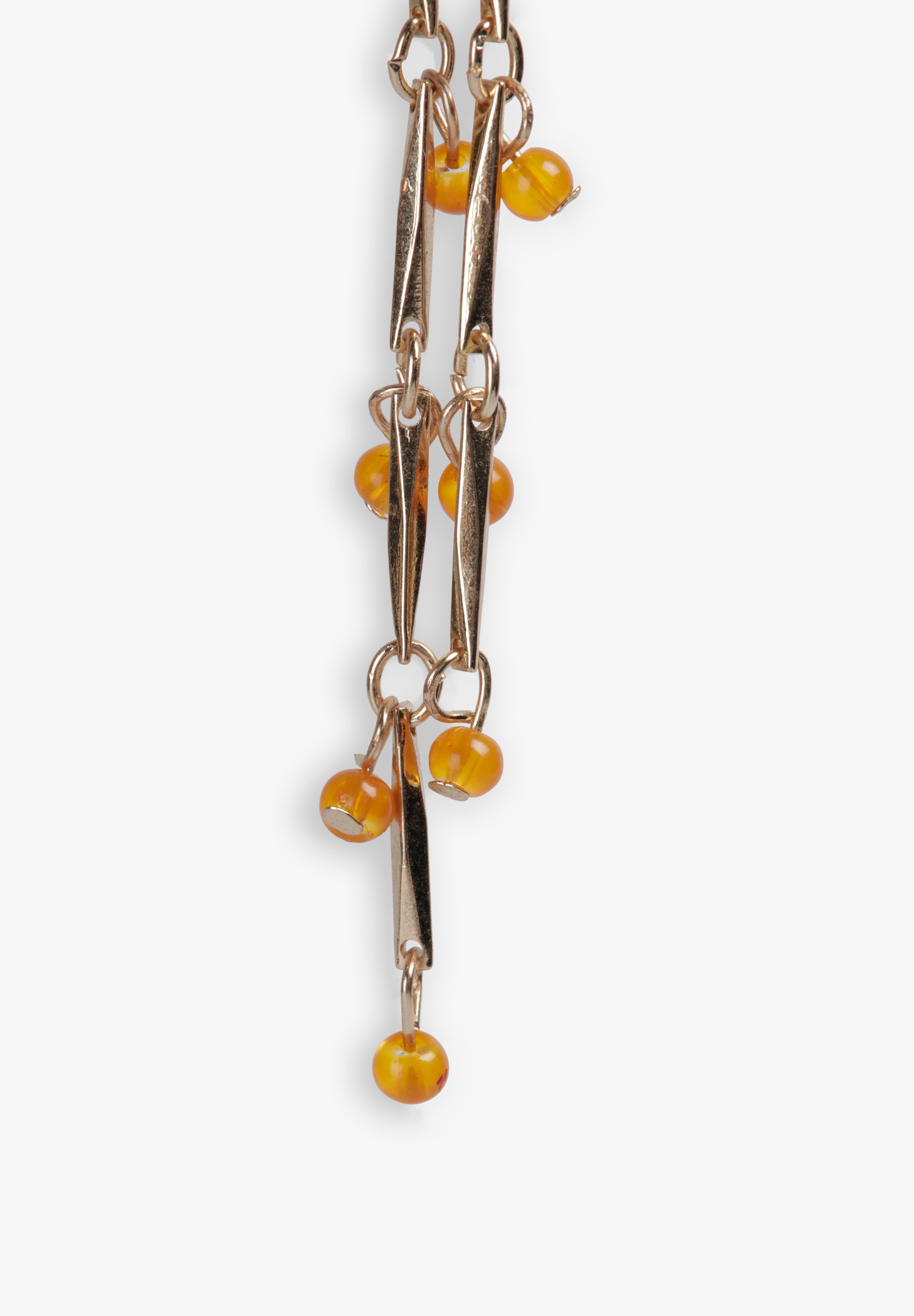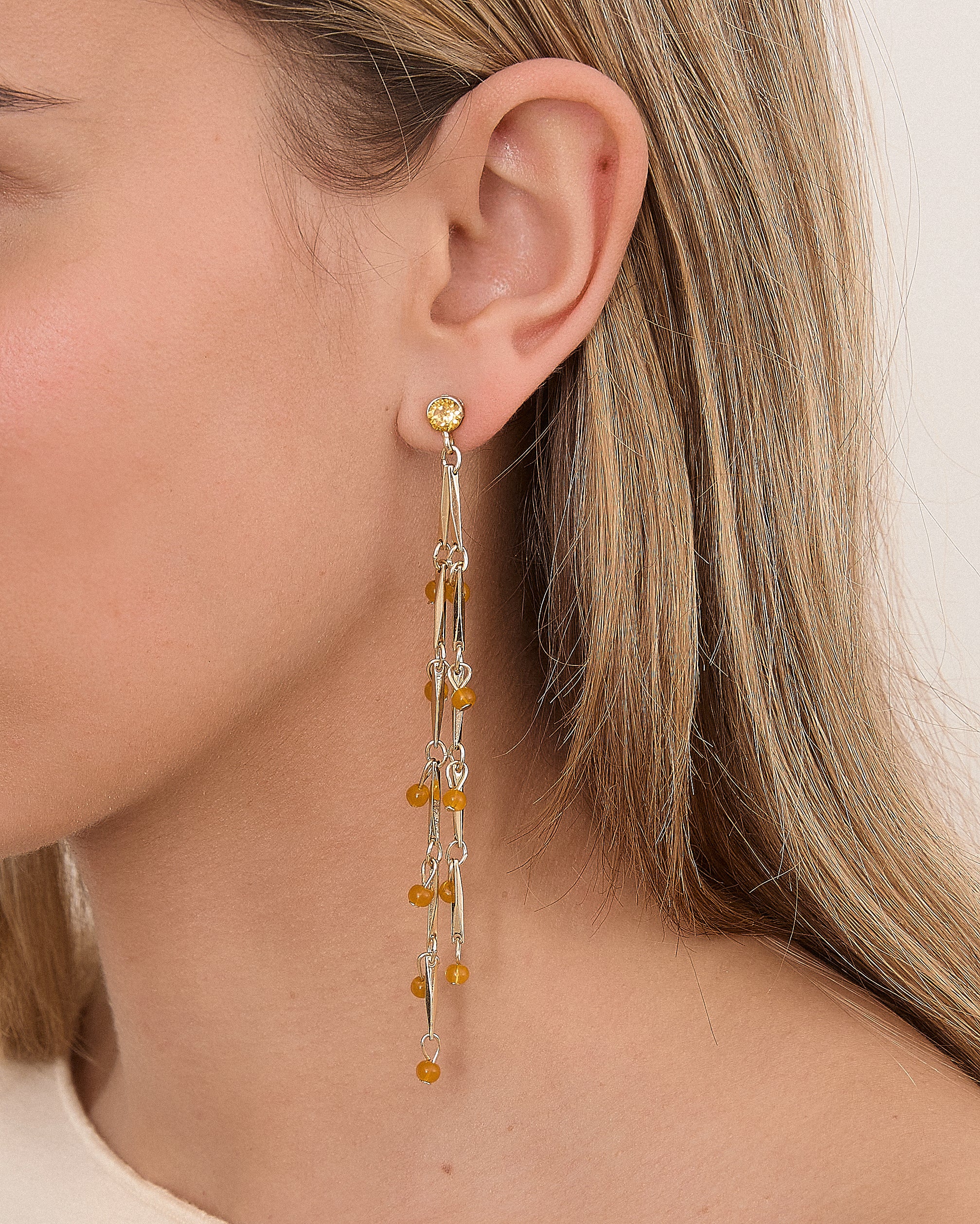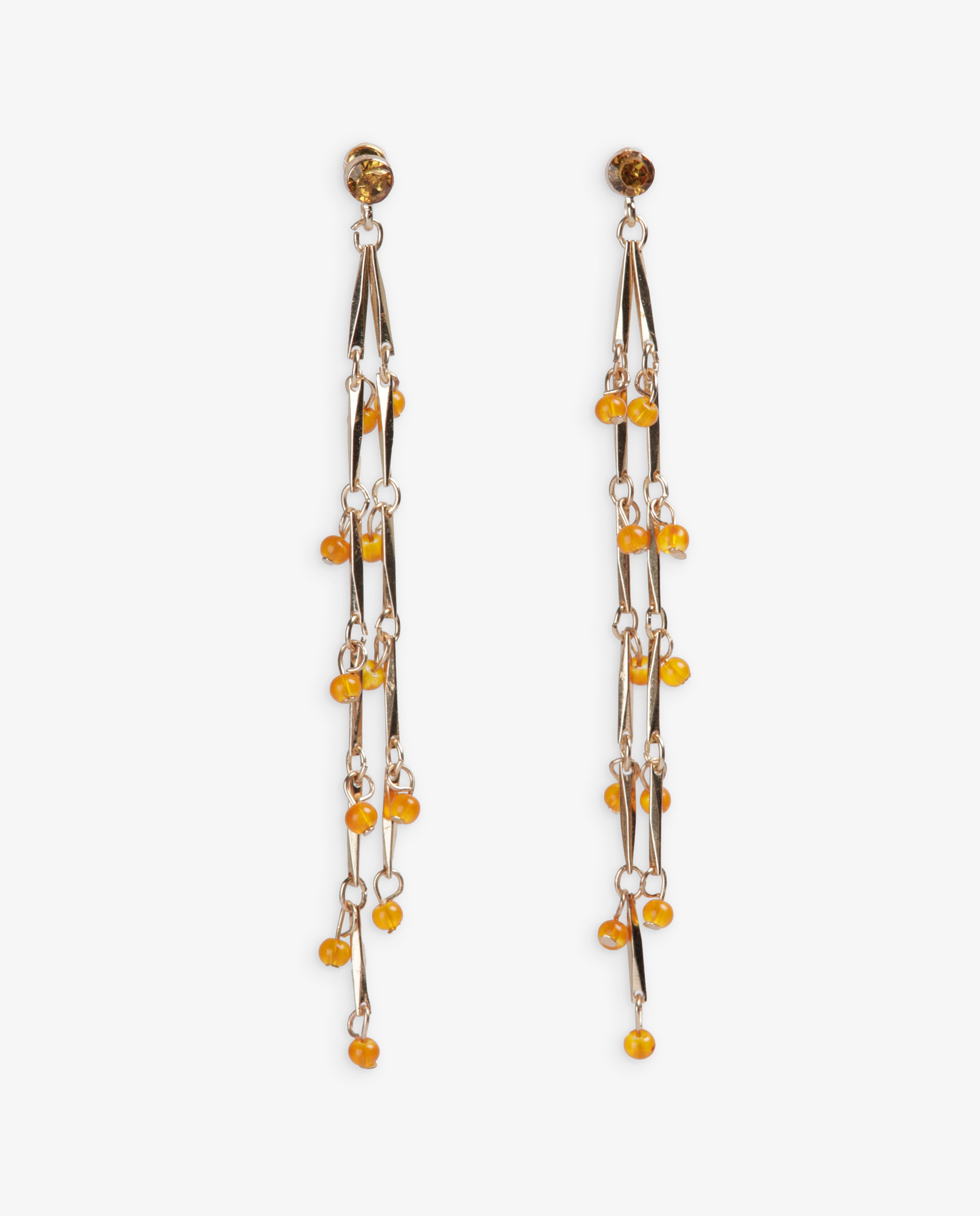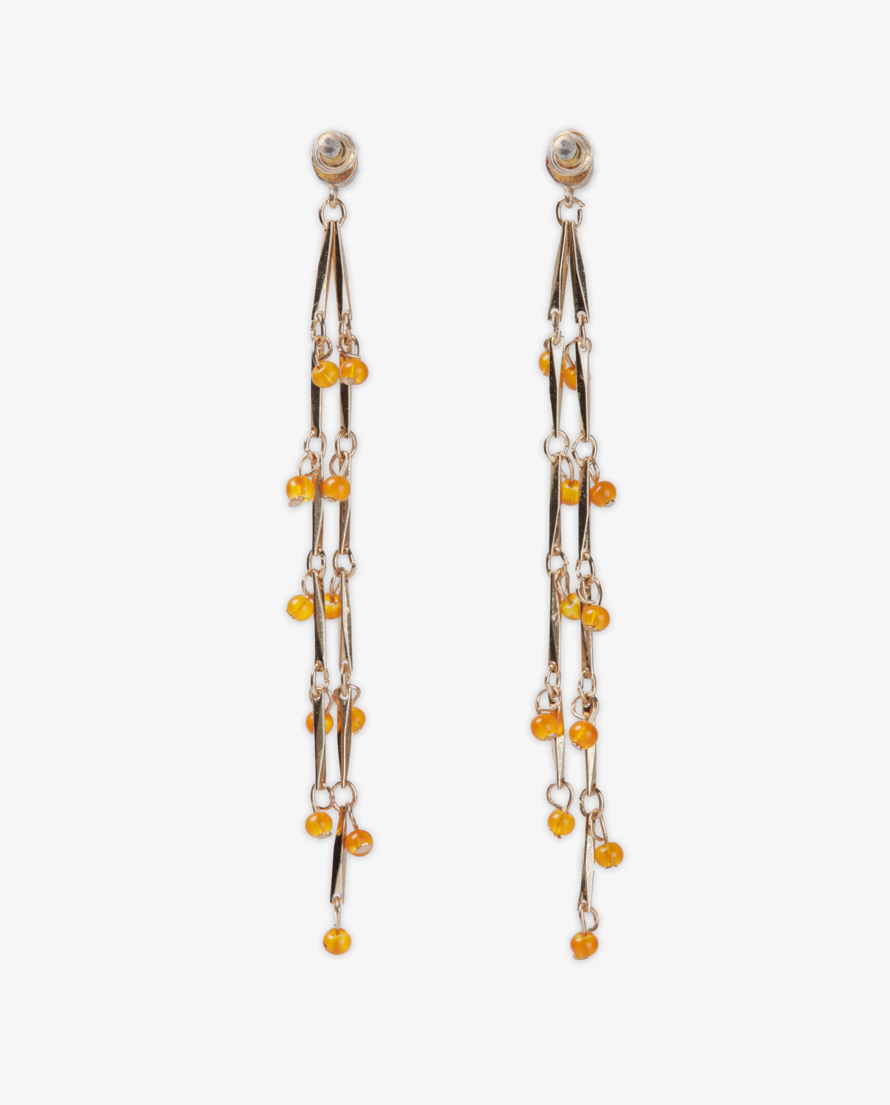 Pendientes largos efecto lagrima con cadena dorada y pequeñas cuentas color amber.