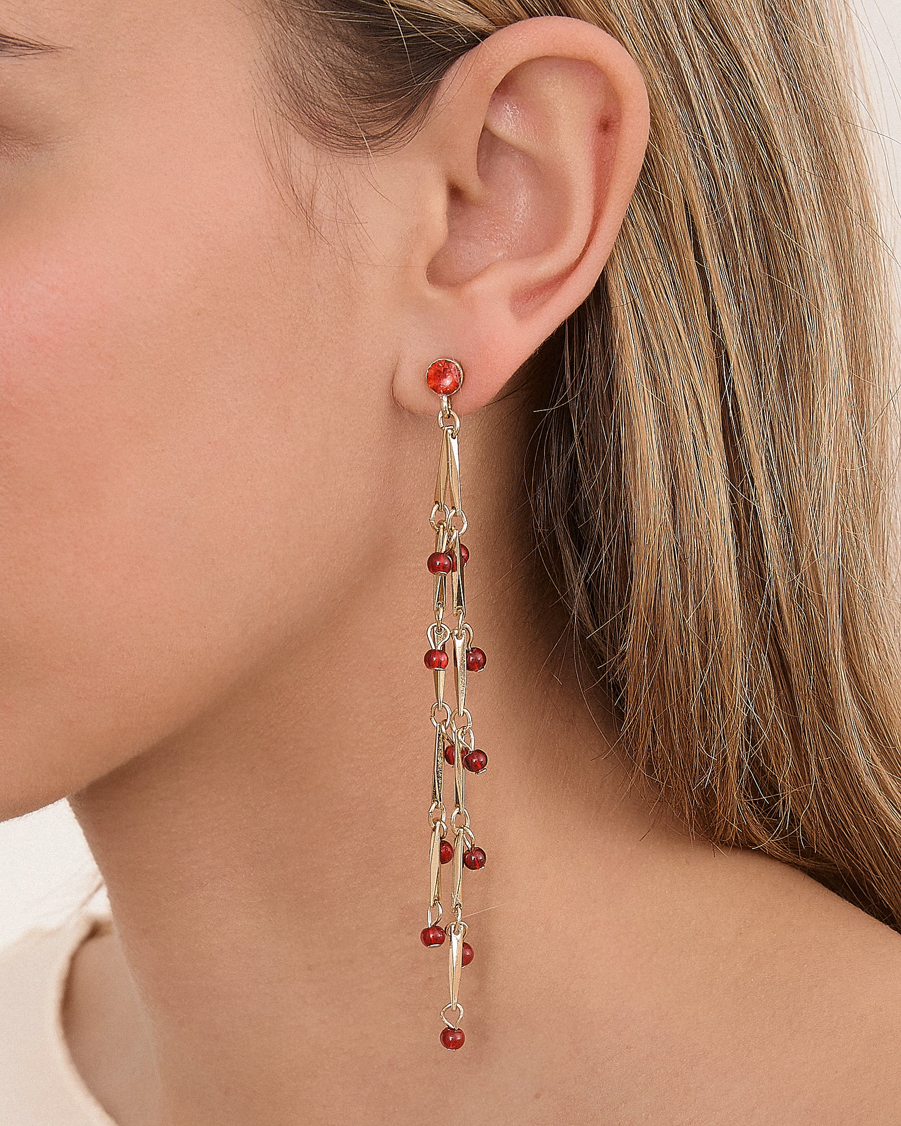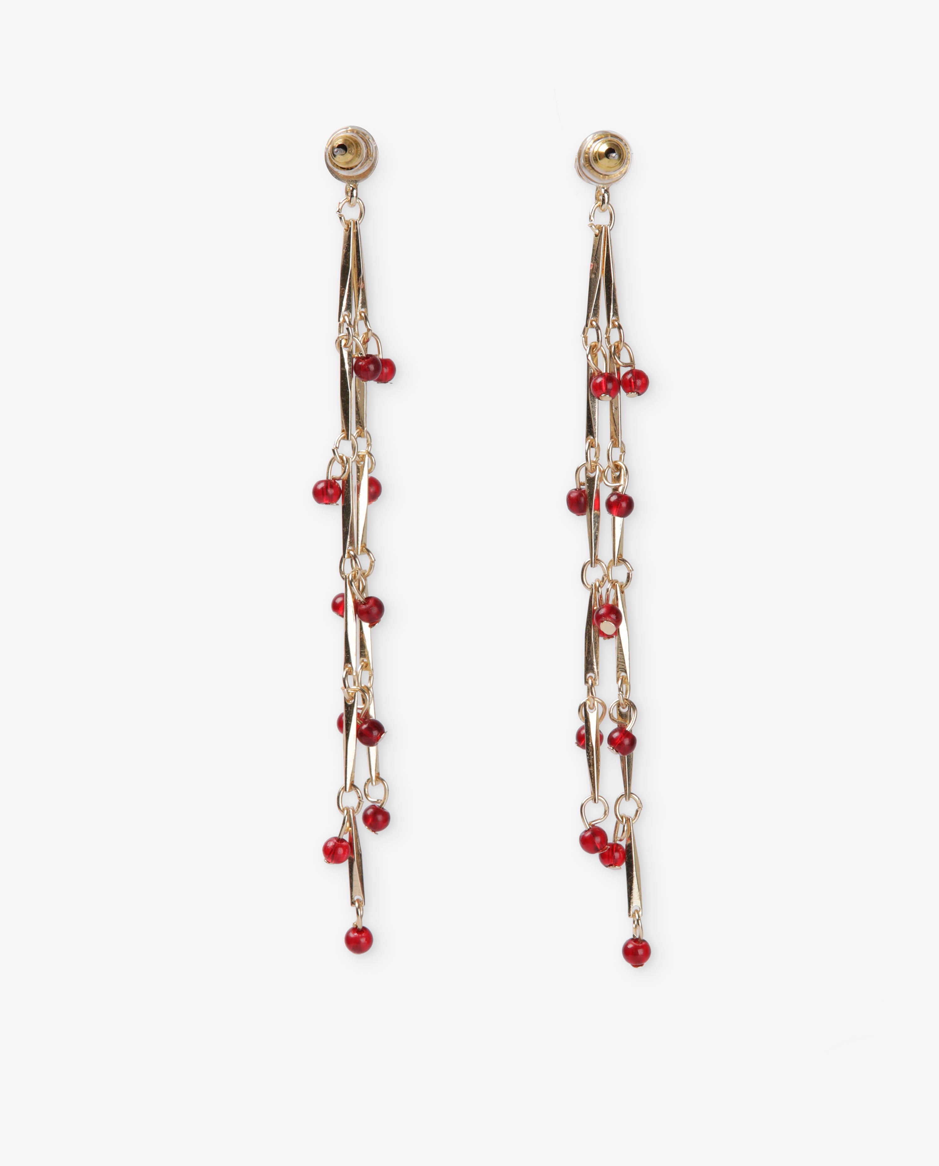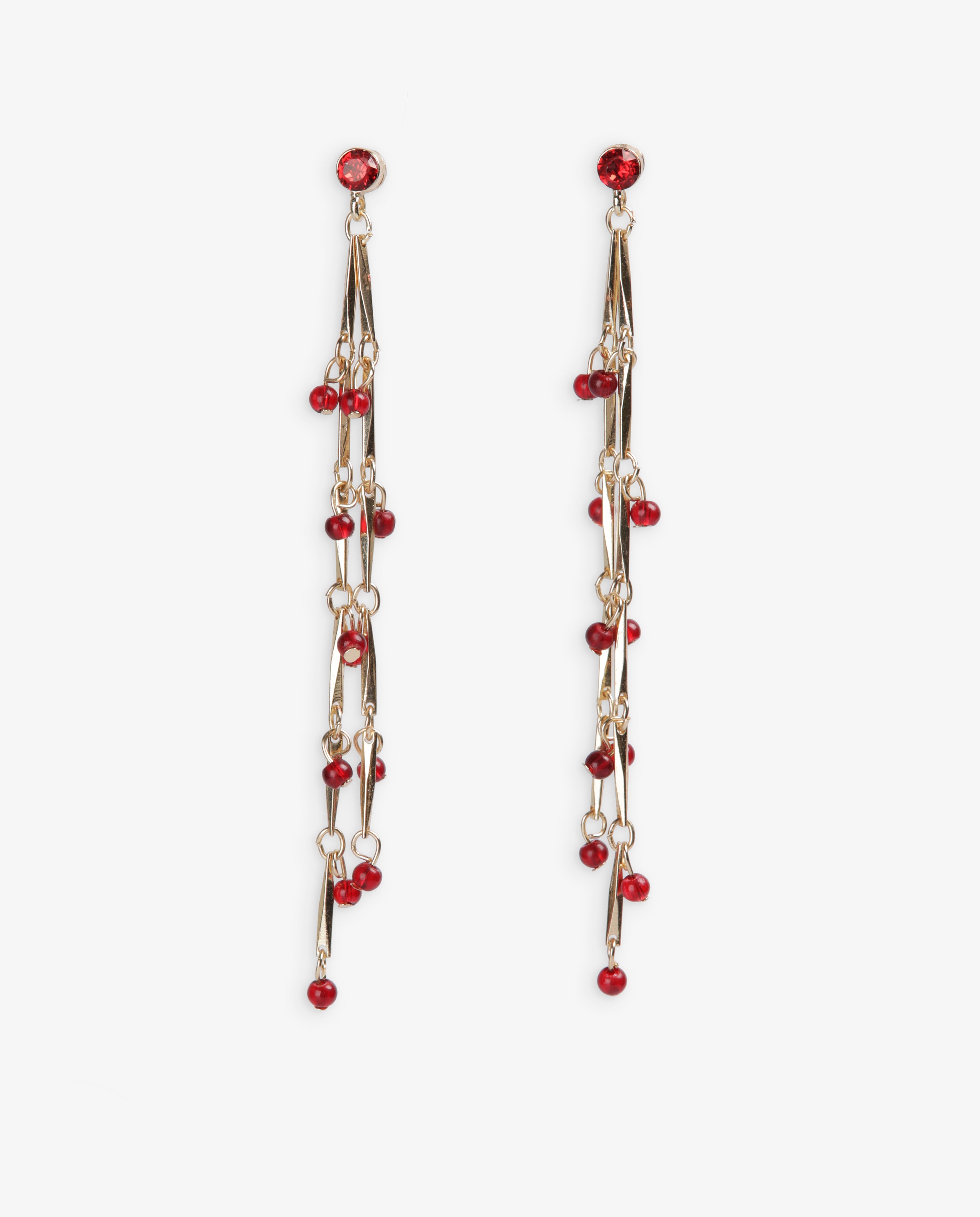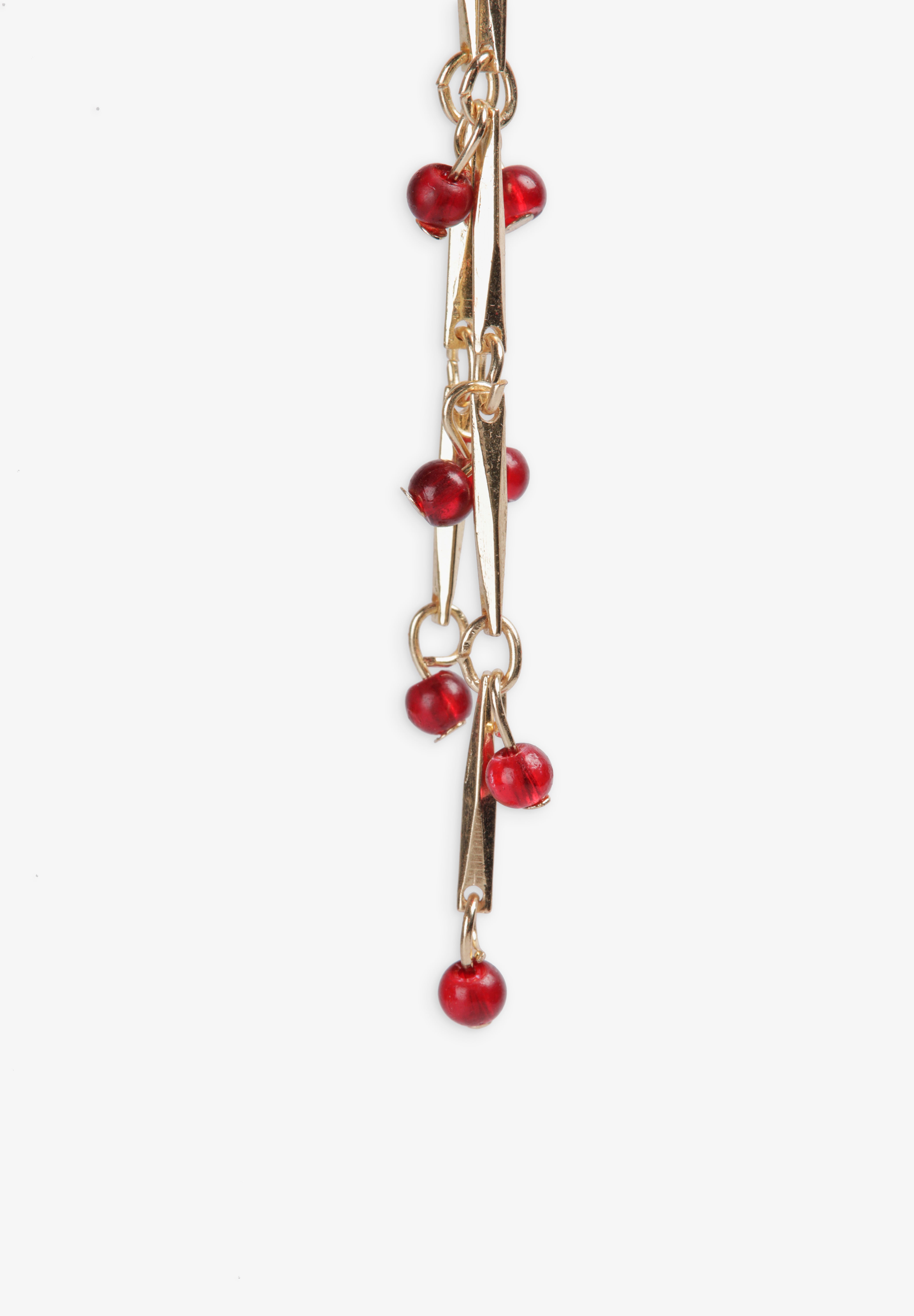 Pendientes largos efecto lagrima con cadena dorada y pequeñas cuentas color burdeos.