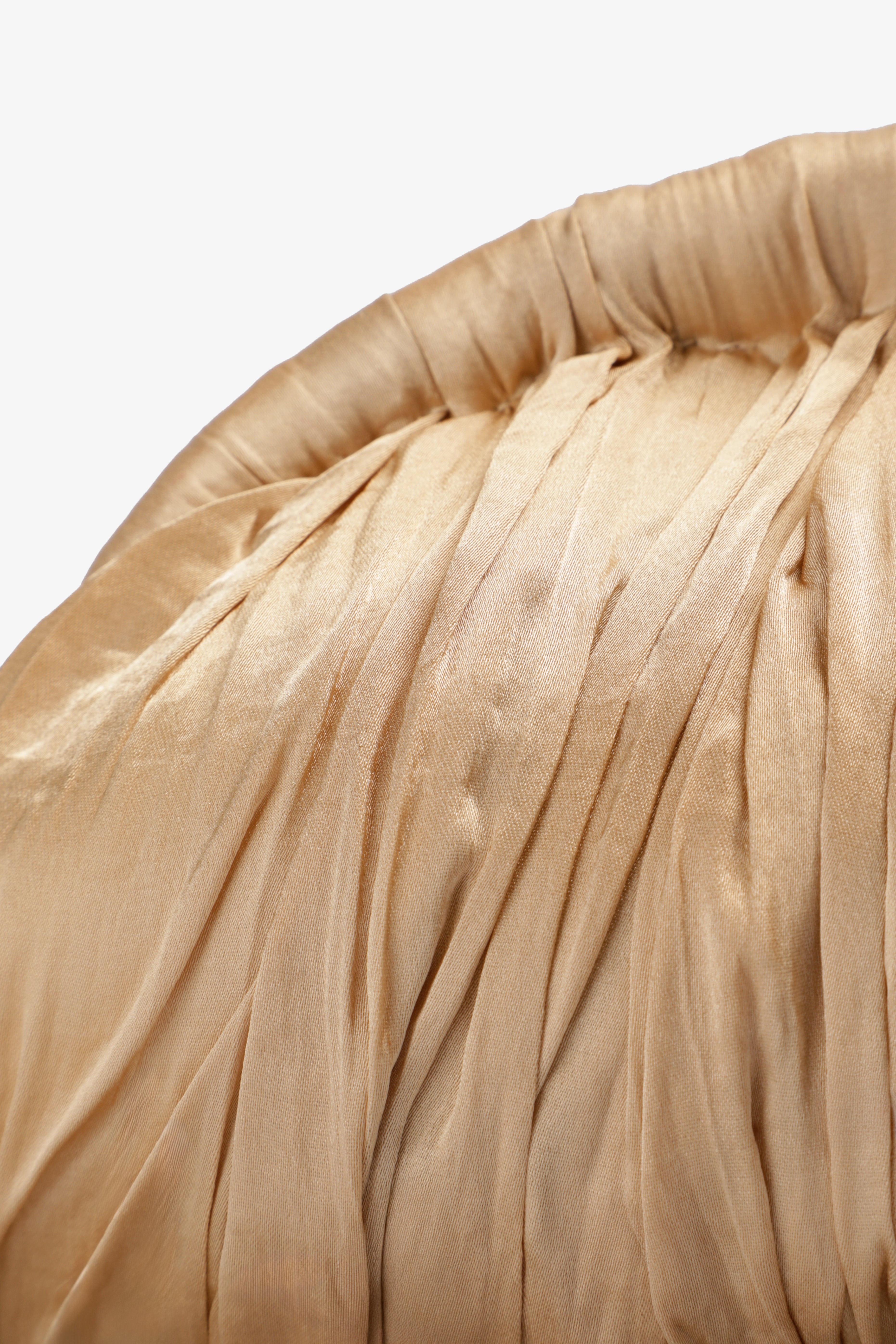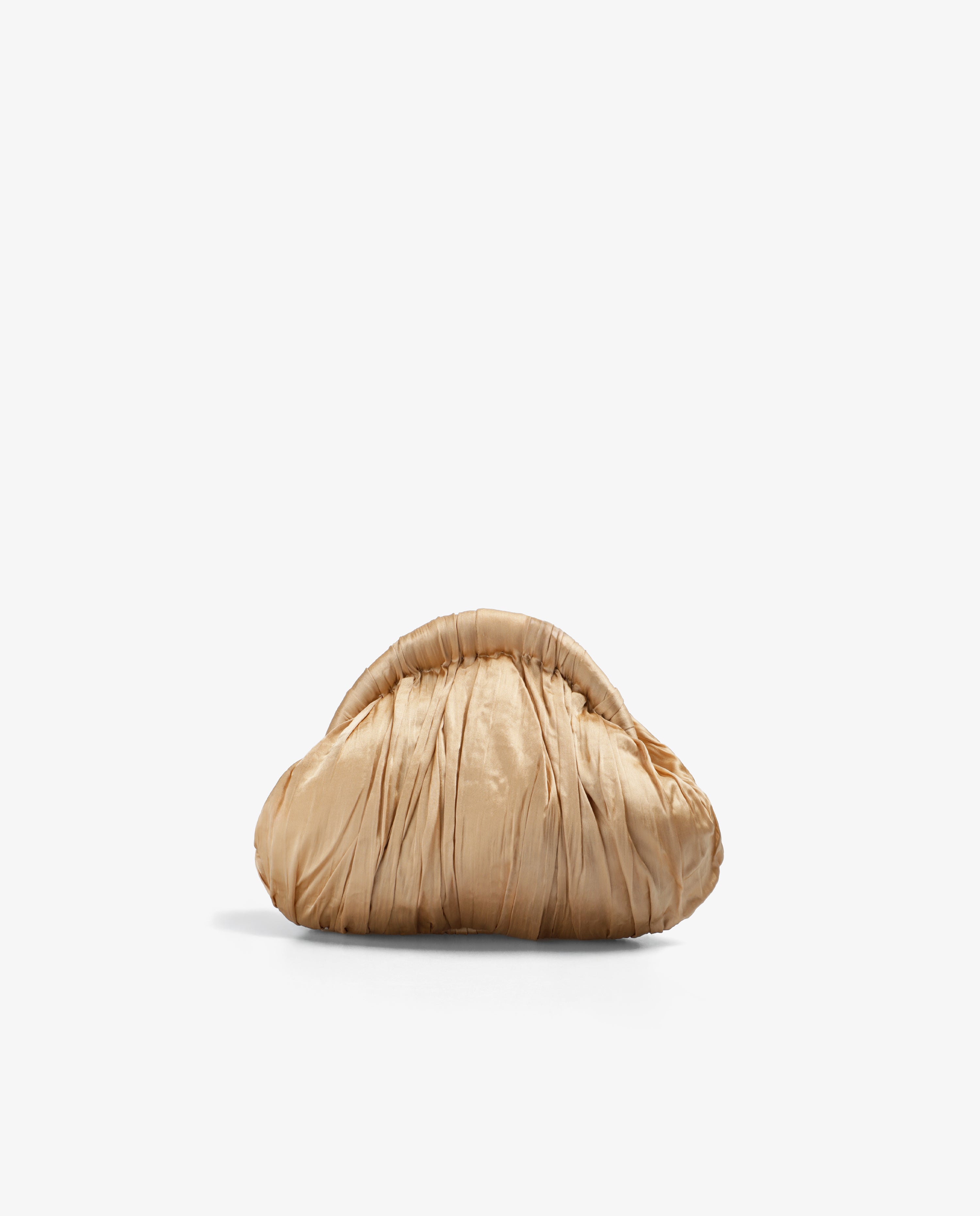 Bolso de mano estilo clutch de tela satinada y texturizada en color dorado.