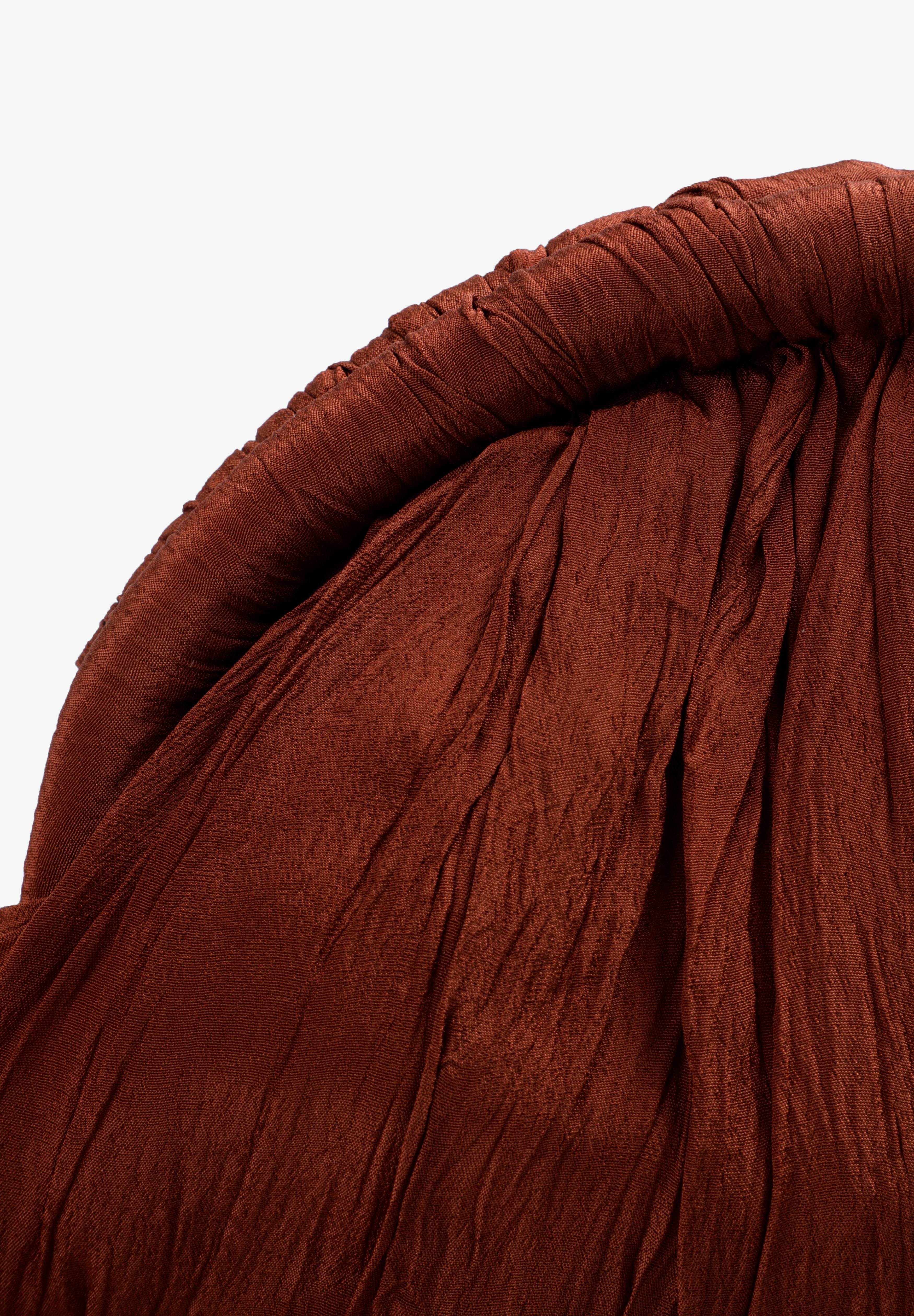 Bolso de mano estilo clutch de tela satinada y texturizada en color teja.