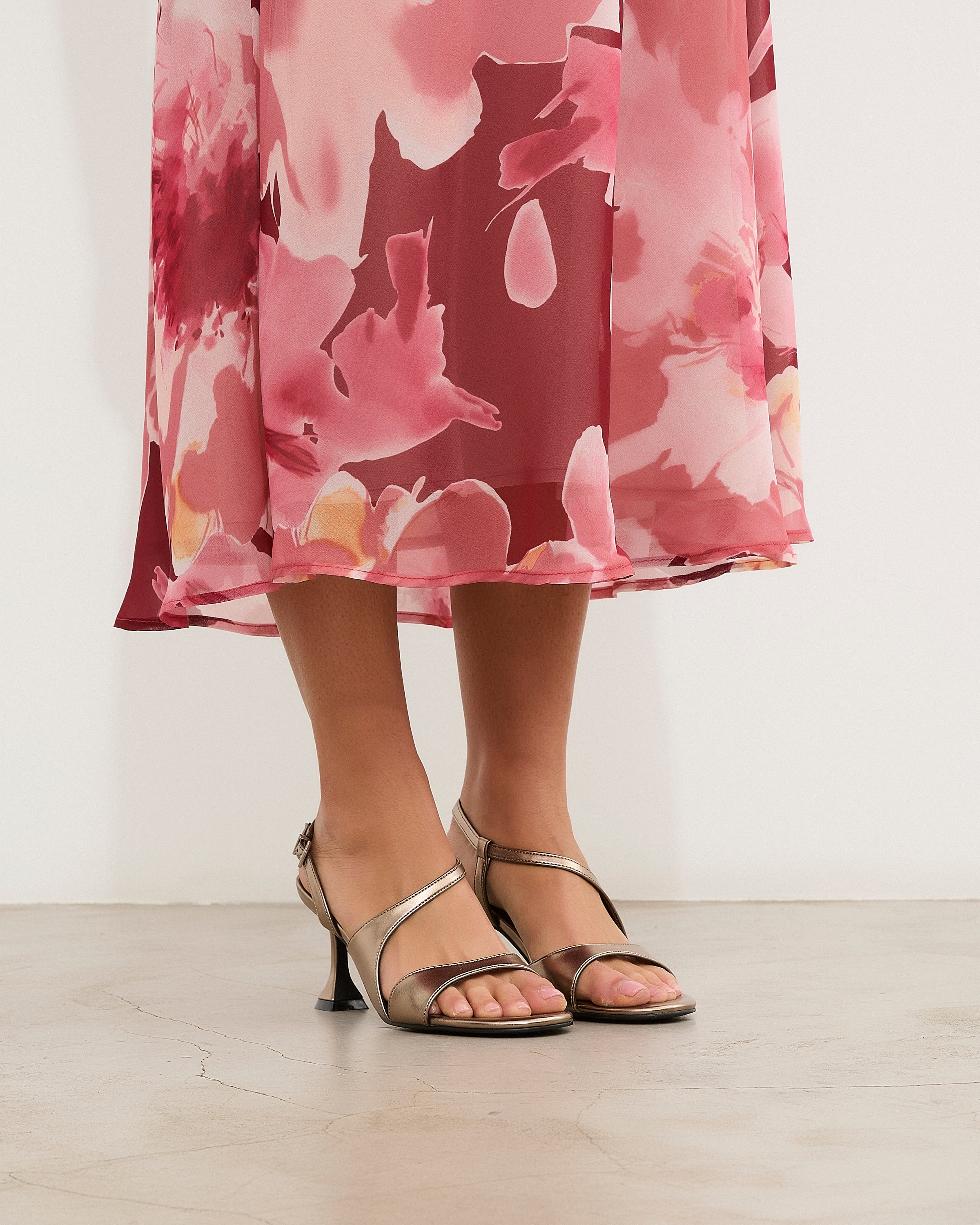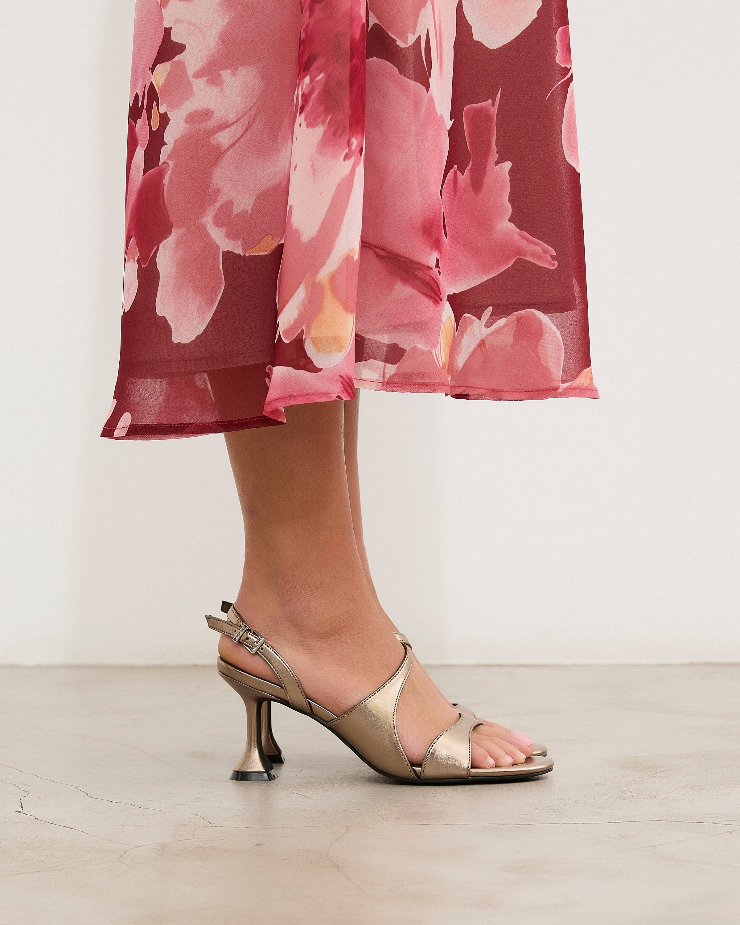 Sandalia de tacón en color metalizado con puntera redonda y tacón de aguja de base ancha. Parte superior compuesta por tira una tira frontar y otra tira cruzada para sujección en tobilla y cierre trasero con hebilla.