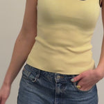 Top de punto en color amarillo. Escote redondo y tirantes anchos con vivo a contraste. Detalle de tirante cruzado en cuello.