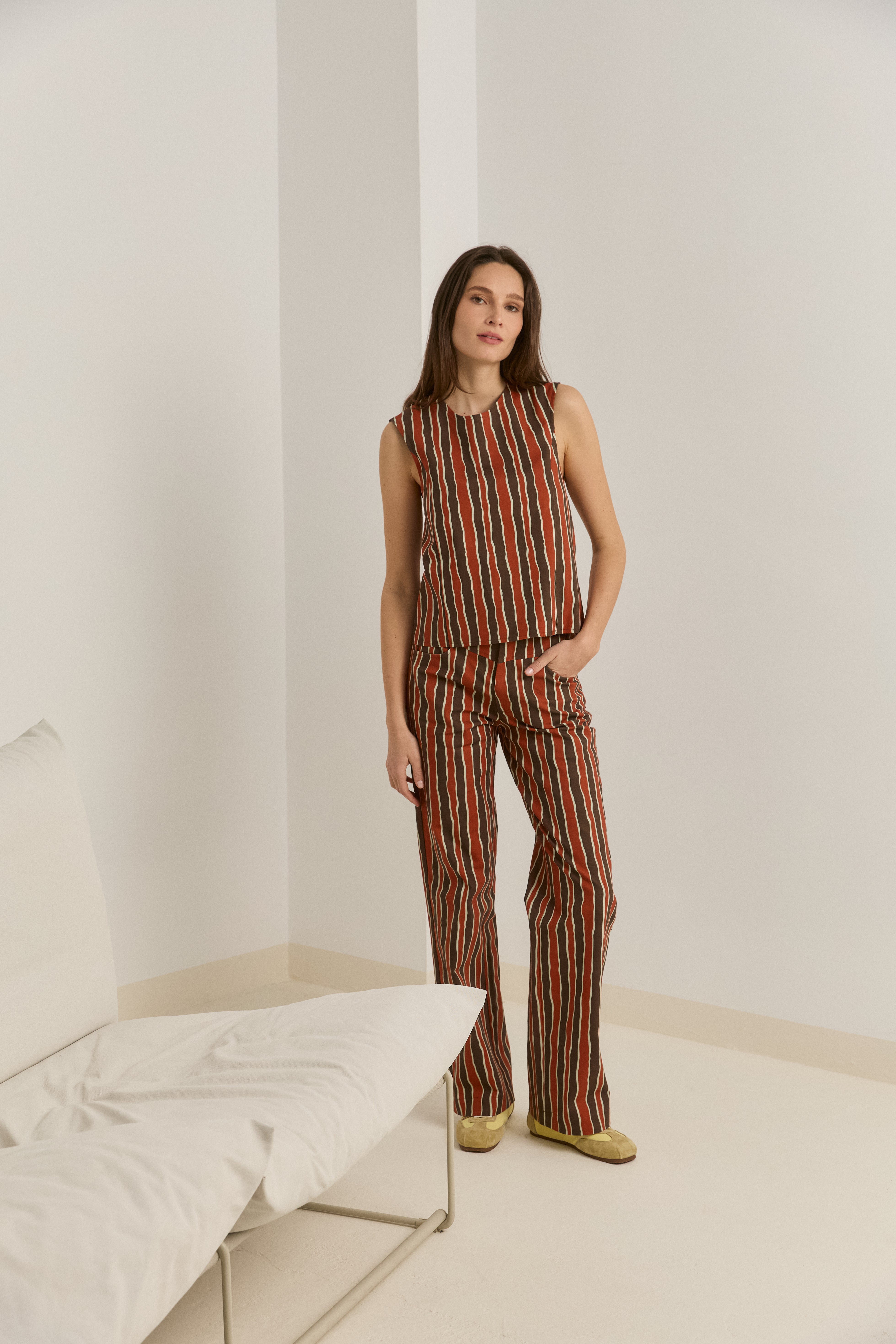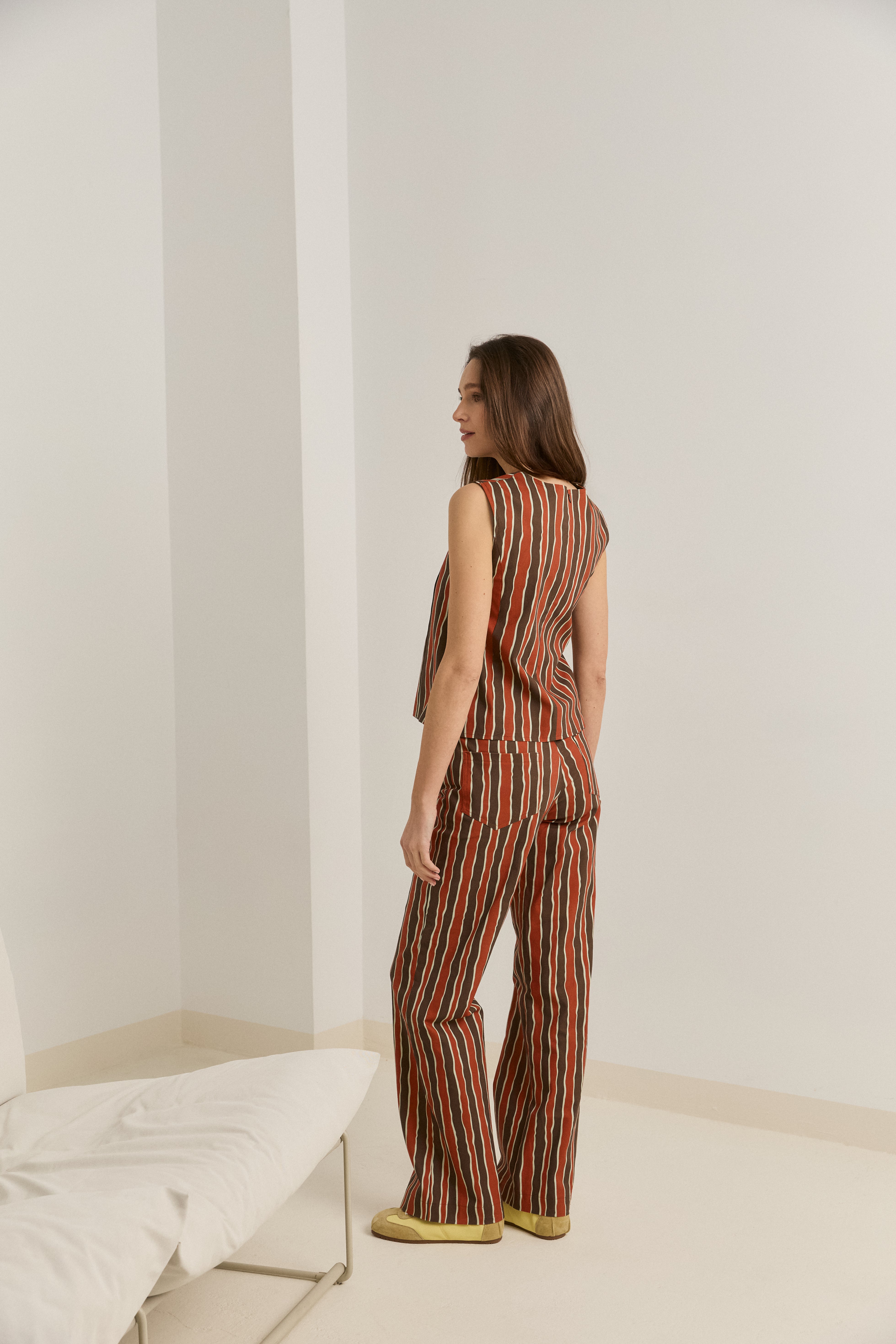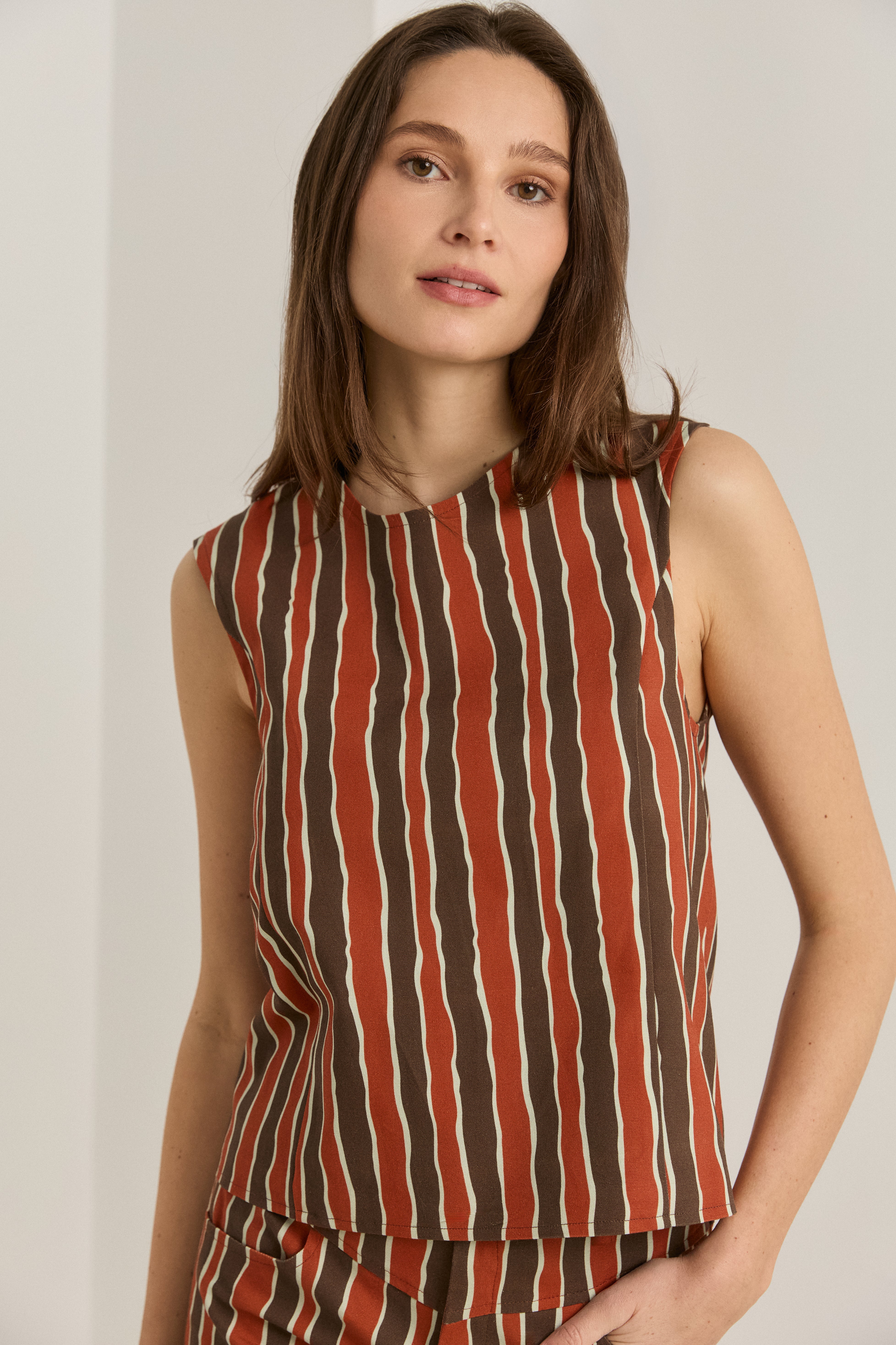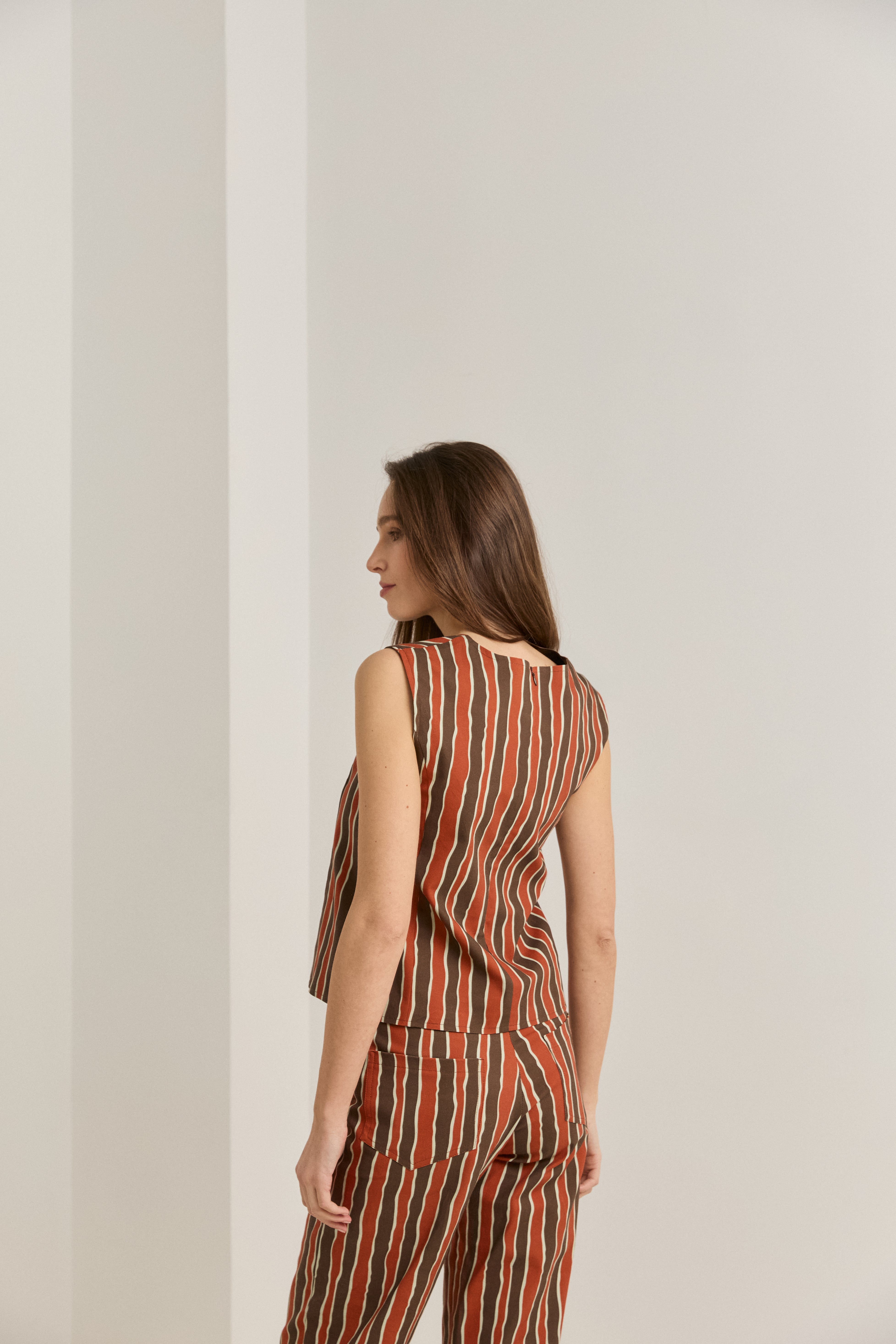 Top sin mangas de rayas bicolor entonos tierra. Cremallera trasera para cierre.